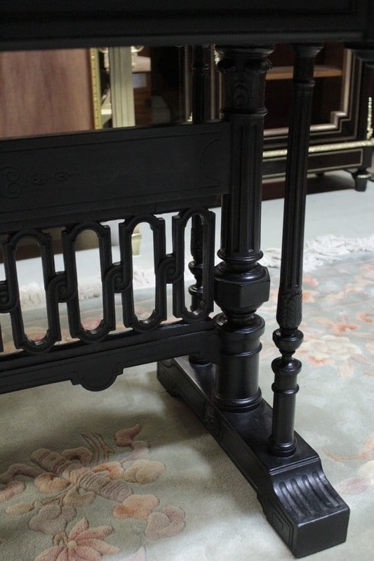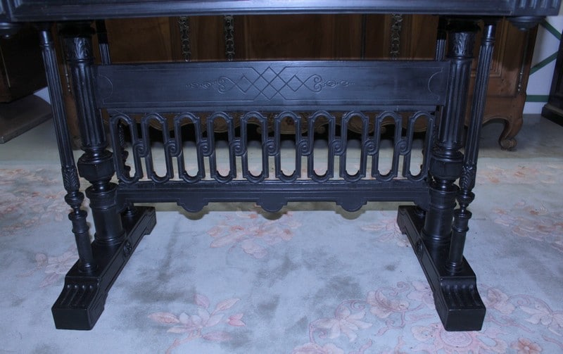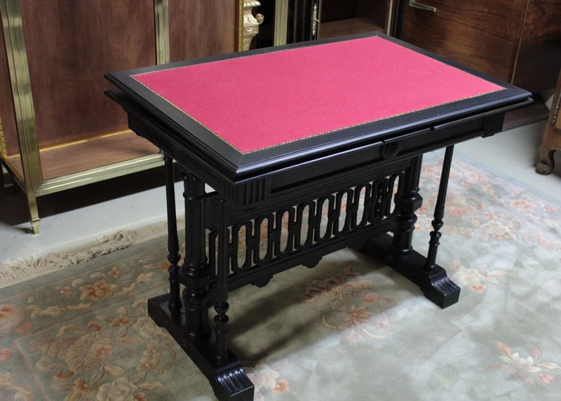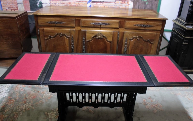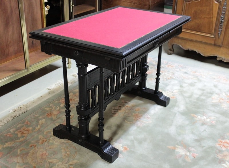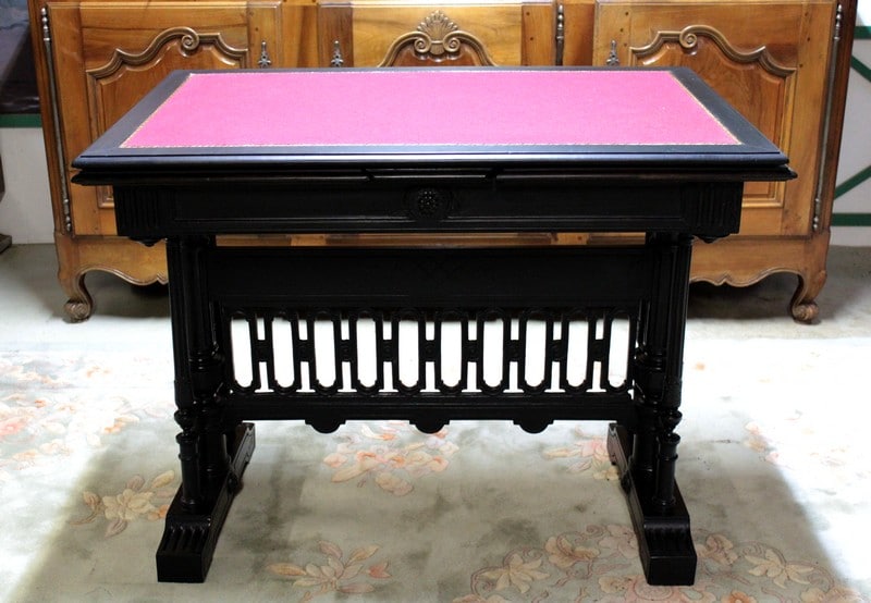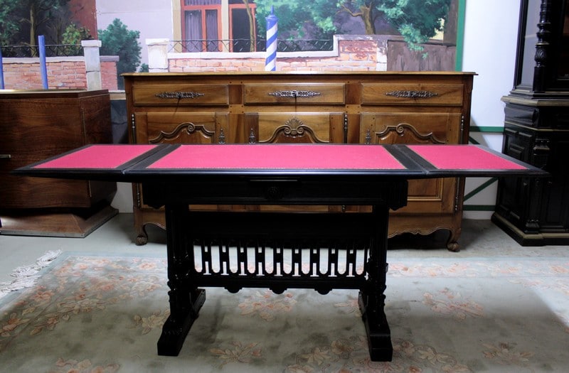 Table à jeux dans le goût gothique en hêtre et poirier noircis du début XXe (1910/1920). Elle possède deux allonges de 41,5cm. Le feutre rouge et la vignette ont été changés.
