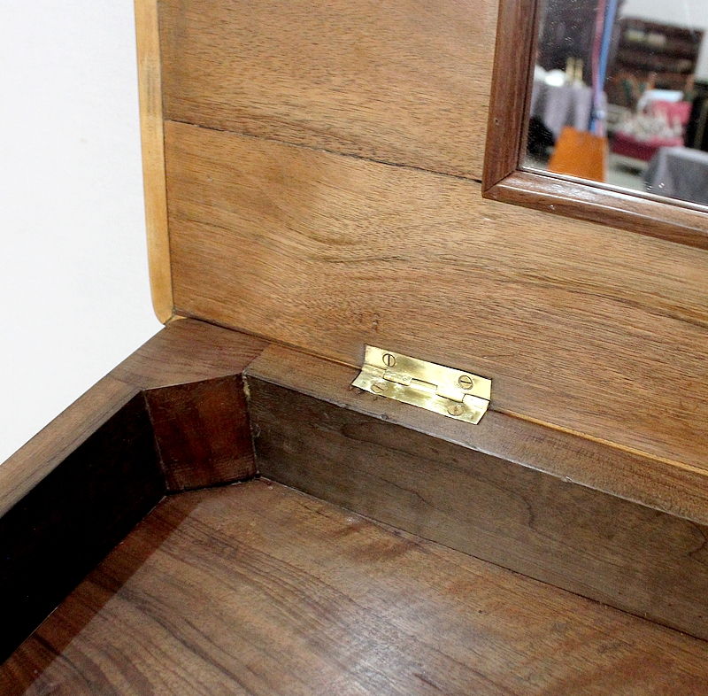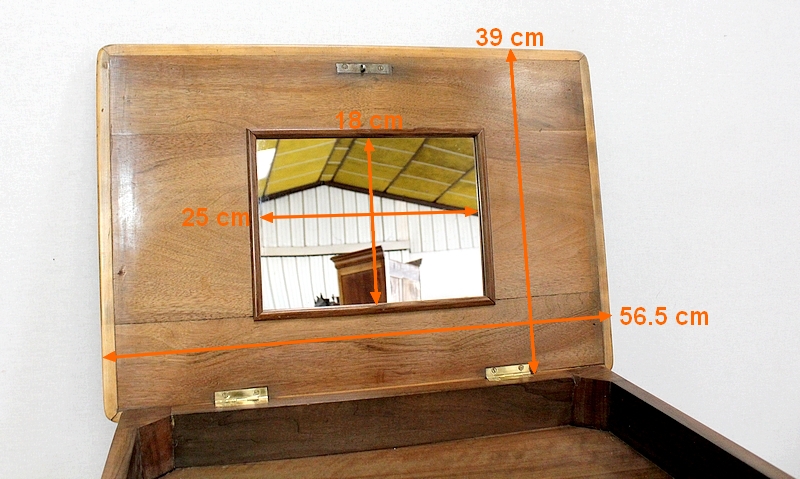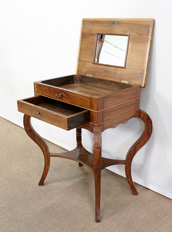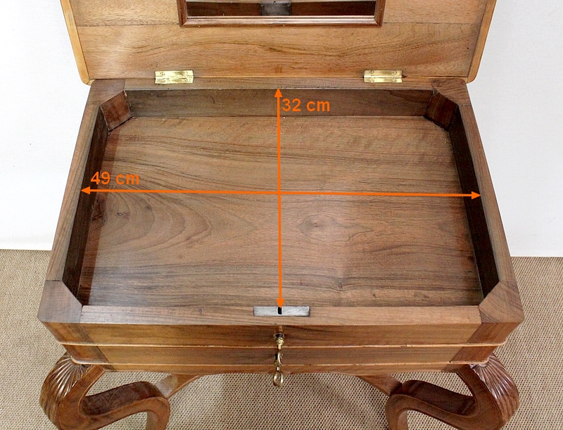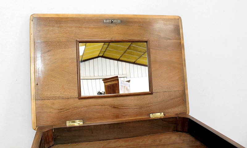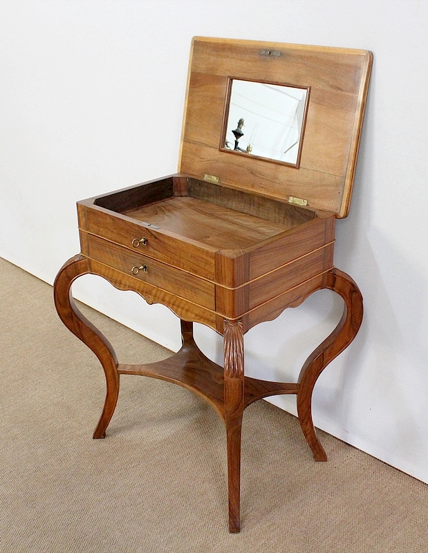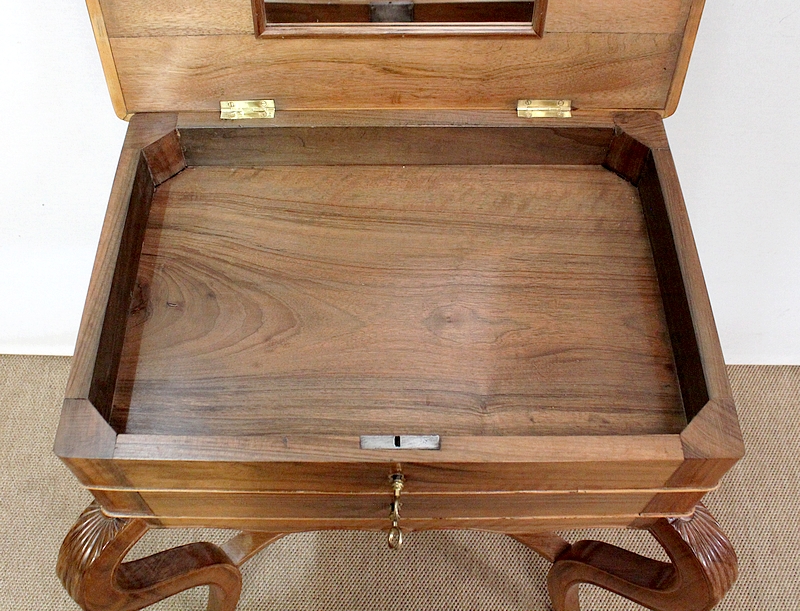 Ravissante table travailleuse entièrement en noyer blond ouvrant sur le dessus par un abattant muni en son centre d’un miroir encadré de baguettes et découvrant un espace de rangement conséquent. Cet abattant se ferme par une serrure d’origine en état de fonctionnement accompagnée de sa clé.