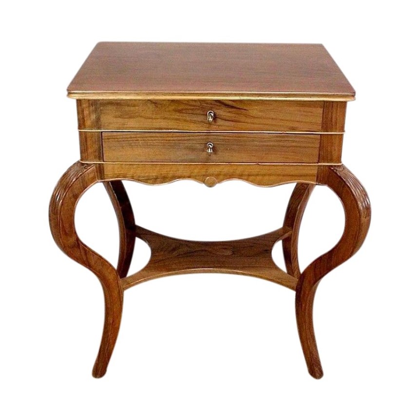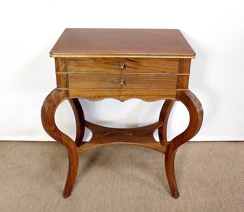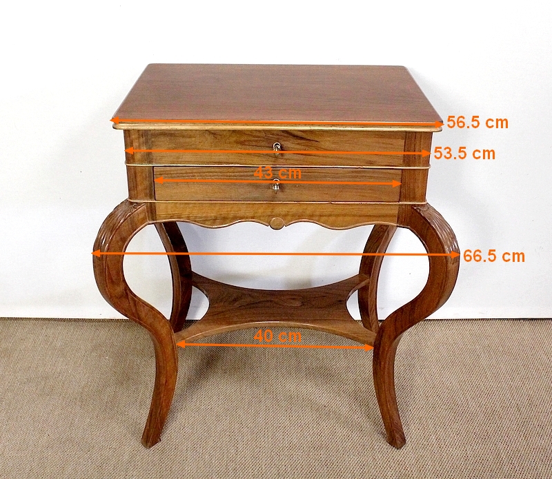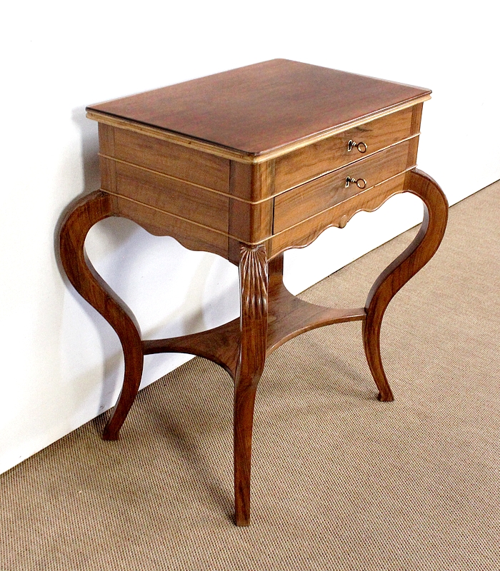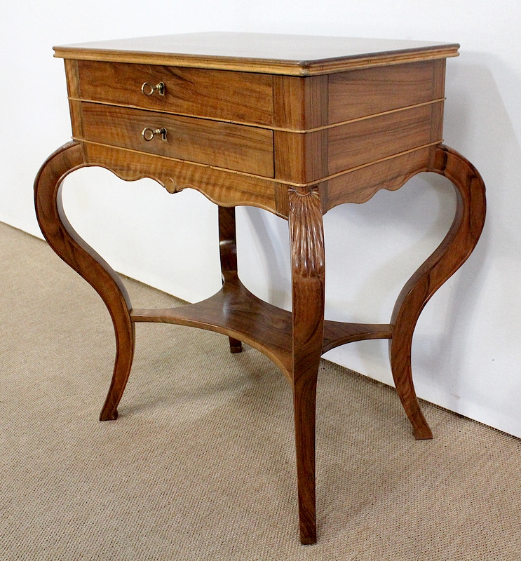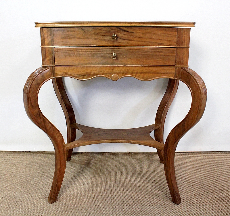 Ravissante table travailleuse entièrement en noyer blond ouvrant sur le dessus par un abattant muni en son centre d’un miroir encadré de baguettes et découvrant un espace de rangement conséquent. Cet abattant se ferme par une serrure d’origine en état de fonctionnement accompagnée de sa clé.