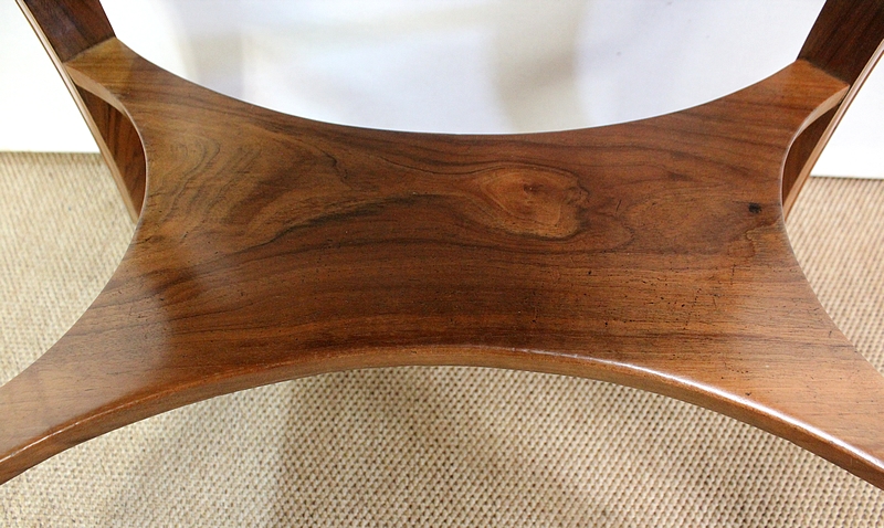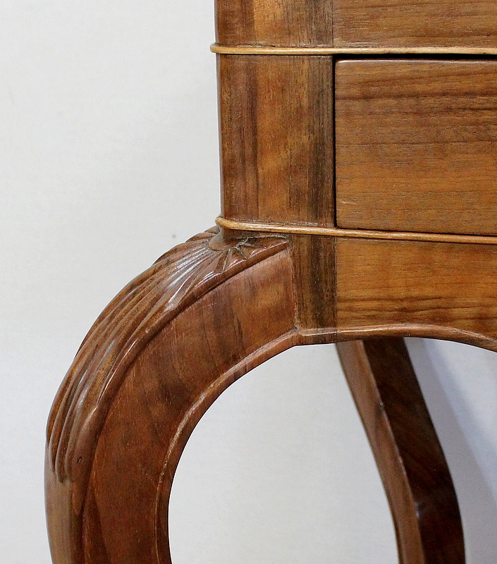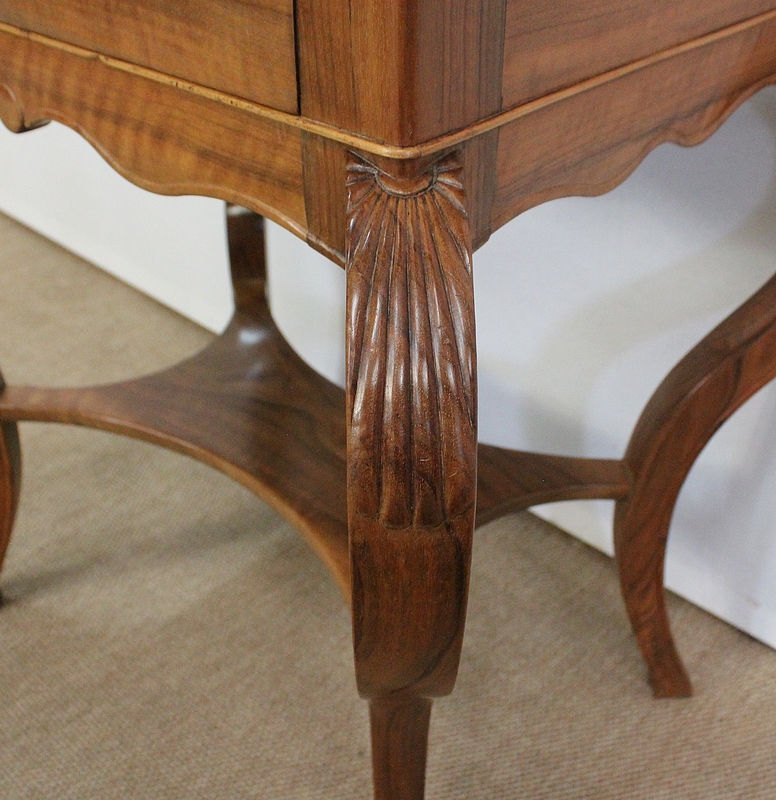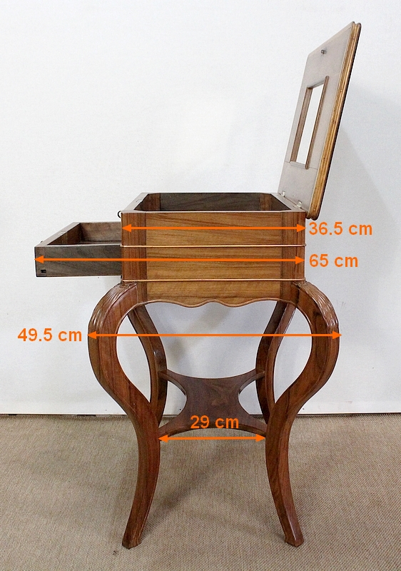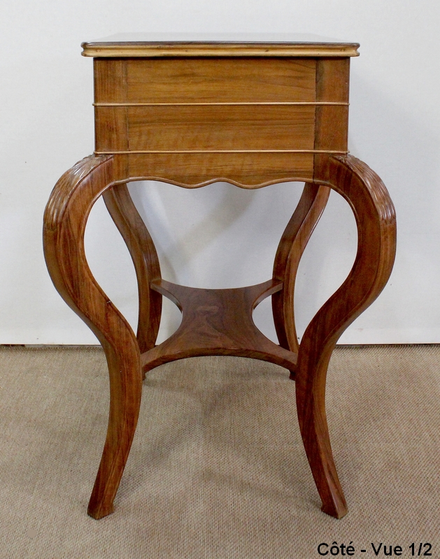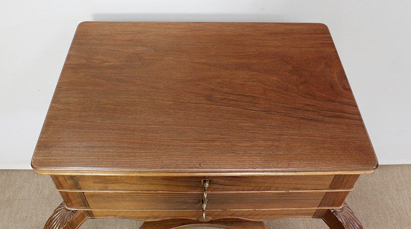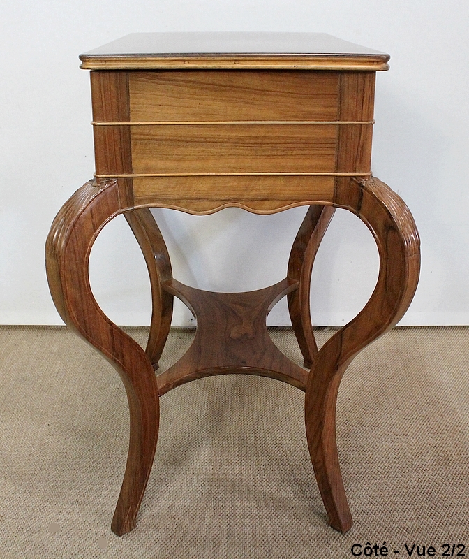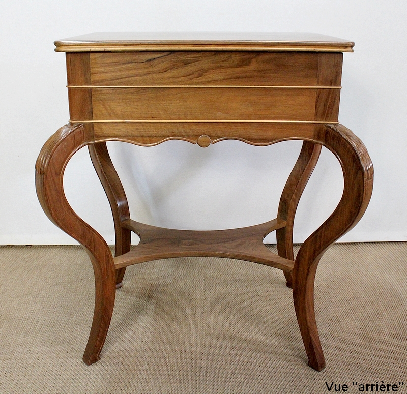 L’ensemble de cette travailleuse est agrémenté de légères baguettes sur toutes les faces et repose sur quatre pieds excessivement cambrés en noyer massif à défoncement sur les côtés, sculptés de sillons en partie haute.