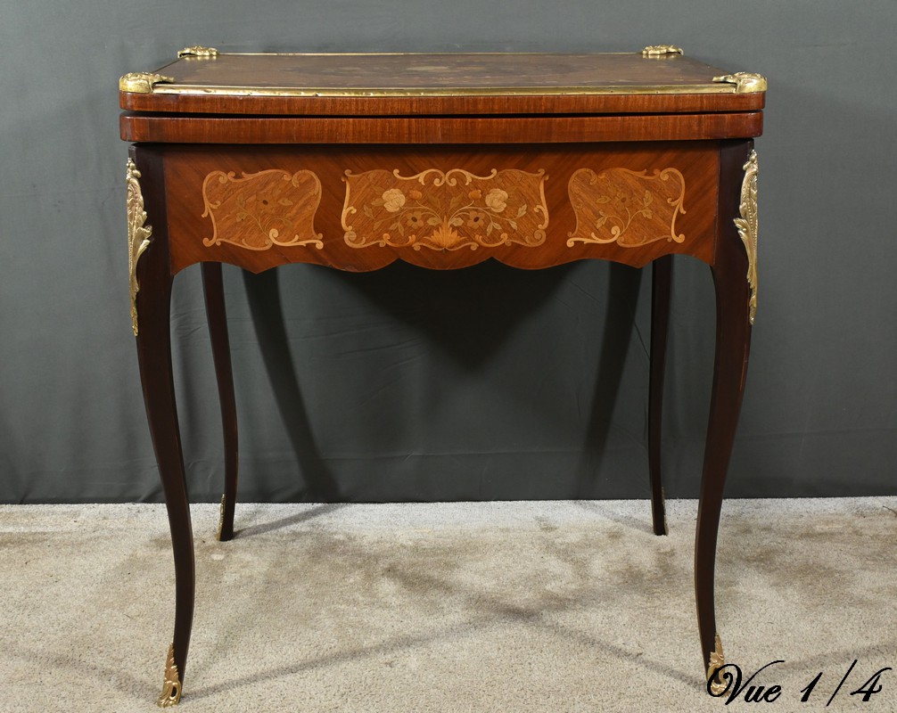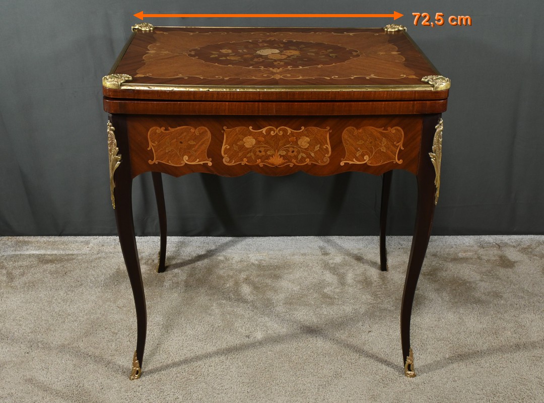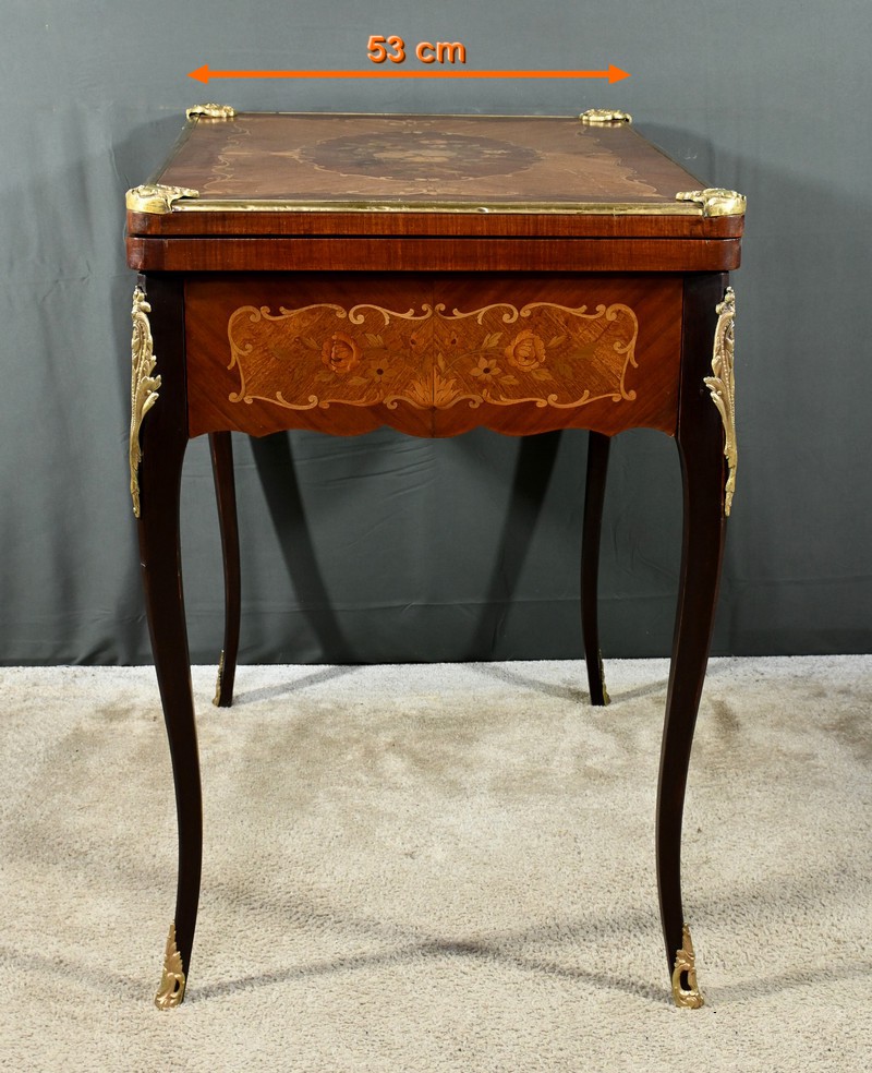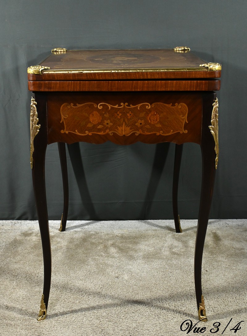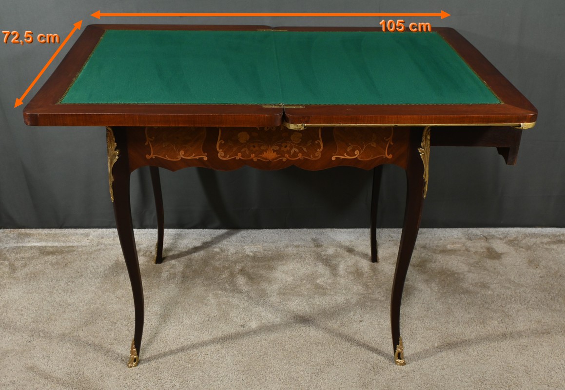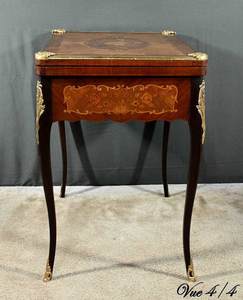 Son plateau, magnifiquement orné de marqueterie à décor de fleurs, est souligné par une lingotière et des motifs d’angle en bronze, ajoutant une touche d’élégance et de raffinement. En se dépliant, le plateau révèle une table de jeux habillée d’une feutrine verte et de galons, parfaite pour des soirées de jeux conviviales.