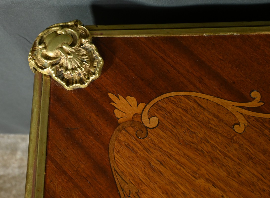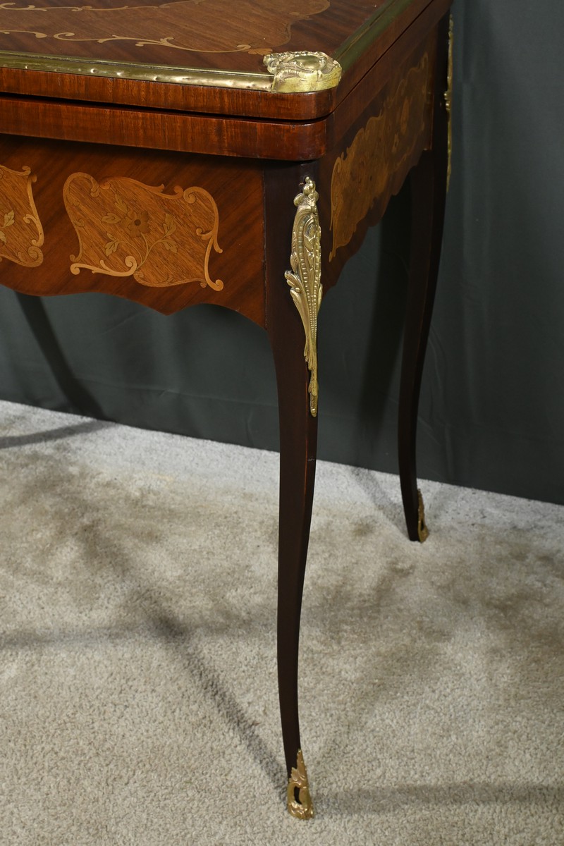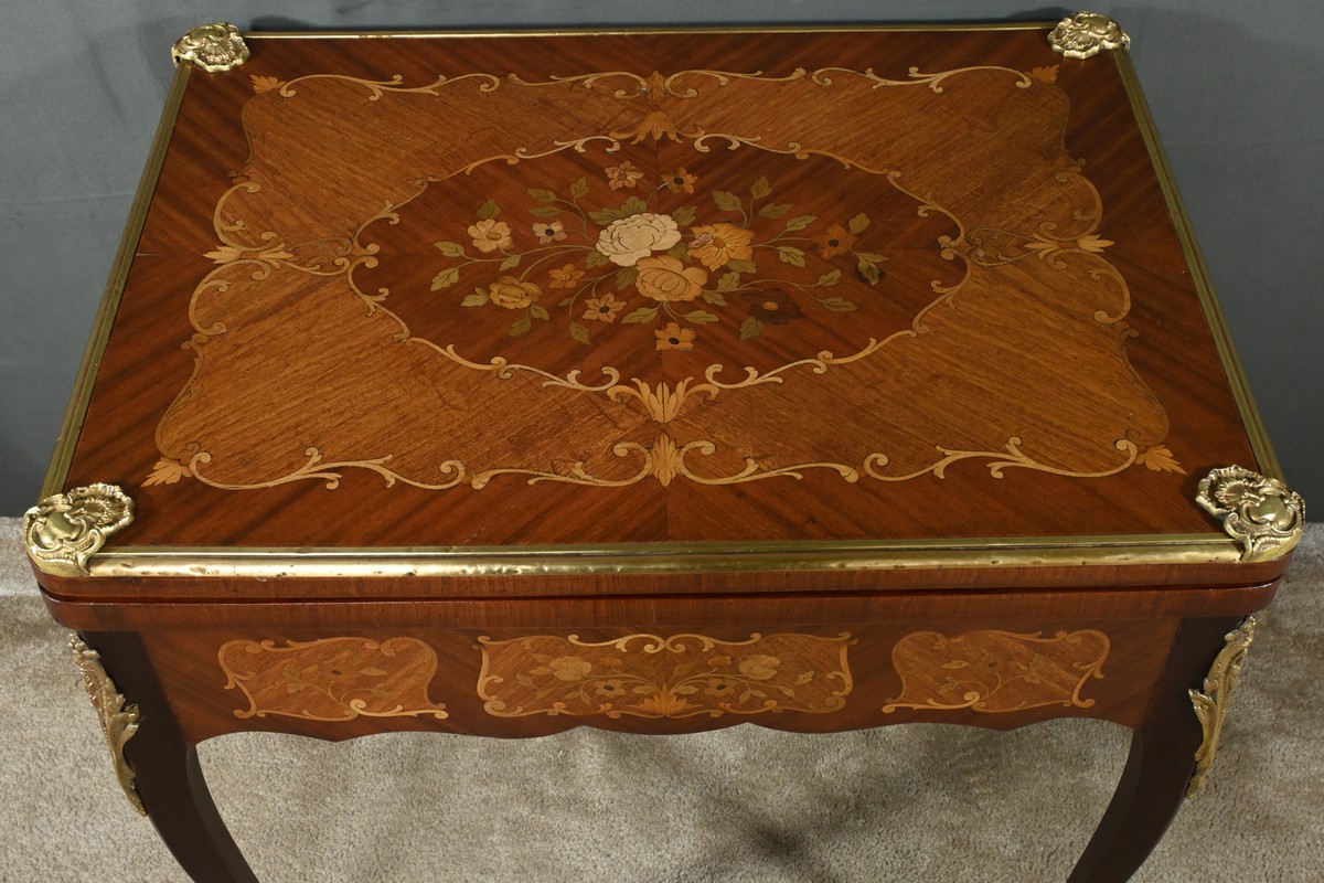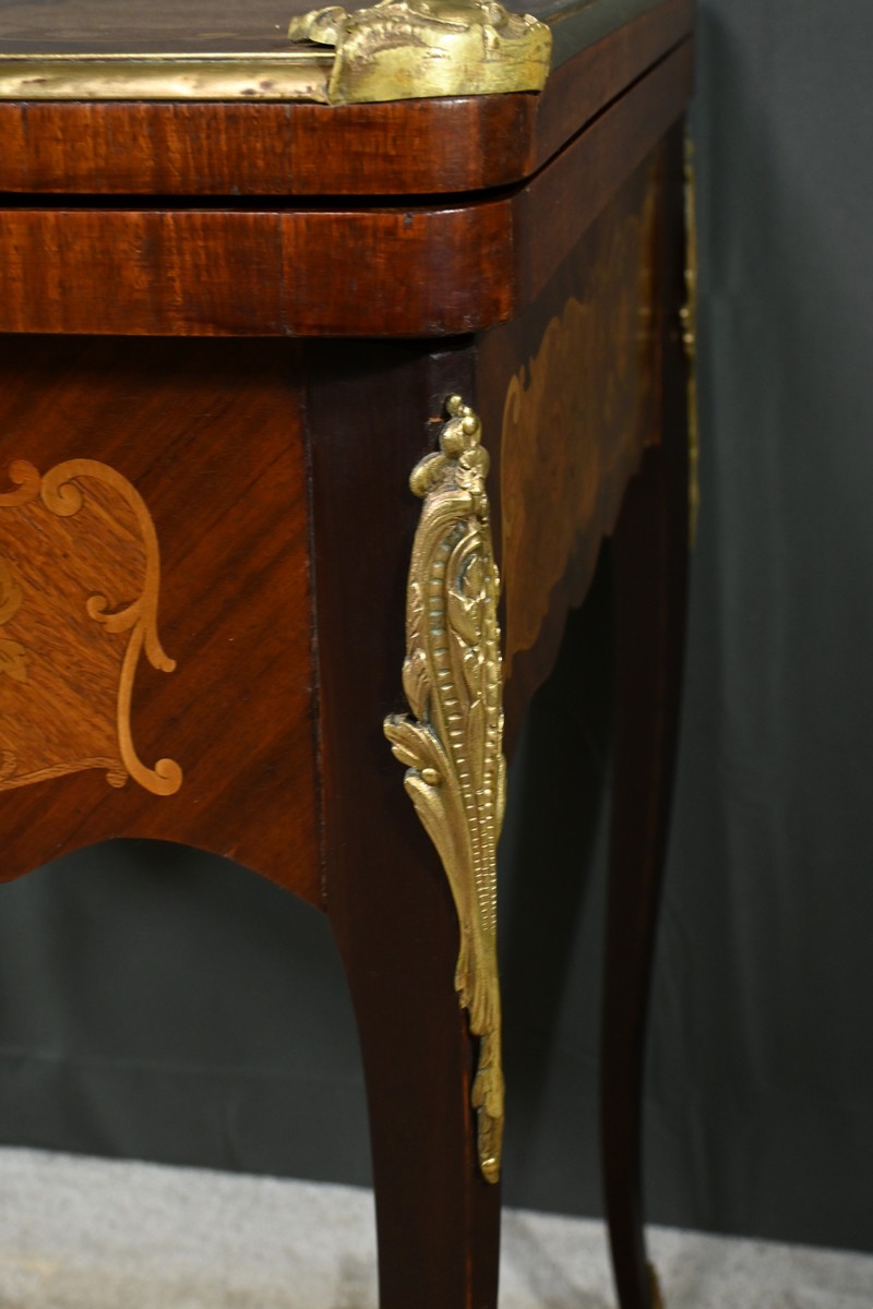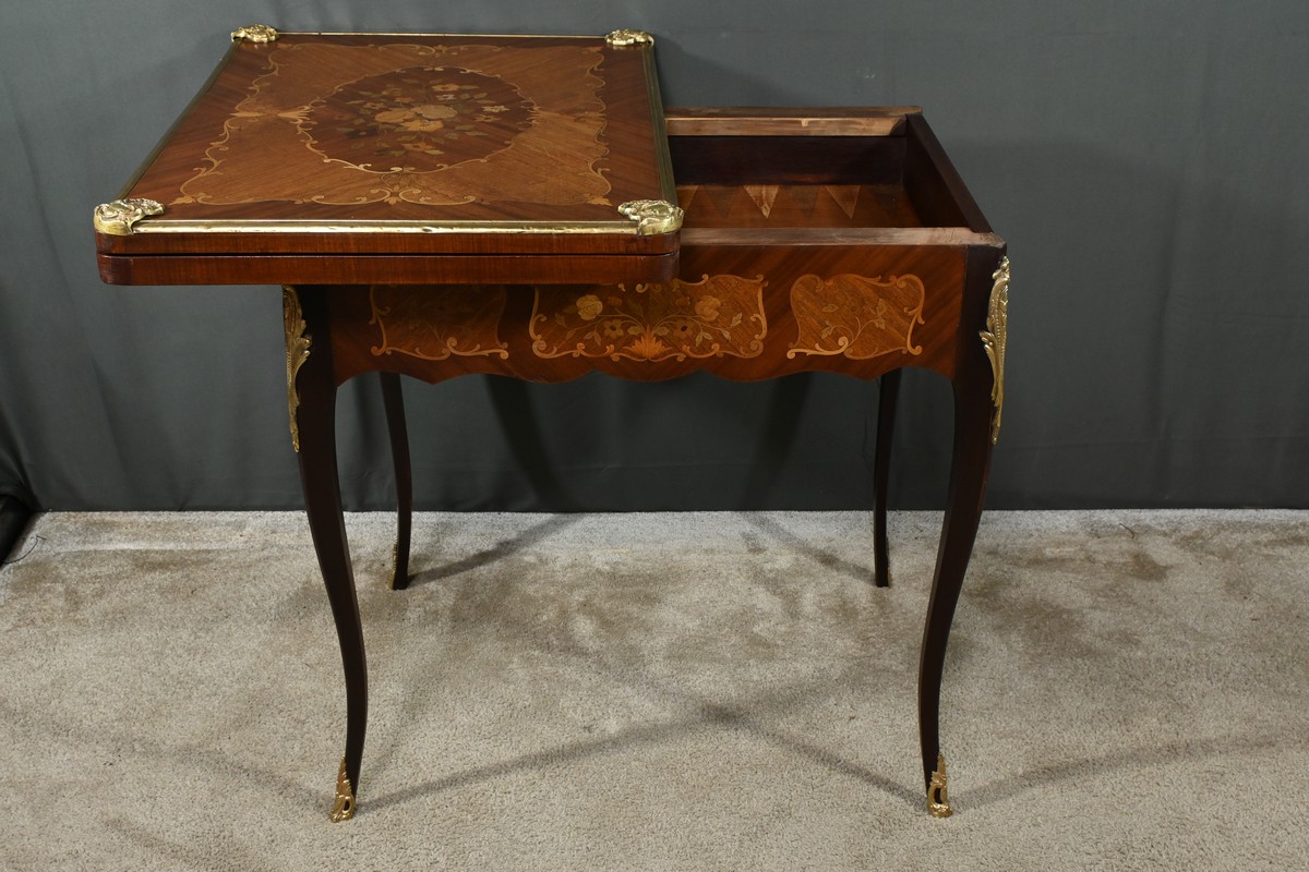 Son plateau, magnifiquement orné de marqueterie à décor de fleurs, est souligné par une lingotière et des motifs d’angle en bronze, ajoutant une touche d’élégance et de raffinement. En se dépliant, le plateau révèle une table de jeux habillée d’une feutrine verte et de galons, parfaite pour des soirées de jeux conviviales.