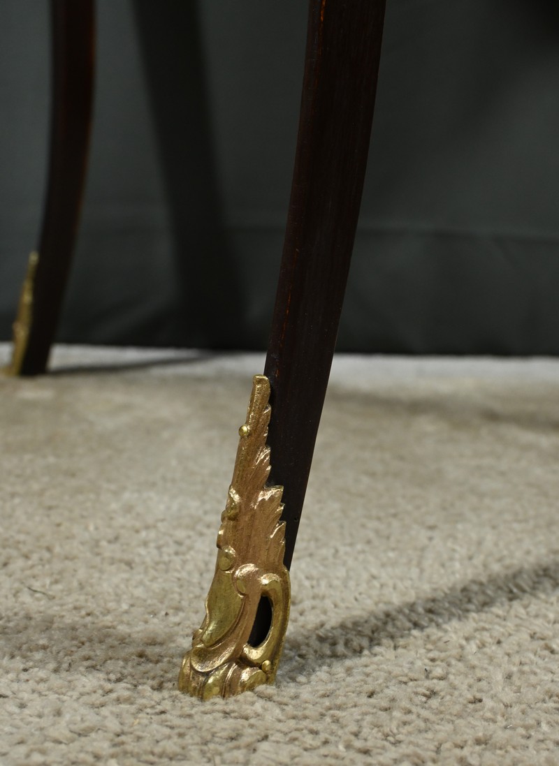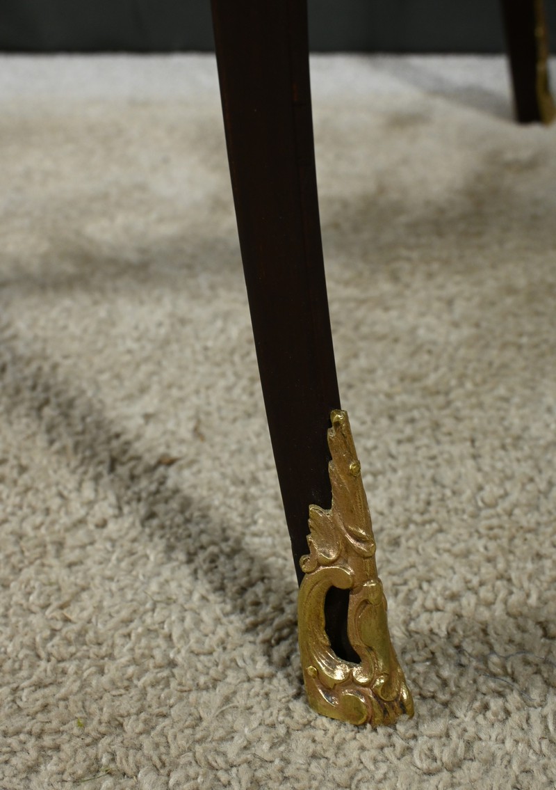 L’ensemble repose sur des pieds légèrement galbés, ornés de chutes et de sabots en bronze, qui ajoutent une touche de sophistication et de stabilité à la structure.