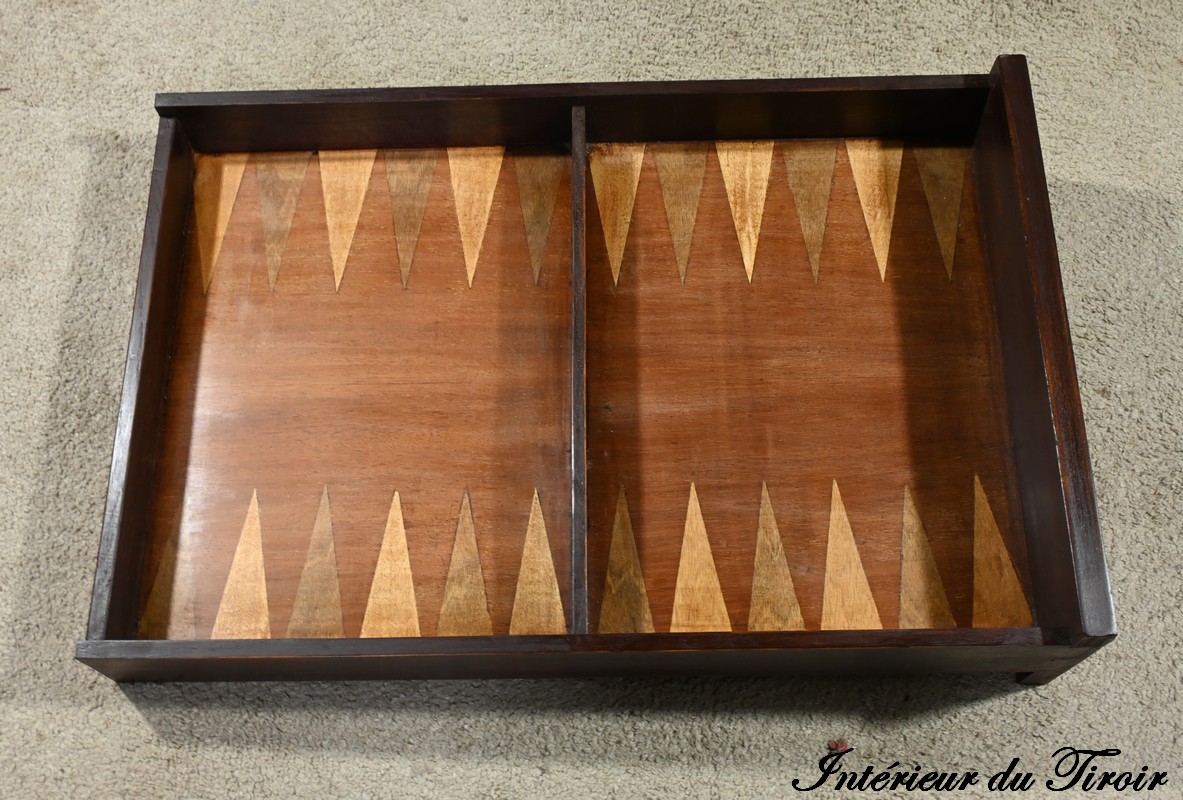 La ceinture, travaillée avec le même souci du détail, cache un tiroir astucieux contenant un tablier de trictrac, offrant ainsi une solution de rangement pratique et discrète.