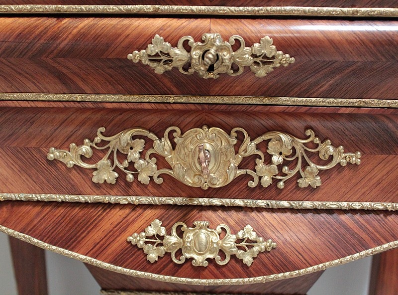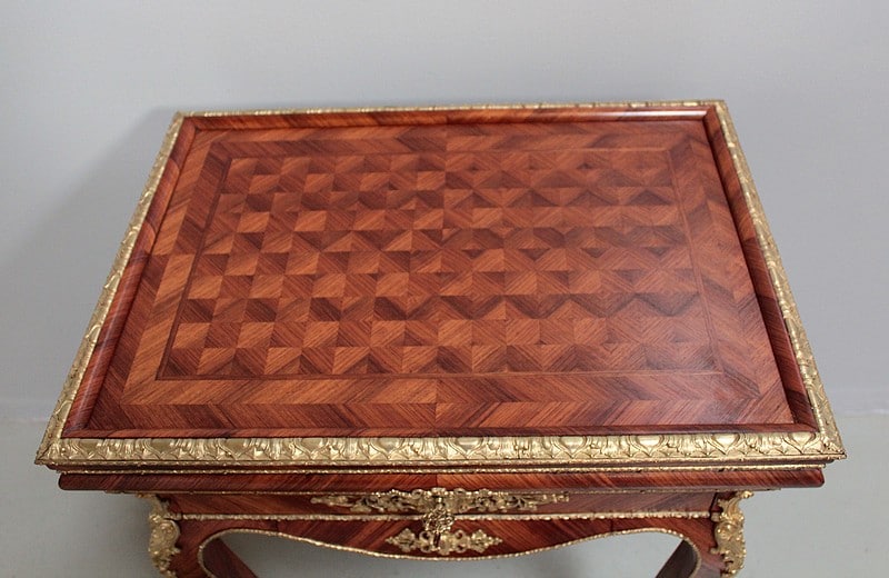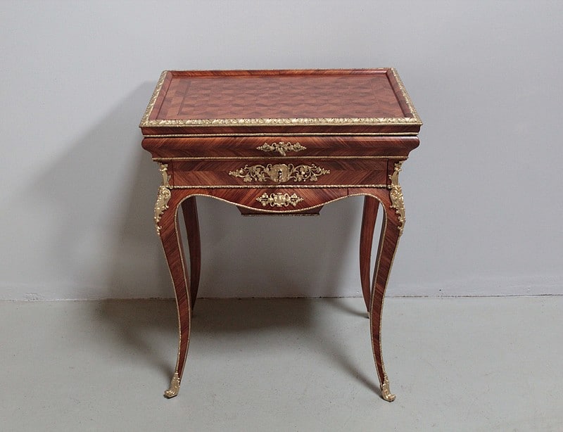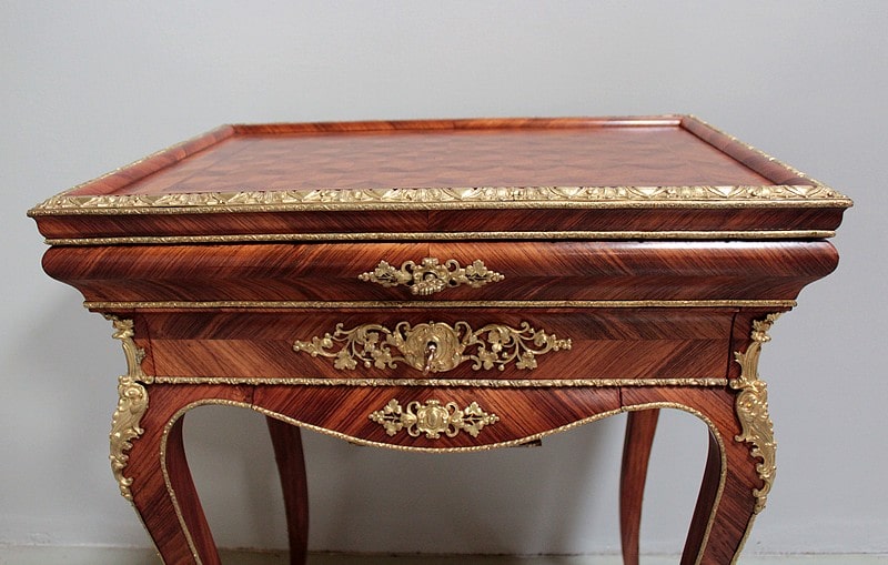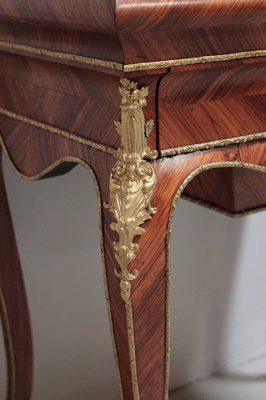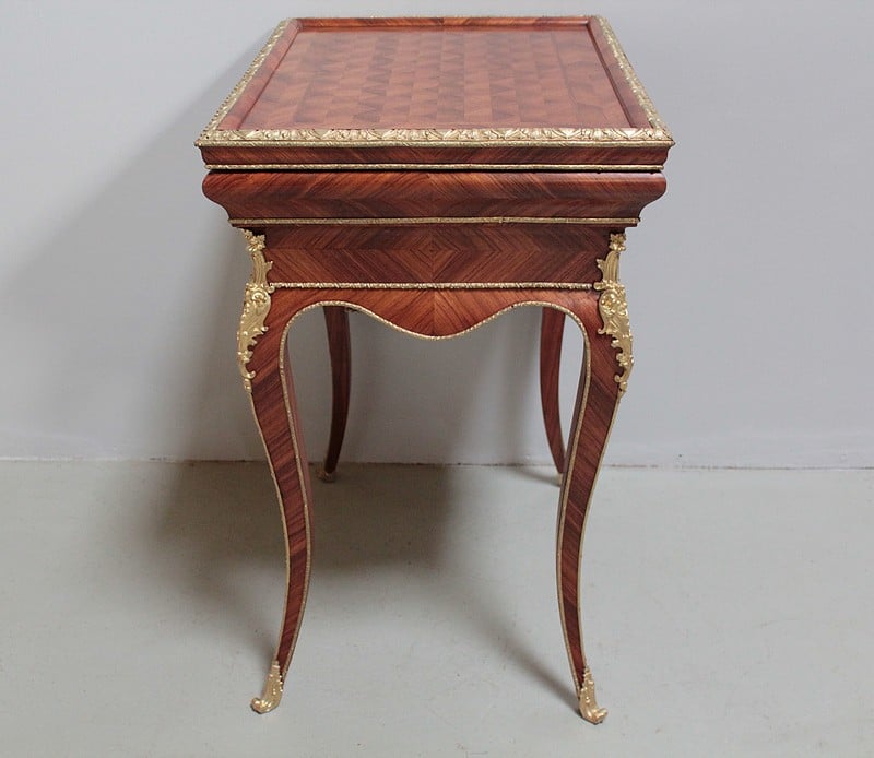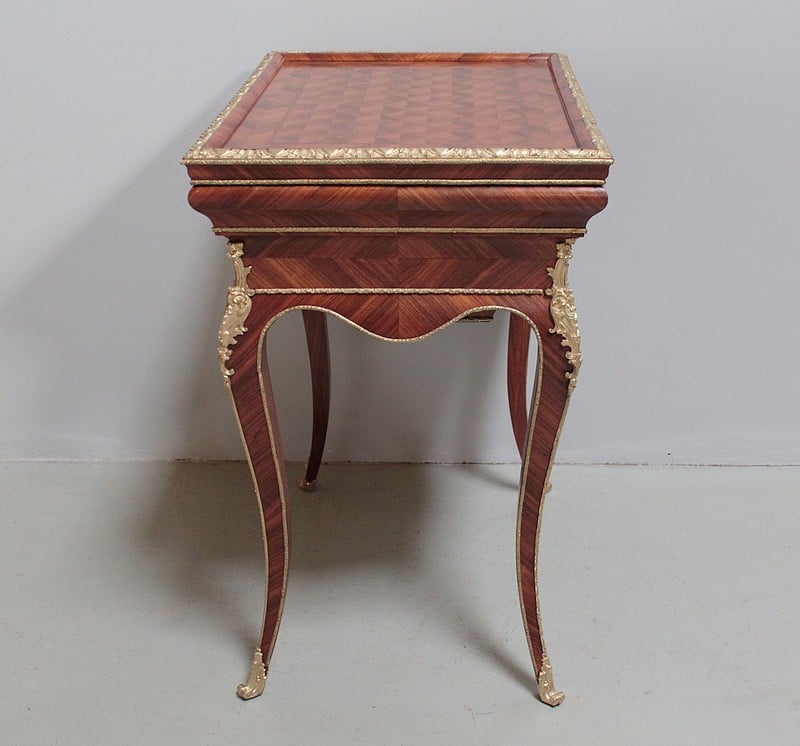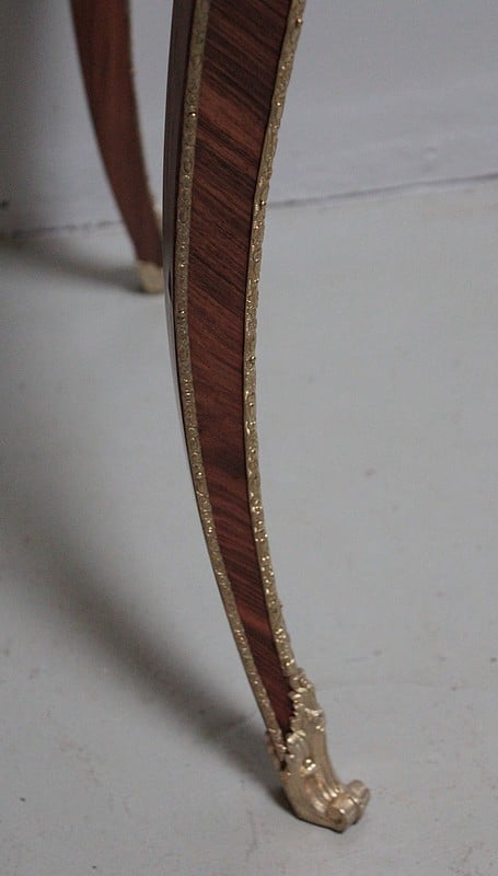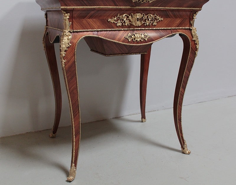 Table-Travailleuse en placage de palissandre avec nombreuses garnitures feuillagées en bronze, reposant sur 4 pieds galbés ornés de chutes et de sabots en bronze.
