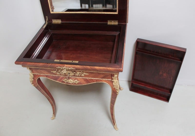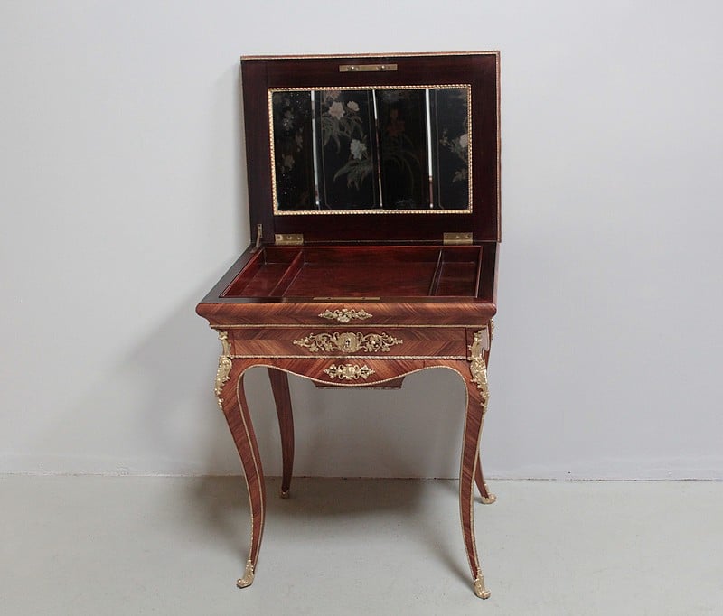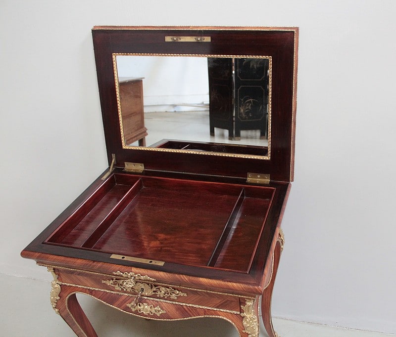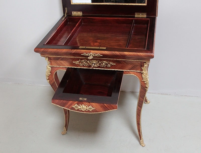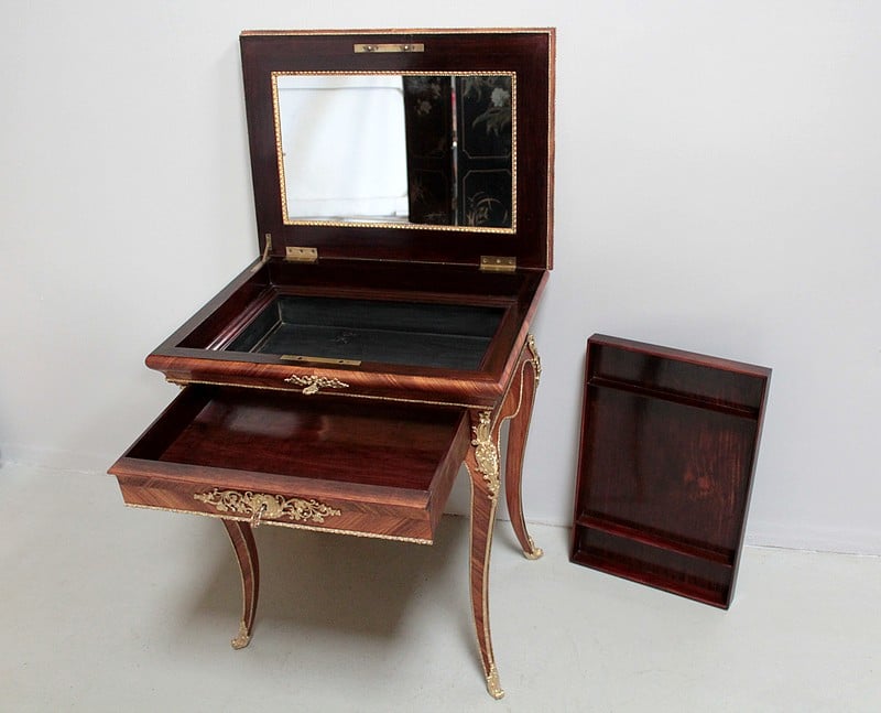 Son dessus marqueté se soulève découvrant un miroir et un plateau amovible en acajou à 3 compartiments. Elle ouvre par un tiroir en ceinture et un tiroir en cuvette en-dessous.
