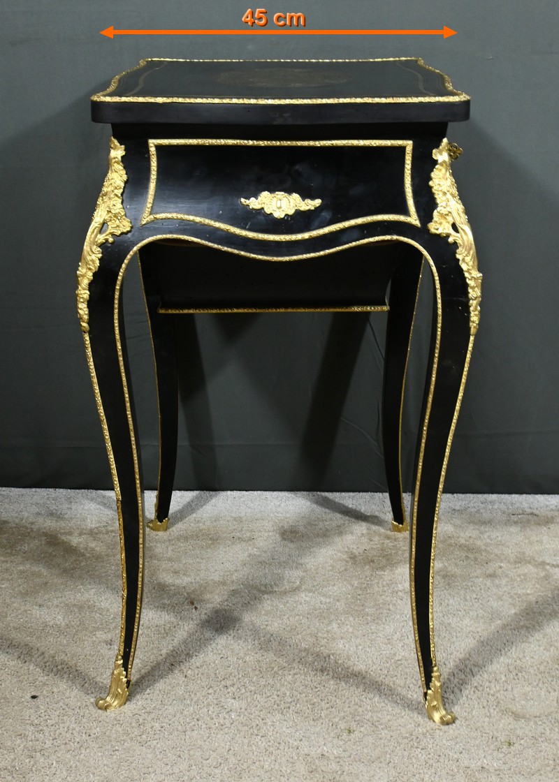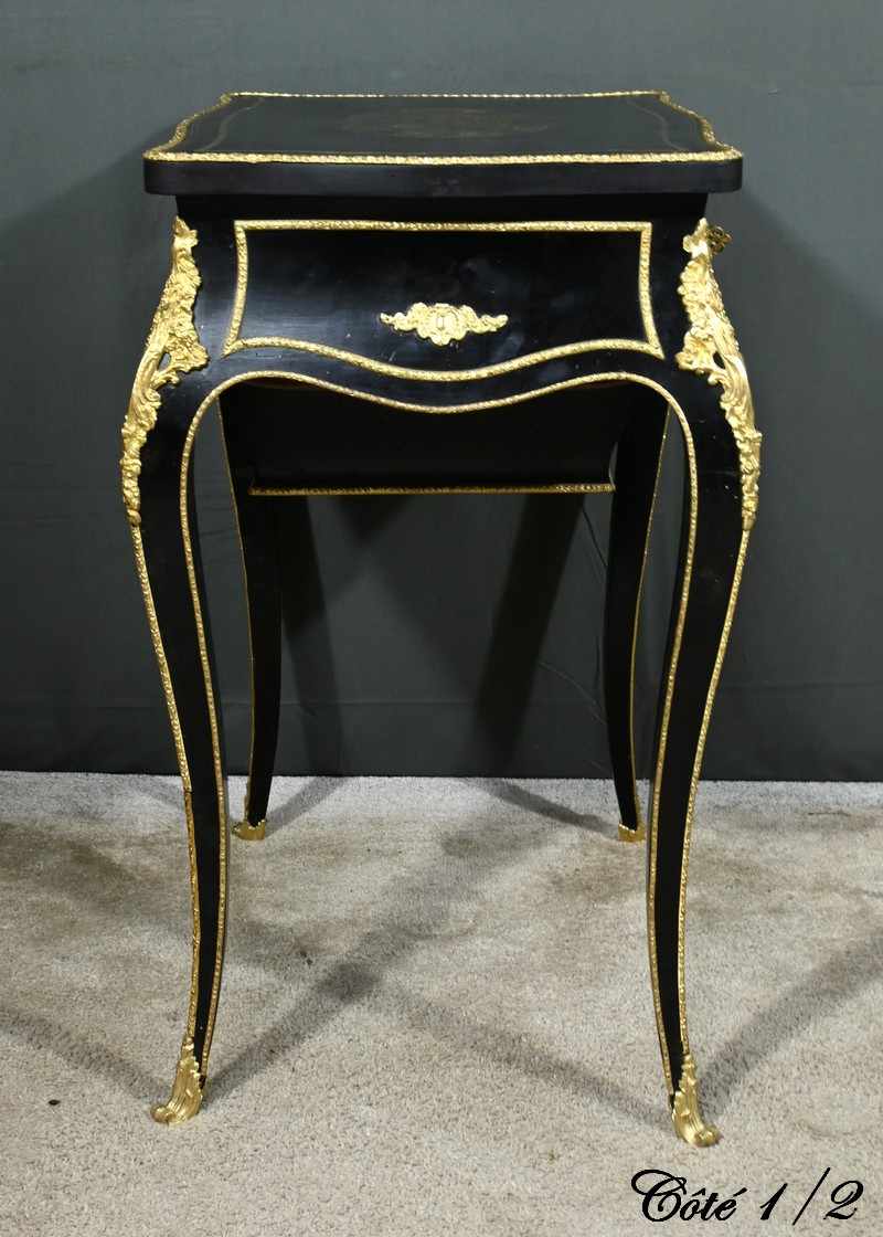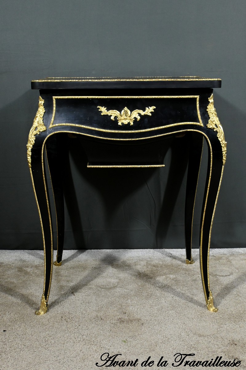 Cette élégante travailleuse en poirier noirci, datant du milieu du XIXe siècle, est un véritable chef-d’œuvre d’ébénisterie.