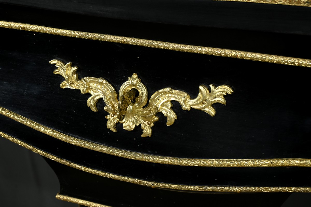 La serrure, à une entrée bronze, permet de sécuriser simultanément tous ces éléments. L’ensemble repose sur quatre pieds galbés avec chutes en bronze, se profilant sur des sabots, ajoutant une touche de sophistication à ce meuble déjà remarquable.