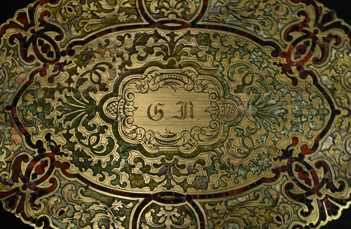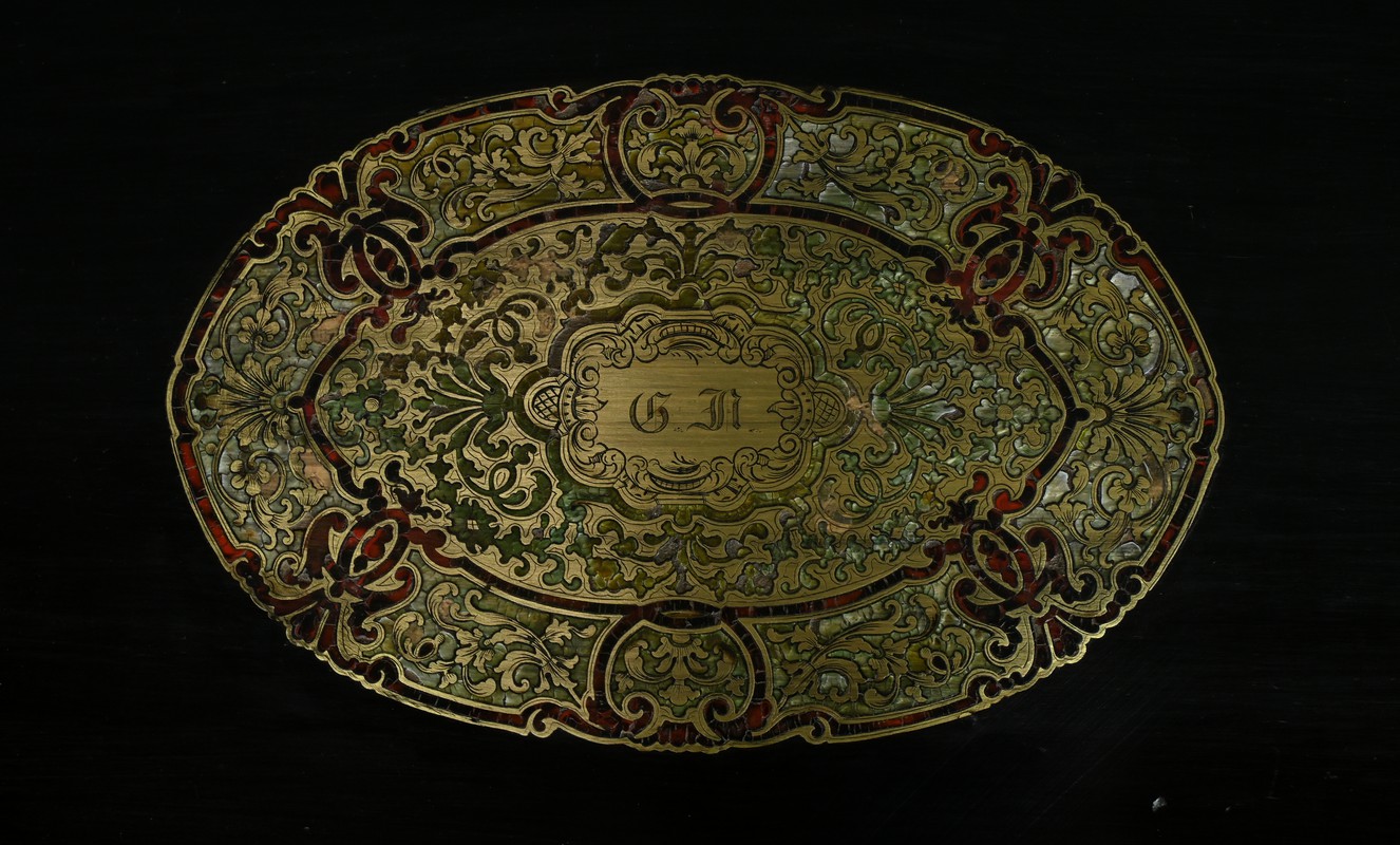 Le meuble s’ouvre par un abattant orné d’une composition en laiton ciselé, gravée des initiales “G A”.