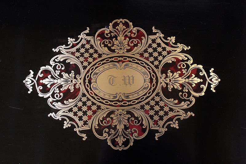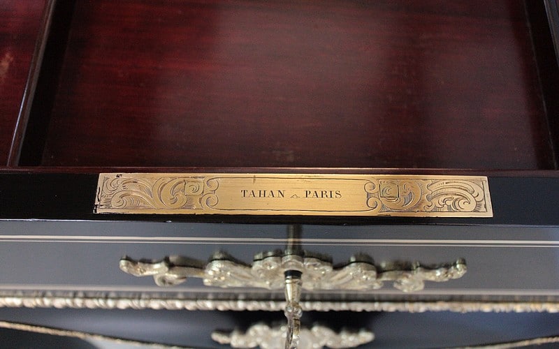 Signature sur la serrure ‘TAHAN PARIS’. – Jean-Pierre TAHAN, né à Spa en 1813, s’installa à Paris où il devint l’ébéniste de l’Empereur NAPOLÉON III –