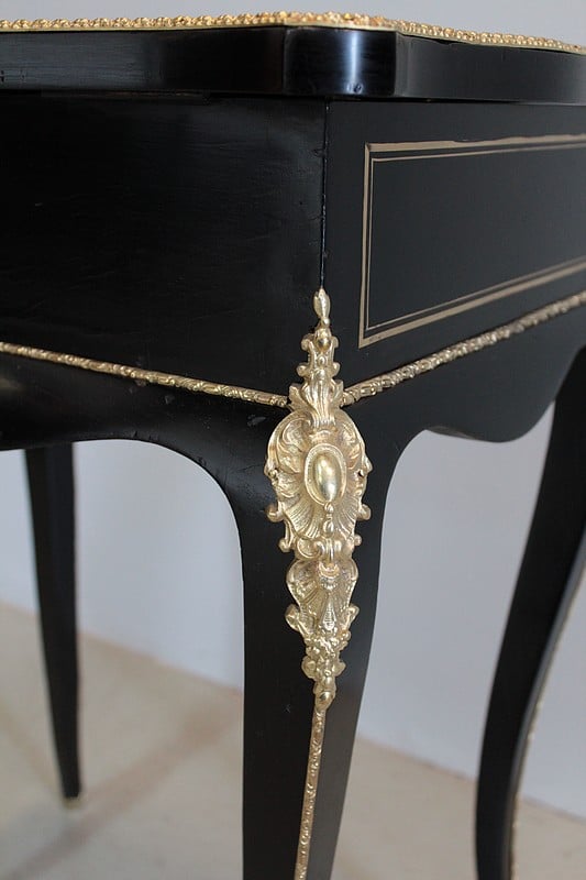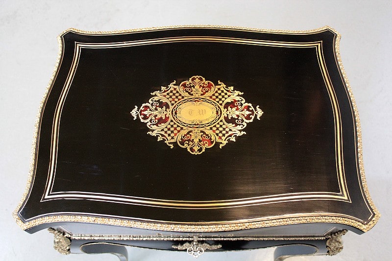 Le plateau mobile, contourné, est marqueté d’un cartouche de rinceaux de laiton et d’écaille de tortue rouge , il est marqué C W en lettres gothiques.