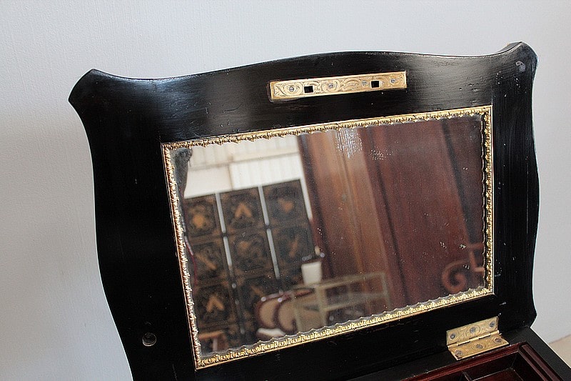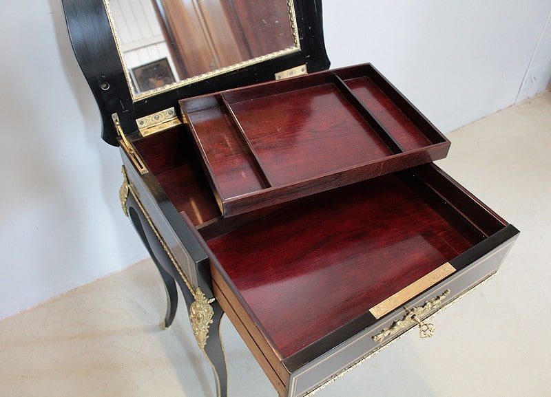 Il découvre un miroir et un tiroir à casier, en acajou.
