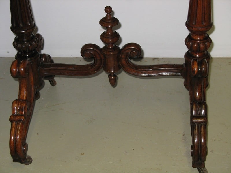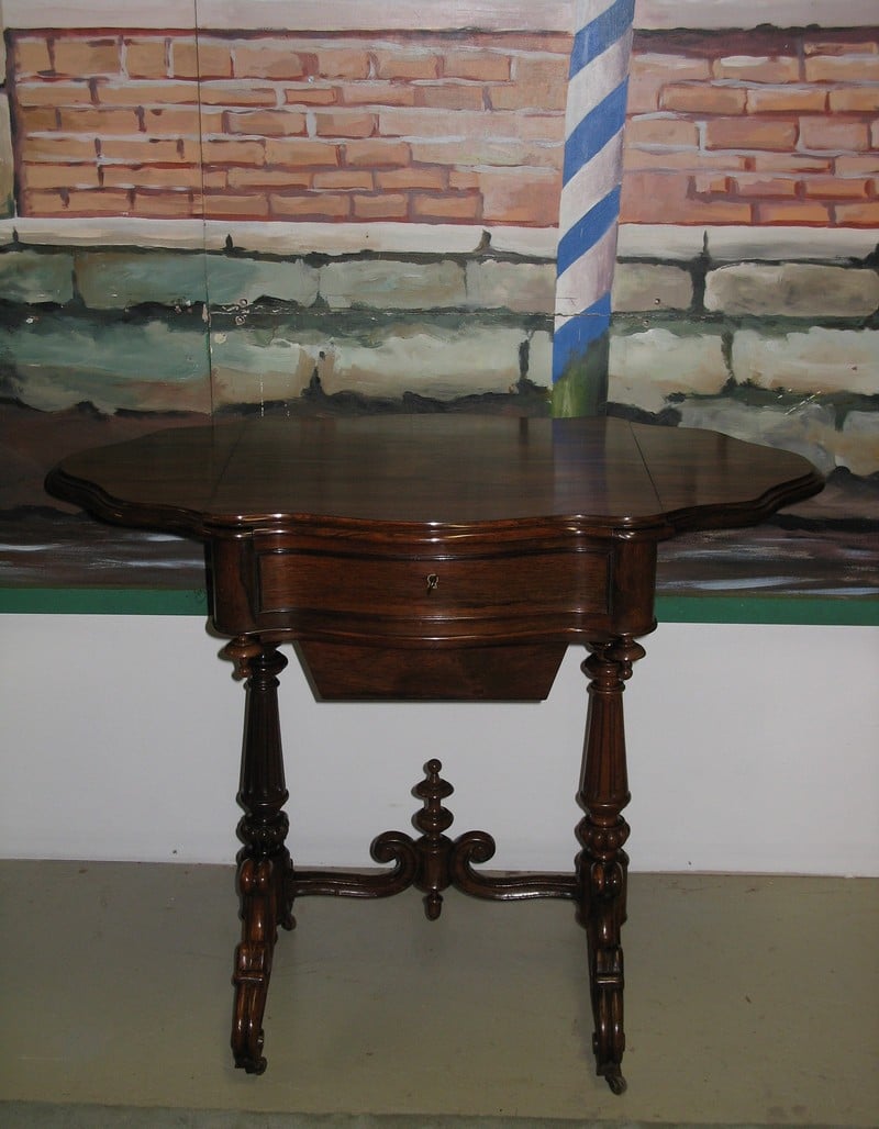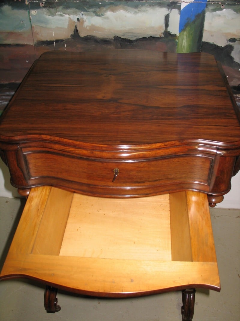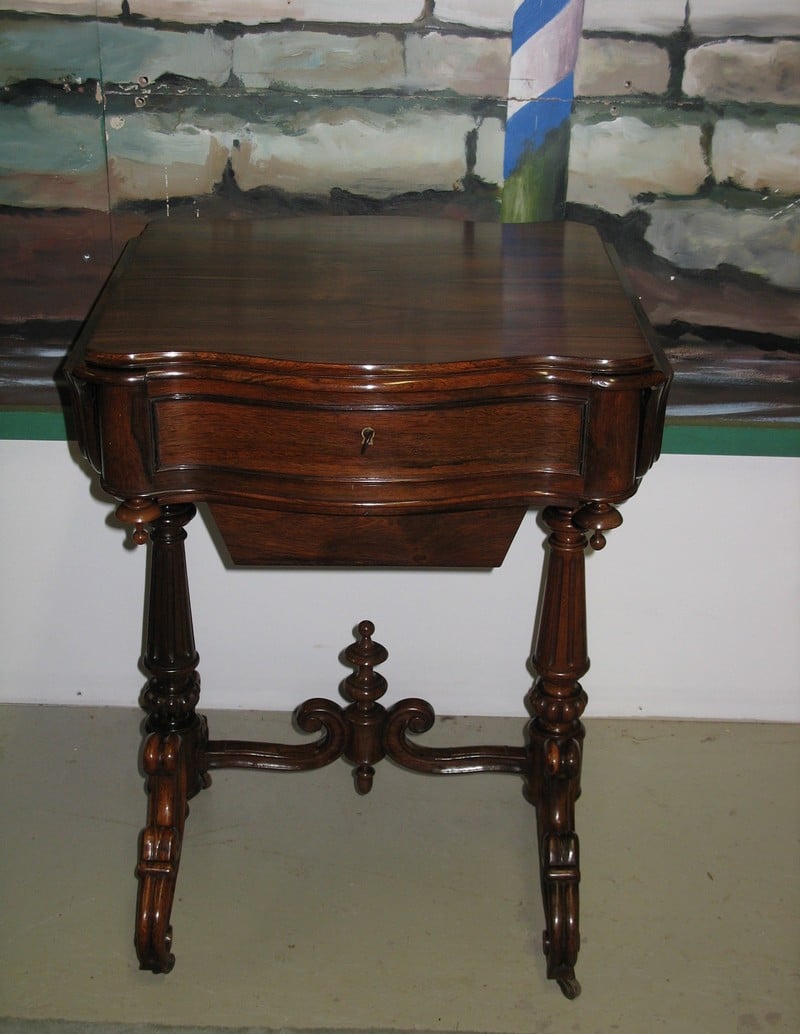 Ravissante Travailleuse Louis-Philippe à abattants en palissandre reposant sur 4 pieds à roulettes entretoisés et ouvrant par un tiroir en ceinture et un tiroir à ouvrage.