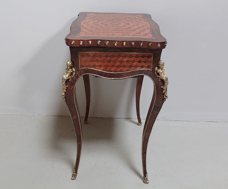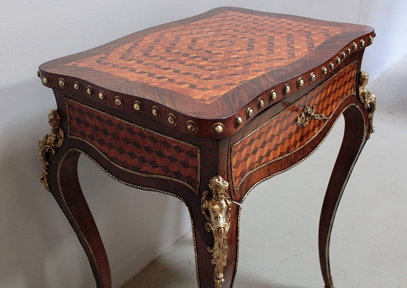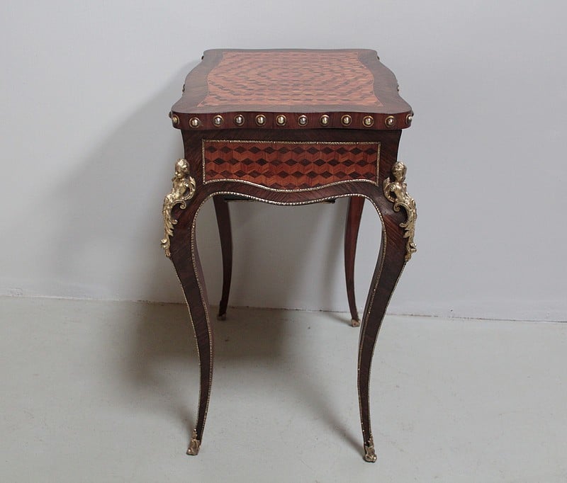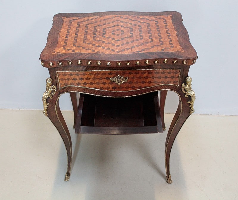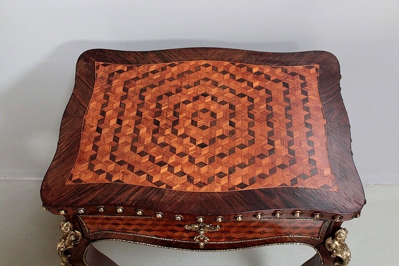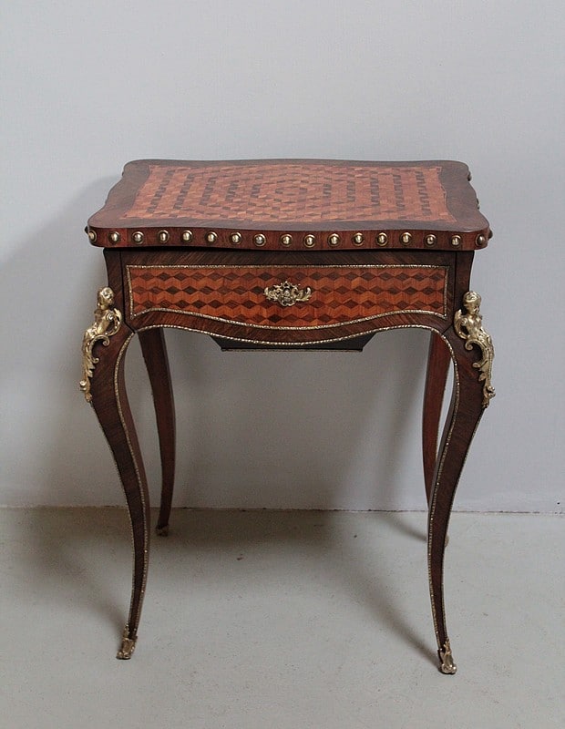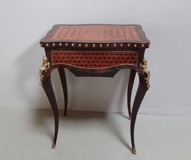 Travailleuse de style Louis XV en palissandre et marqueterie en damier de palissandre et de bois de rose.