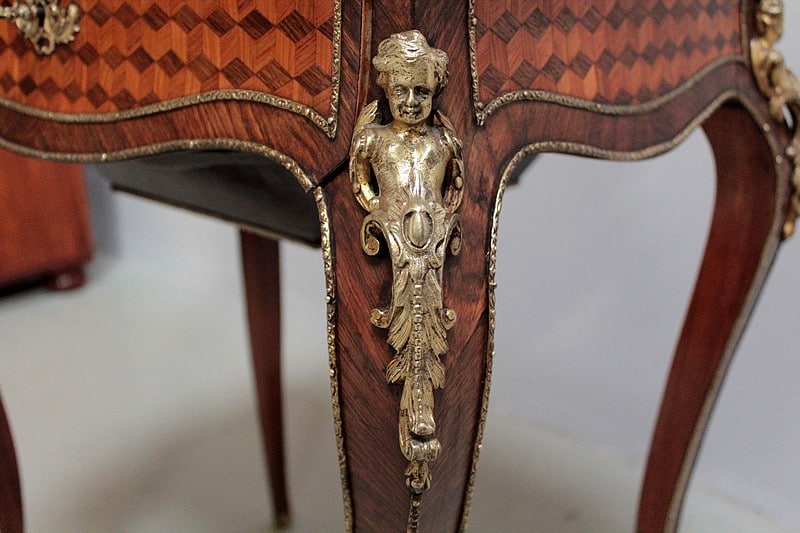 Elle repose sur 4 pieds galbés ornés en partie haute d’angelots et en partie basse de sabots en bronze.