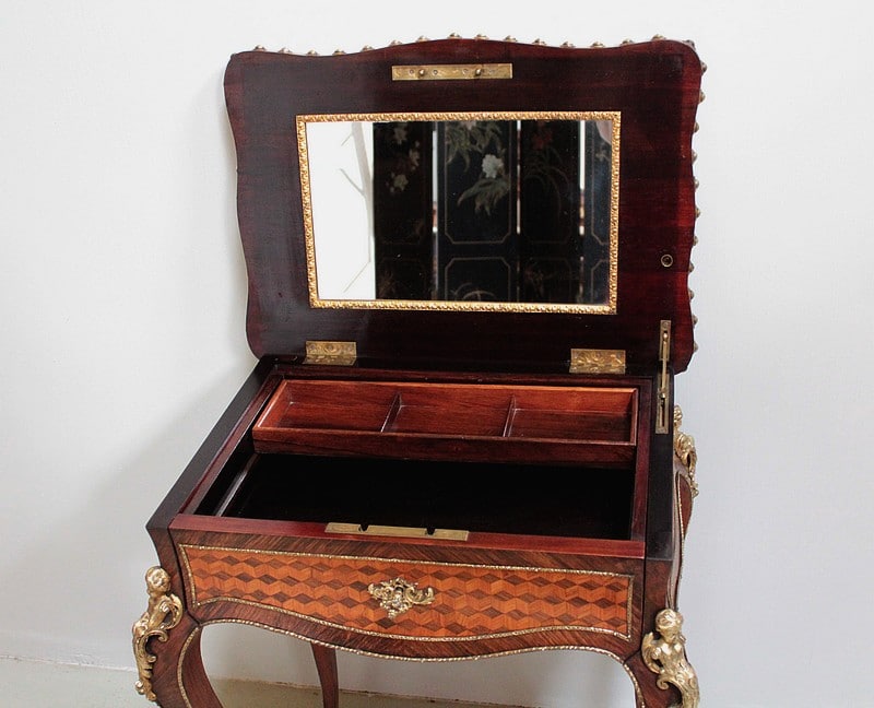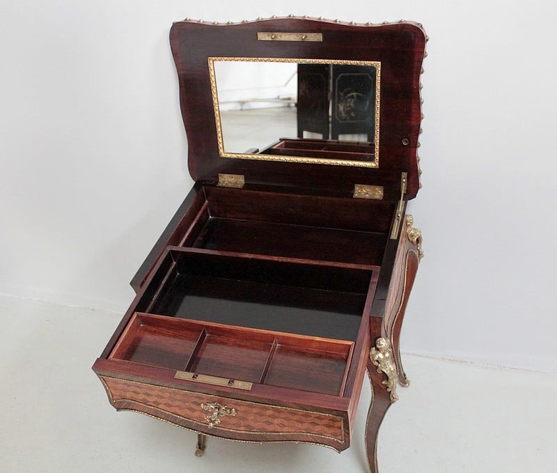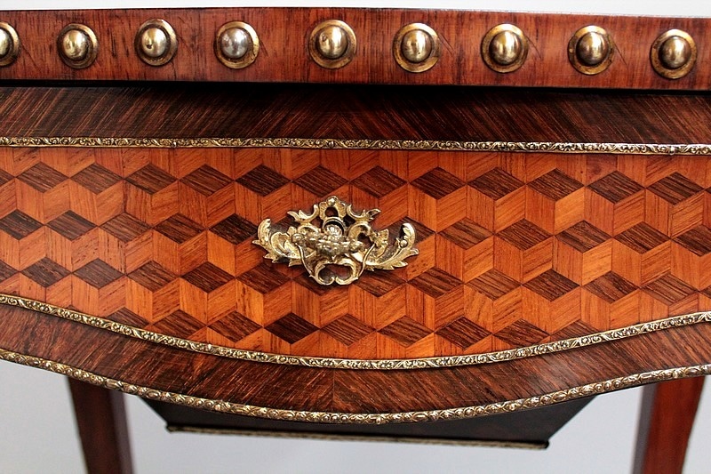 Le dessus, orné de clous de bronze, se soulève et découvre un miroir et un casier à 3 compartiments coulissant sur un tiroir en acajou fermant à clé. Dessous, petit tiroir à ouvrage en cuvette.