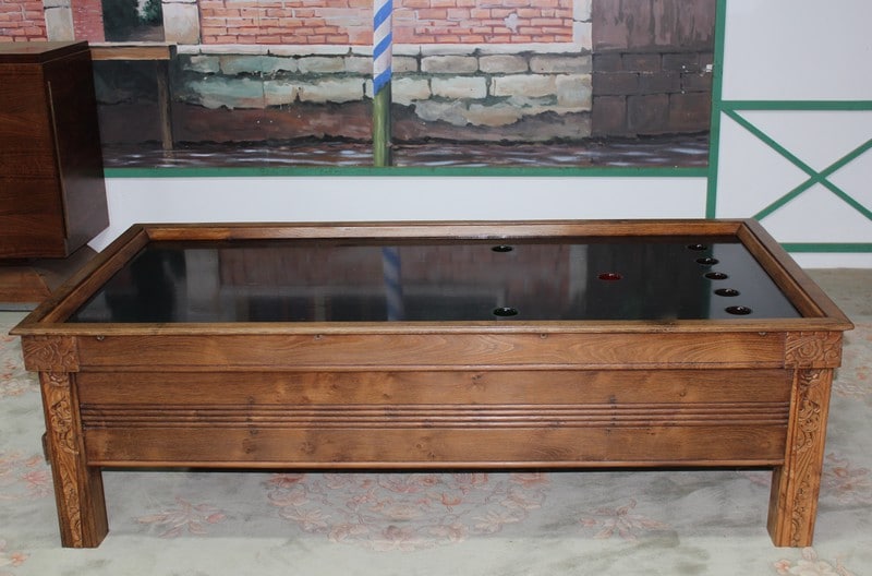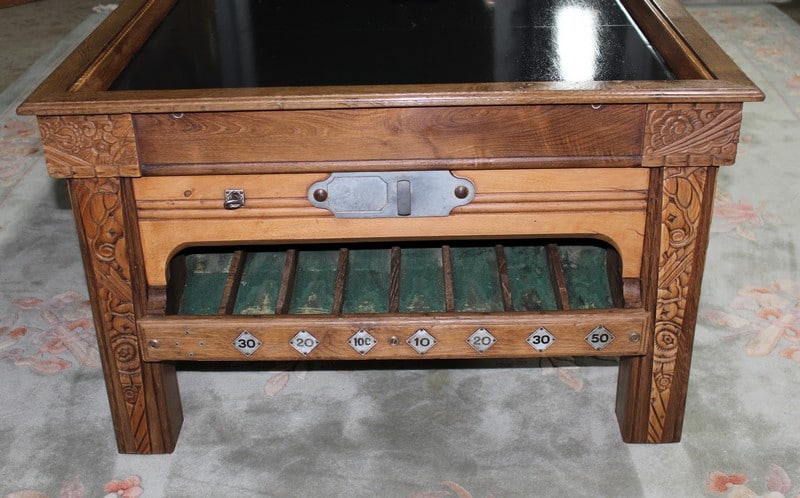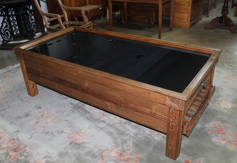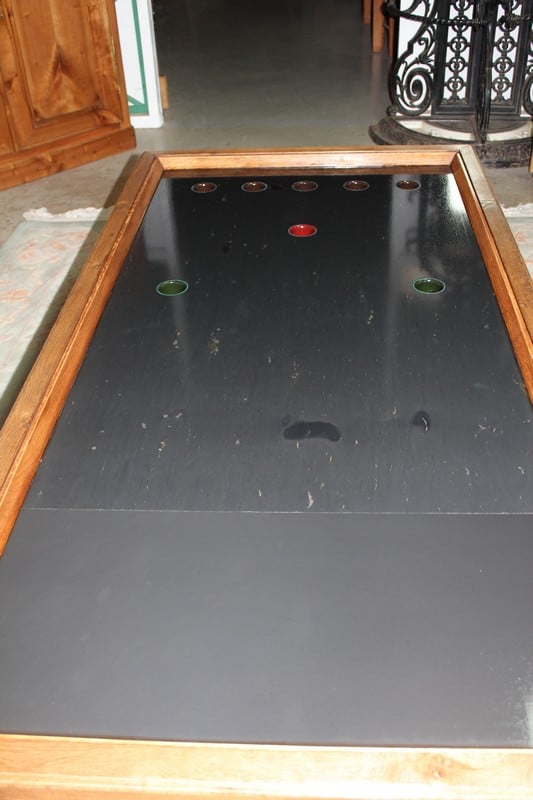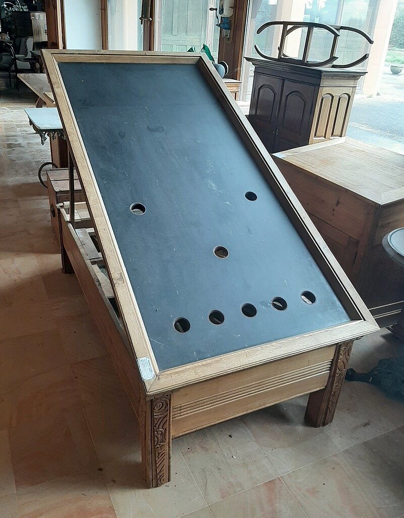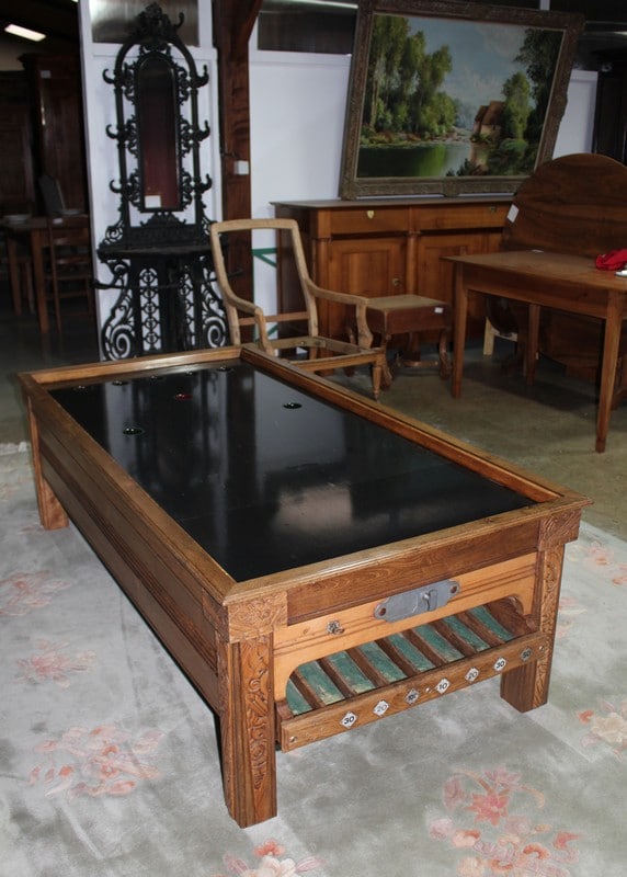 Billard en chêne et frêne avec son système monnayeur mis en table basse. Le plateau est en ardoise. Parfait état, finition cirée dans un ton naturel. Époque 1920/1930.