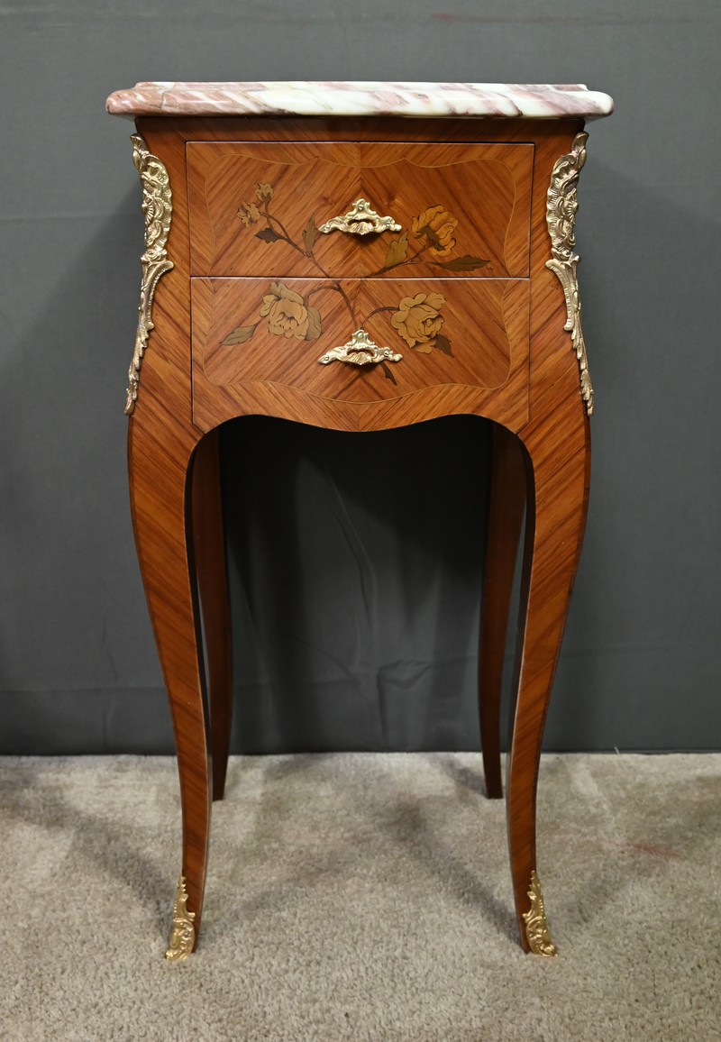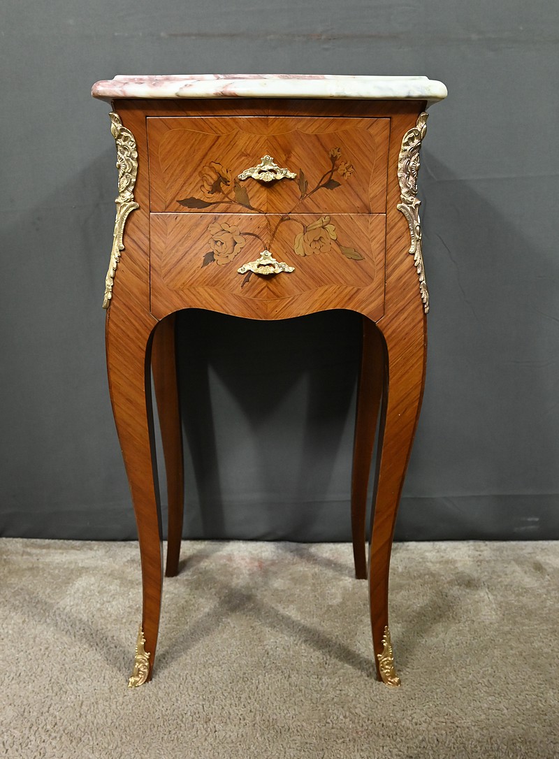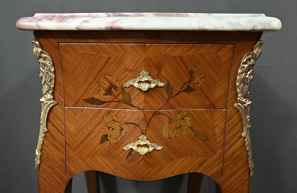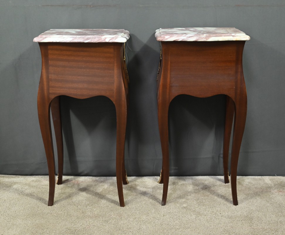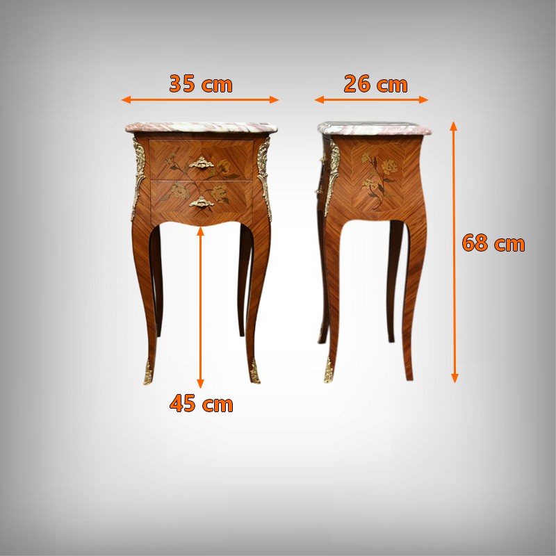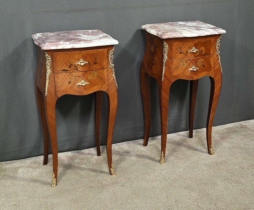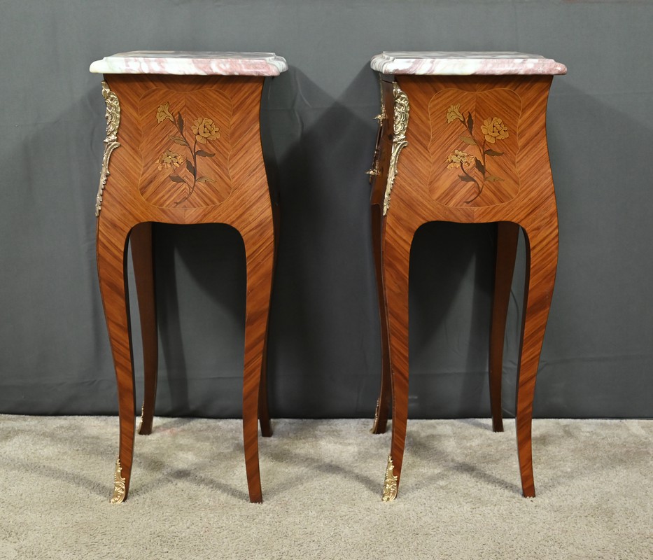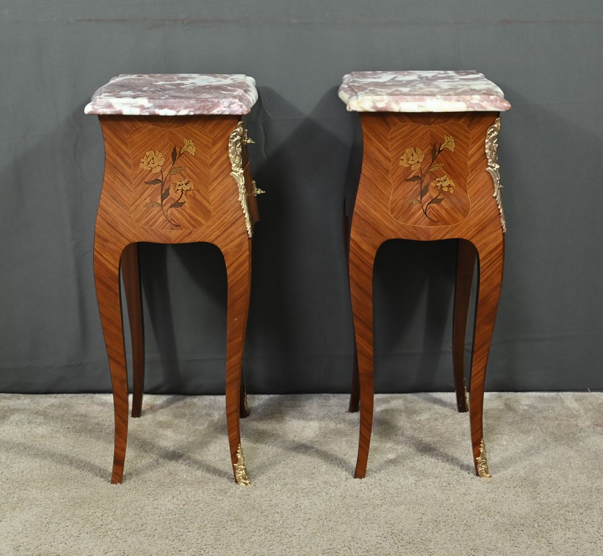 Ces deux chevets de style Louis XV sont pourvus d’une silhouette aux lignes sinueuses et de pieds galbés qui leur confèrent une grande élégance. Ils sont plaqués de bois de rose et ornés d’une marqueterie de fleurs exécutée en bois teinté, sur la façade et les côtés. Chaque chevet comporte deux tiroirs superposés munis de poignées de tirage ouvragées en bronze doré qui accentuent le caractère raffiné du meuble. Des garnitures feuillagées en bronze doré également habillent les montants et les pieds, apportant une finition riche et soignée. Chaque meuble est sommé d’un marbre rosé des Pyrénées au contour mouvementé et pourvu d’un bec de corbin. Issus d’une fabrication de qualité, ces deux chevets Louis XV apporteront distinction à la pièce de votre choix.