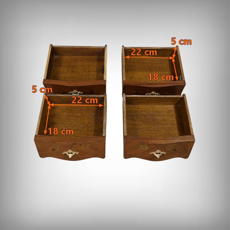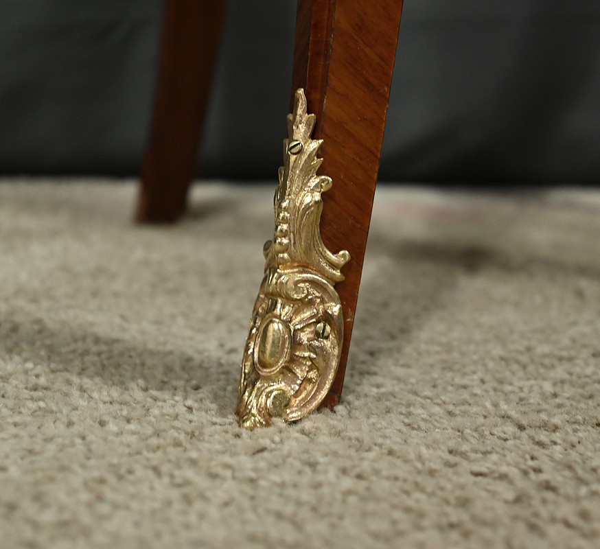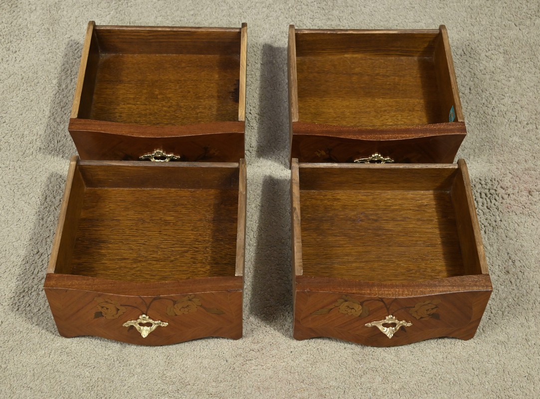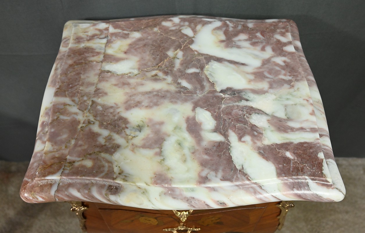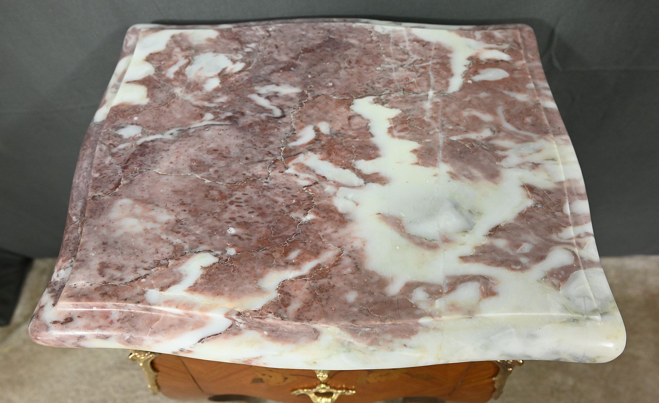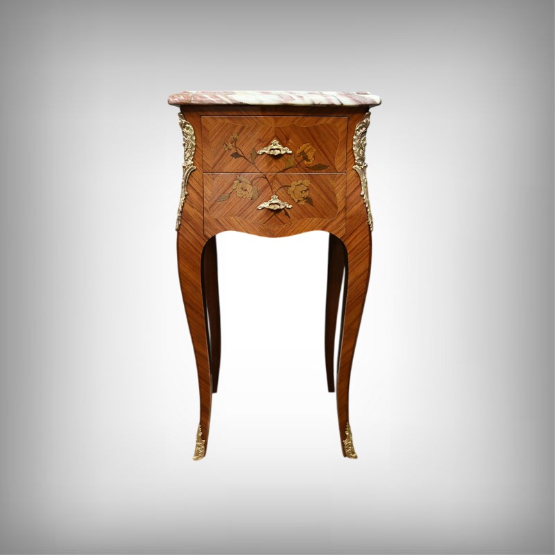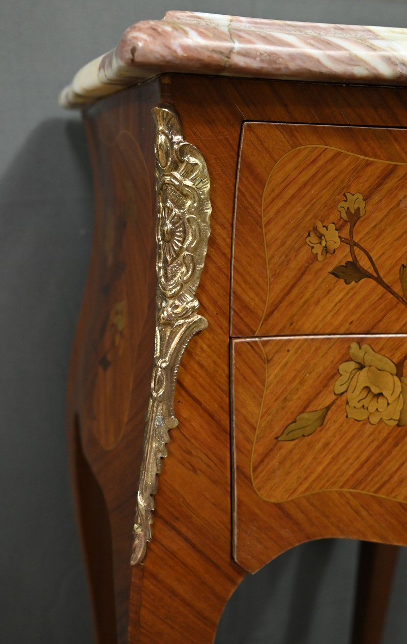 Ces deux chevets de style Louis XV sont pourvus d’une silhouette aux lignes sinueuses et de pieds galbés qui leur confèrent une grande élégance. Ils sont plaqués de bois de rose et ornés d’une marqueterie de fleurs exécutée en bois teinté, sur la façade et les côtés. Chaque chevet comporte deux tiroirs superposés munis de poignées de tirage ouvragées en bronze doré qui accentuent le caractère raffiné du meuble. Des garnitures feuillagées en bronze doré également habillent les montants et les pieds, apportant une finition riche et soignée. Chaque meuble est sommé d’un marbre rosé des Pyrénées au contour mouvementé et pourvu d’un bec de corbin. Issus d’une fabrication de qualité, ces deux chevets Louis XV apporteront distinction à la pièce de votre choix.