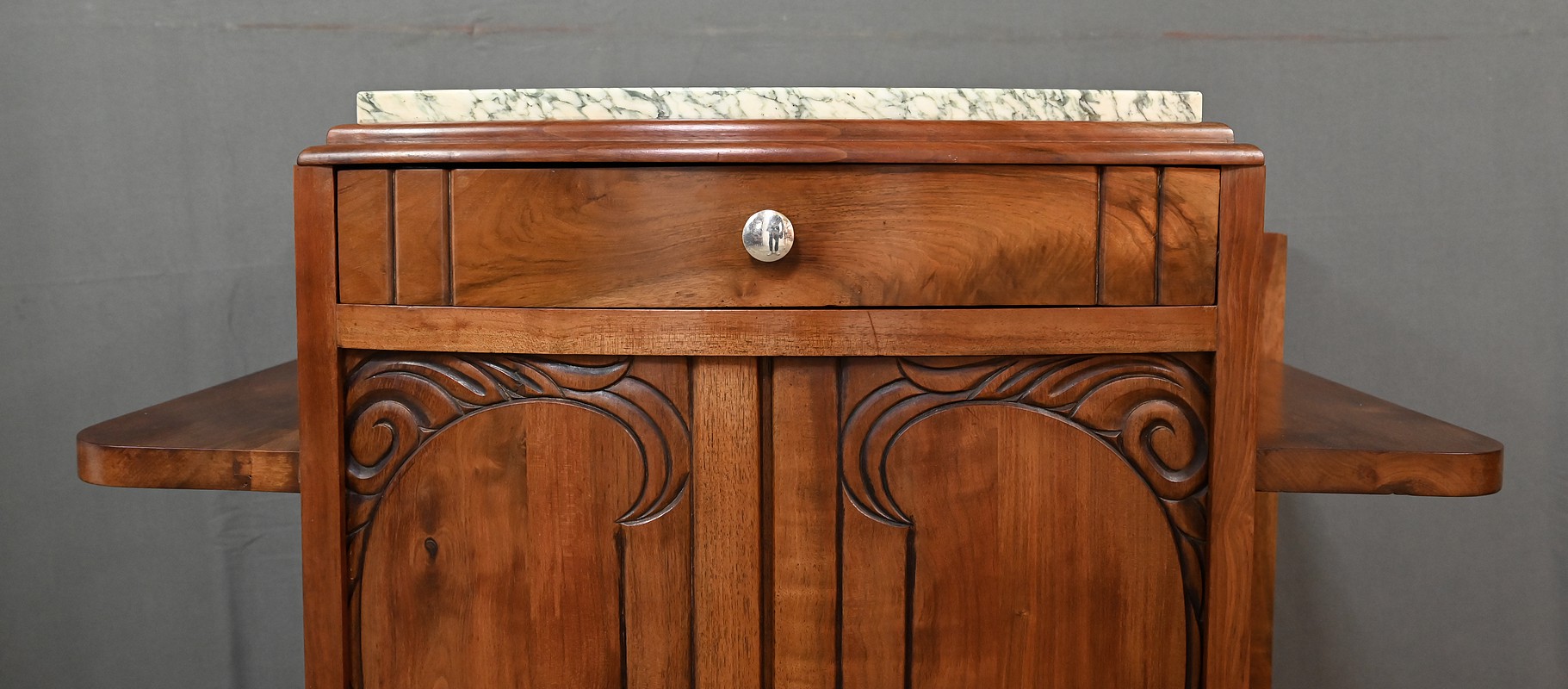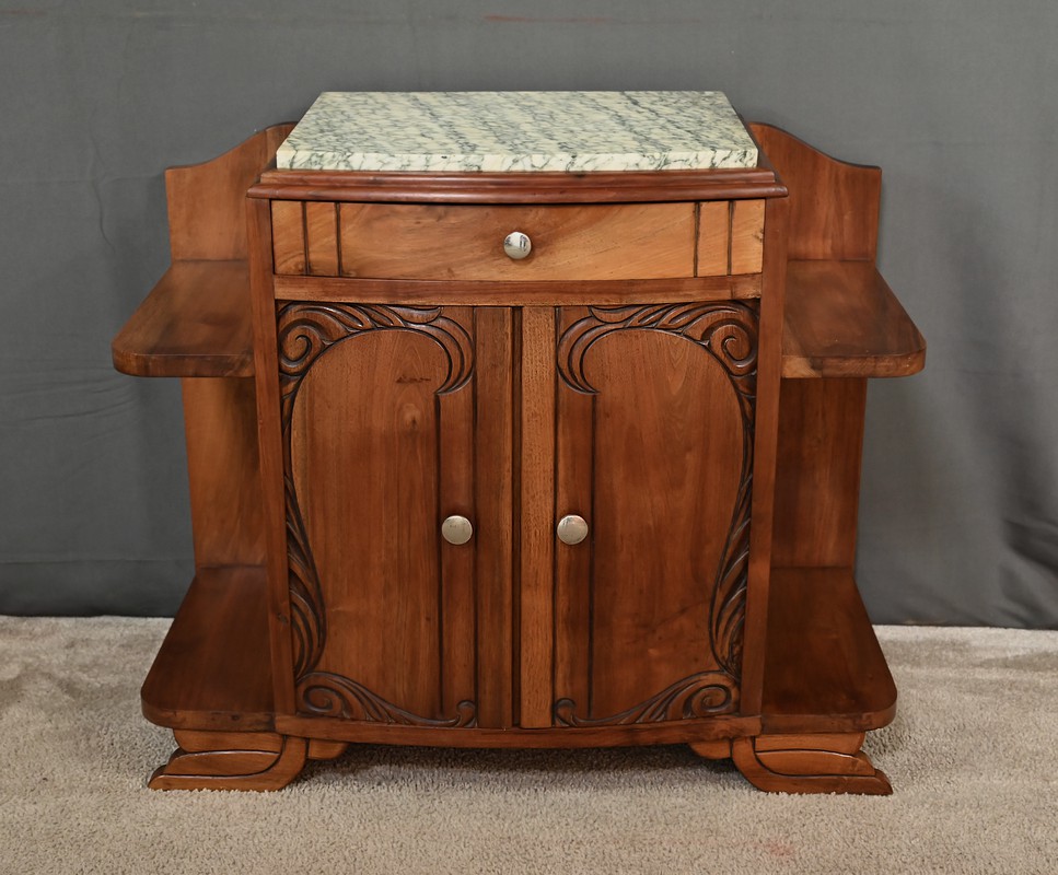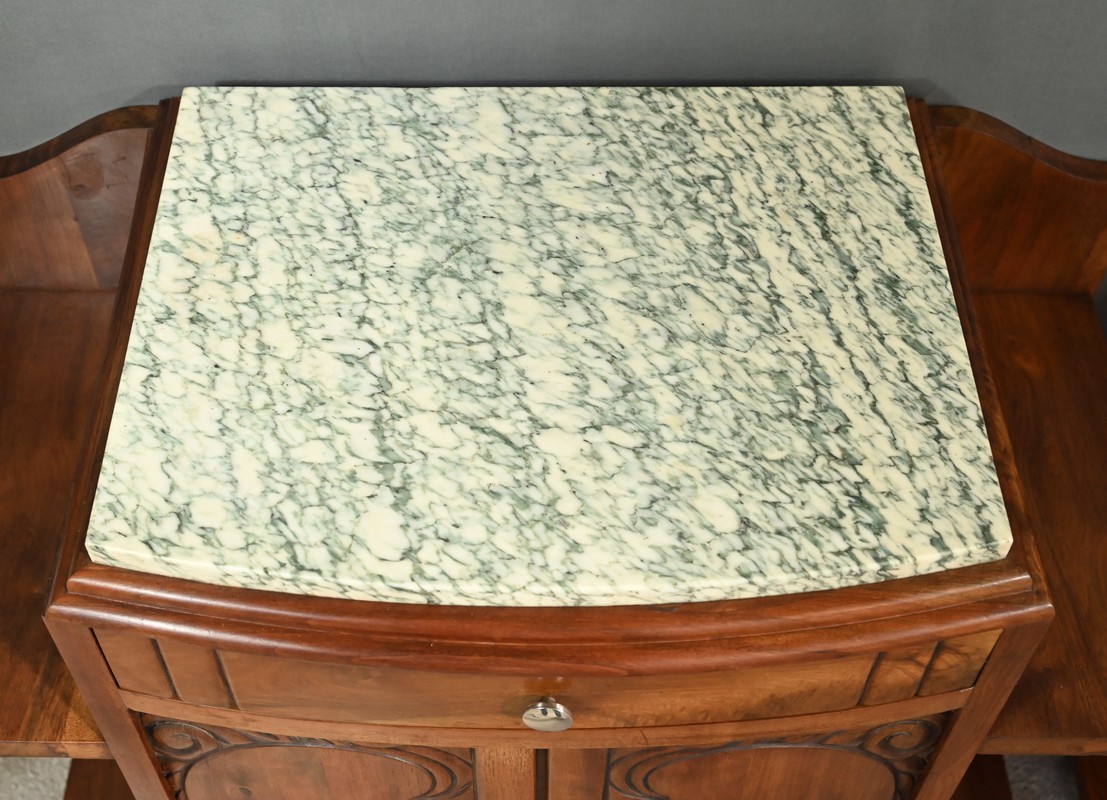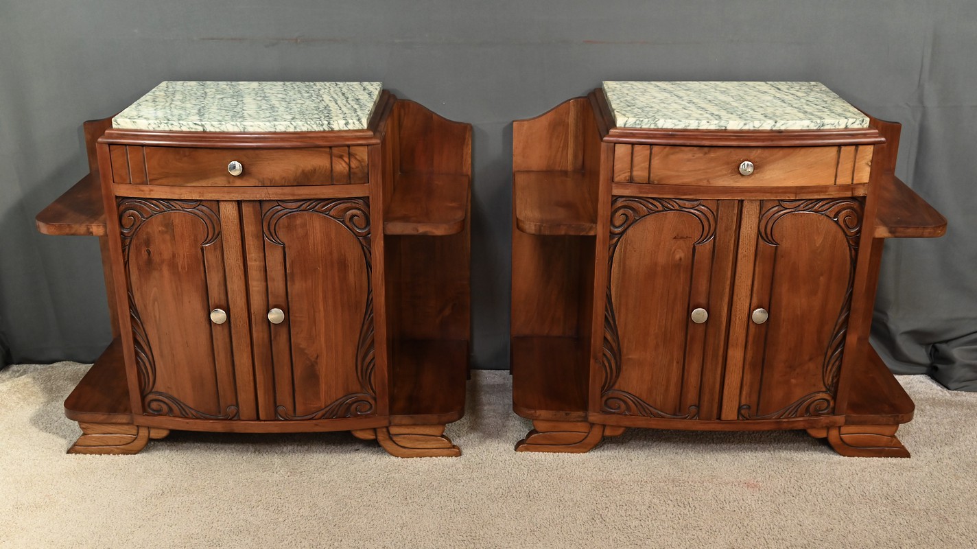 Paire de tables de chevets Art déco datant des années 1920, sommés d’un marbre vert d’Estours qui contraste avec la chaleur du noyer et souligne le caractère unique de chaque pièce. Ces petits meubles présentent chacun un tiroir en partie haute garni d’un bouton rond en métal et deux portes centrales décorées de motifs sculptés. De chaque côté des portes se trouvent des étagères ouvertes qui apportent du rangement accessible et une lecture architecturée de l’ensemble. L’intérieur est doté d’une étagère. Le noyer affiche un grain profond et une teinte brun caramel. Ces tables de chevet s’intègre aussi bien dans une chambre que comme meuble d’appoint dans une entrée ou un salon.