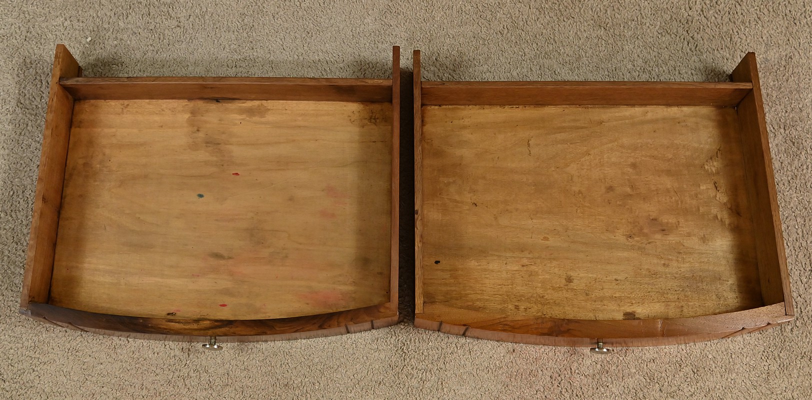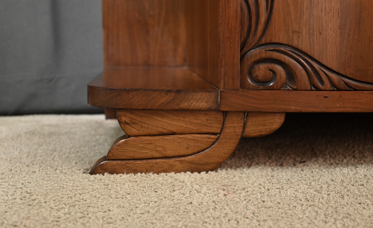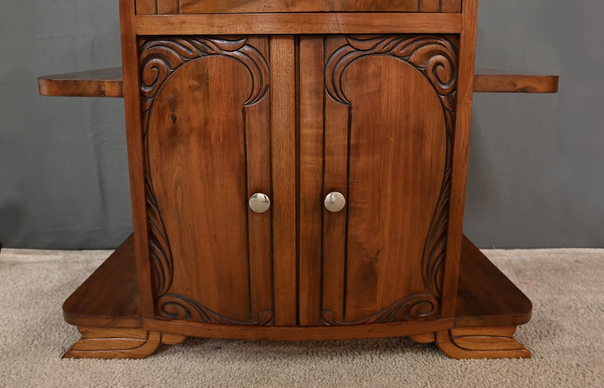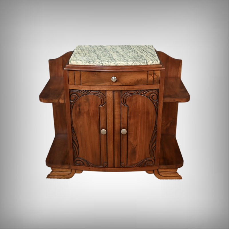 Paire de tables de chevets Art déco datant des années 1920, sommés d’un marbre vert d’Estours qui contraste avec la chaleur du noyer et souligne le caractère unique de chaque pièce. Ces petits meubles présentent chacun un tiroir en partie haute garni d’un bouton rond en métal et deux portes centrales décorées de motifs sculptés. De chaque côté des portes se trouvent des étagères ouvertes qui apportent du rangement accessible et une lecture architecturée de l’ensemble. L’intérieur est doté d’une étagère. Le noyer affiche un grain profond et une teinte brun caramel. Ces tables de chevet s’intègre aussi bien dans une chambre que comme meuble d’appoint dans une entrée ou un salon.