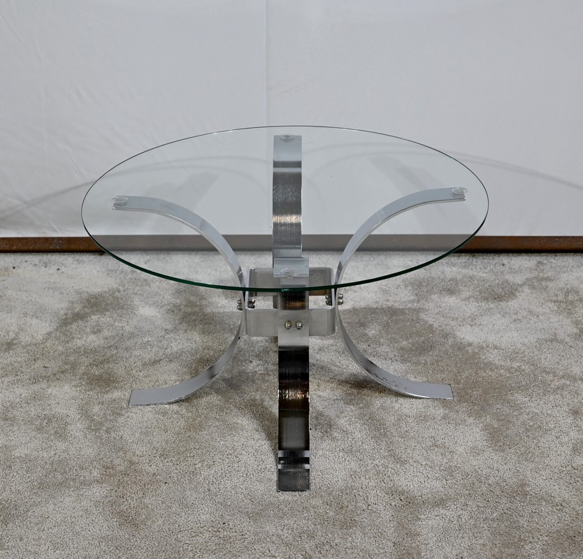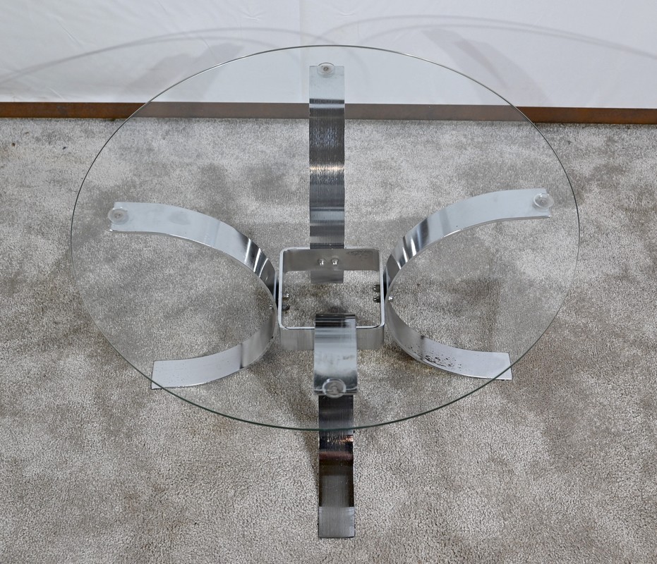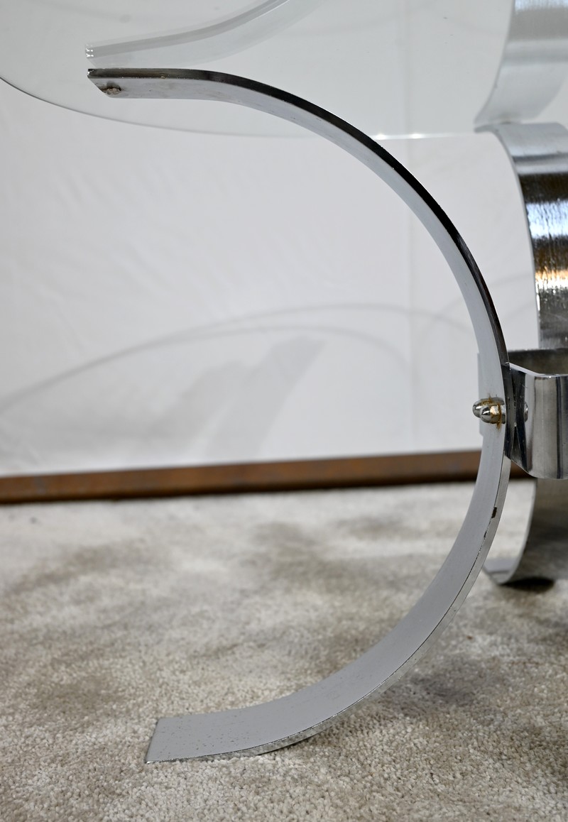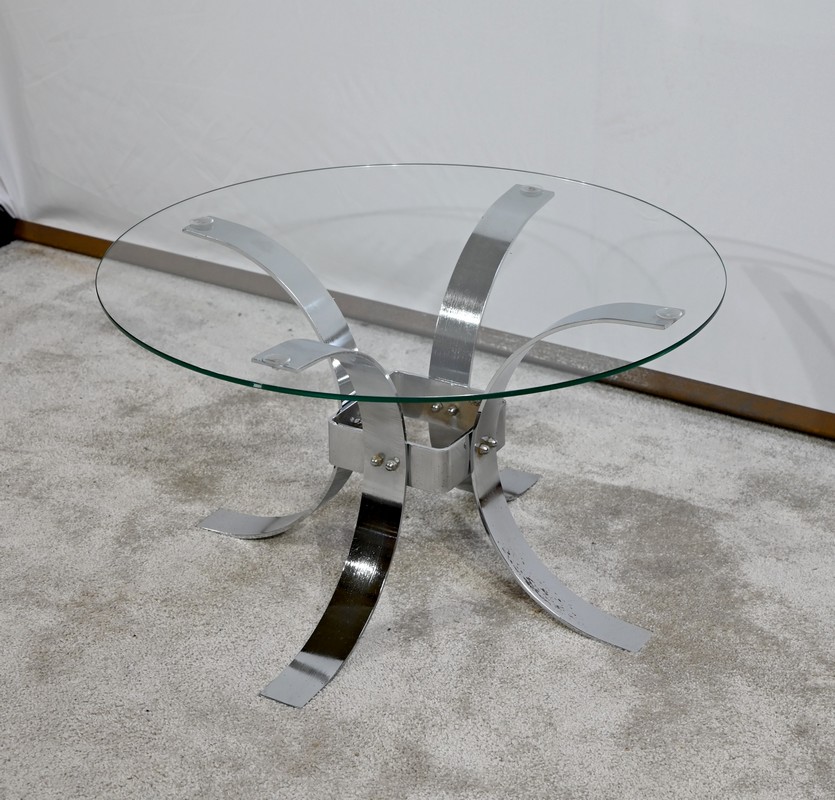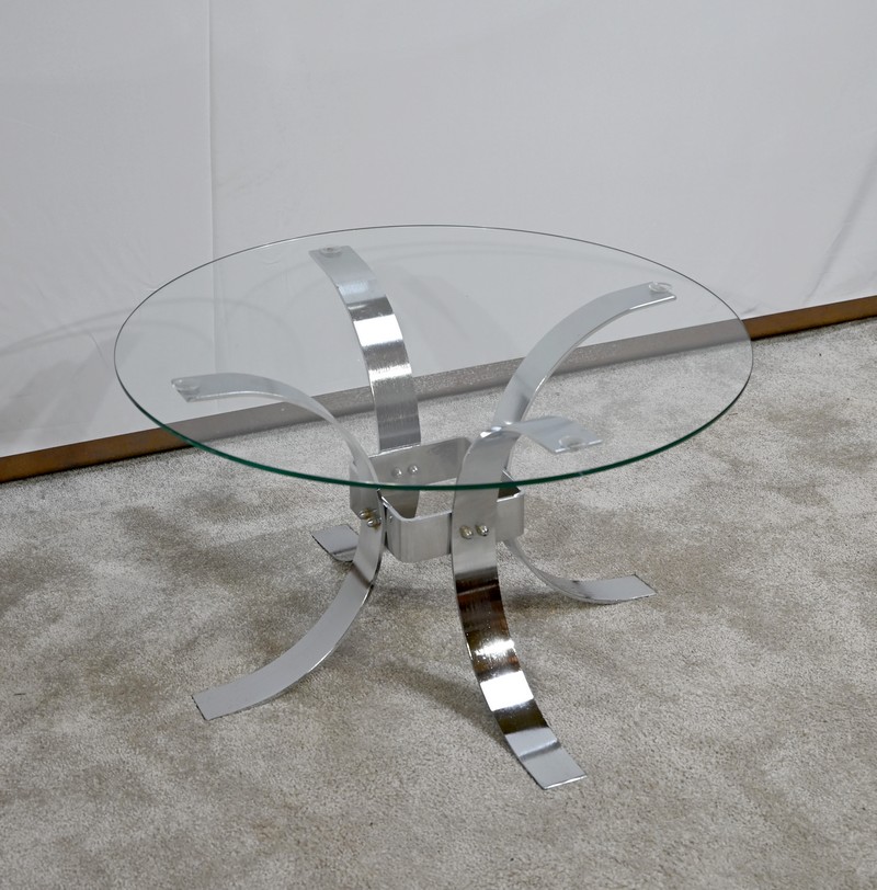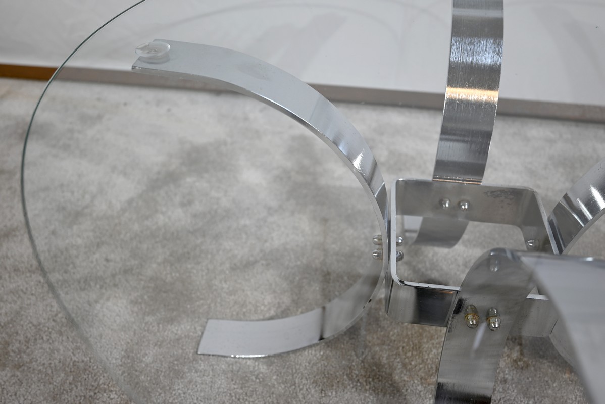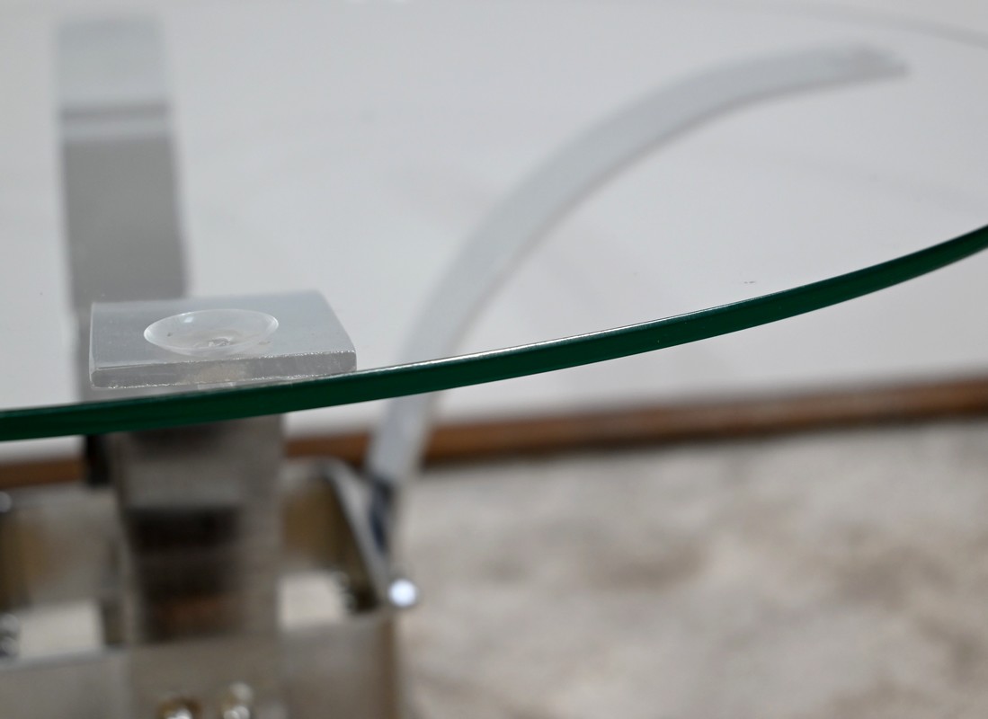 Cette petite table présente un plateau circulaire en verre d’une épaisseur de 0,6 cm. Celui-ci est ventousé sur quatre pieds courbés, en métal chromé, boulonnés au centre à un élément carré.