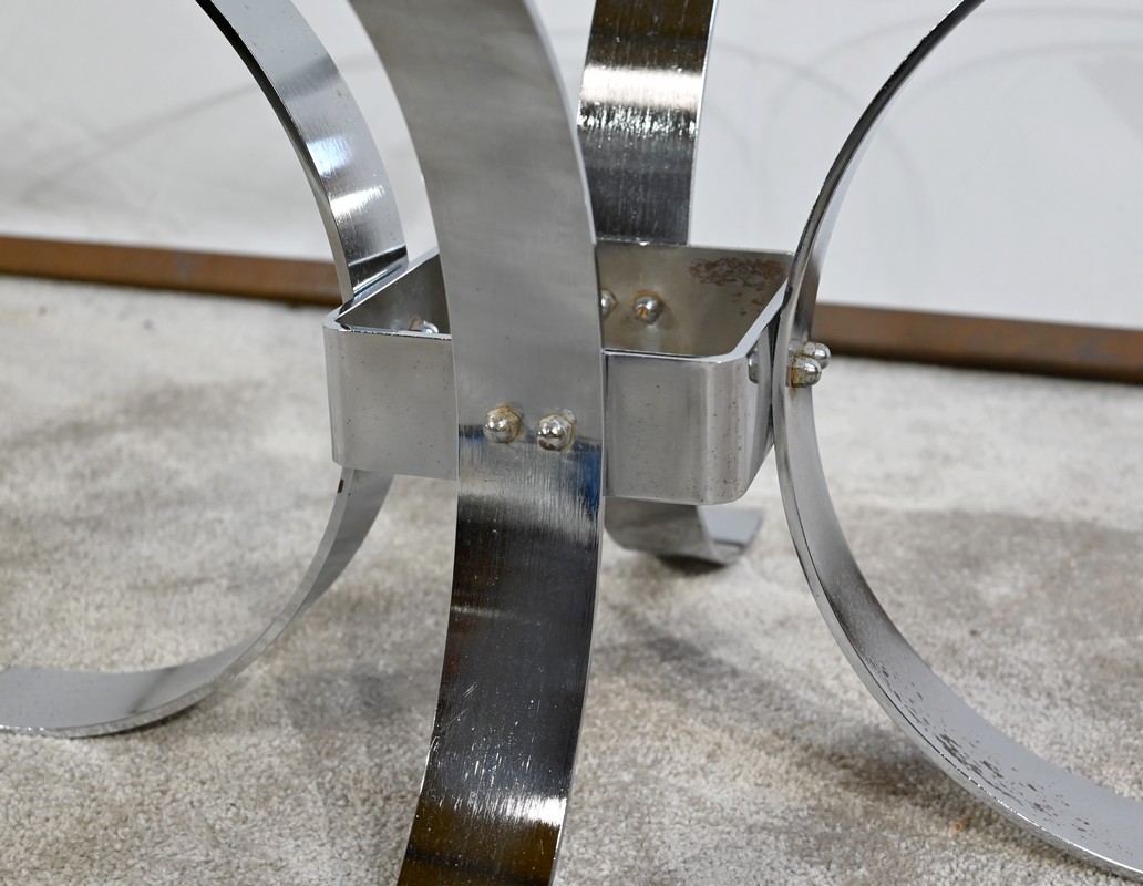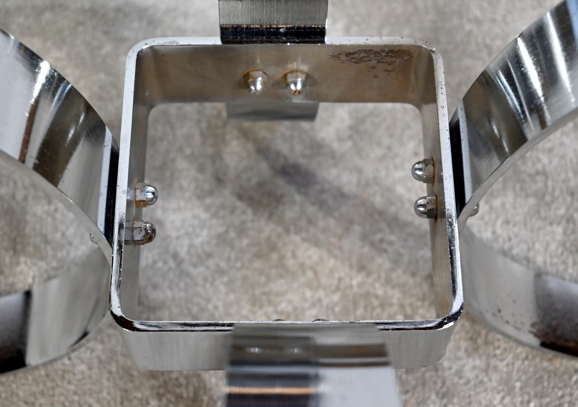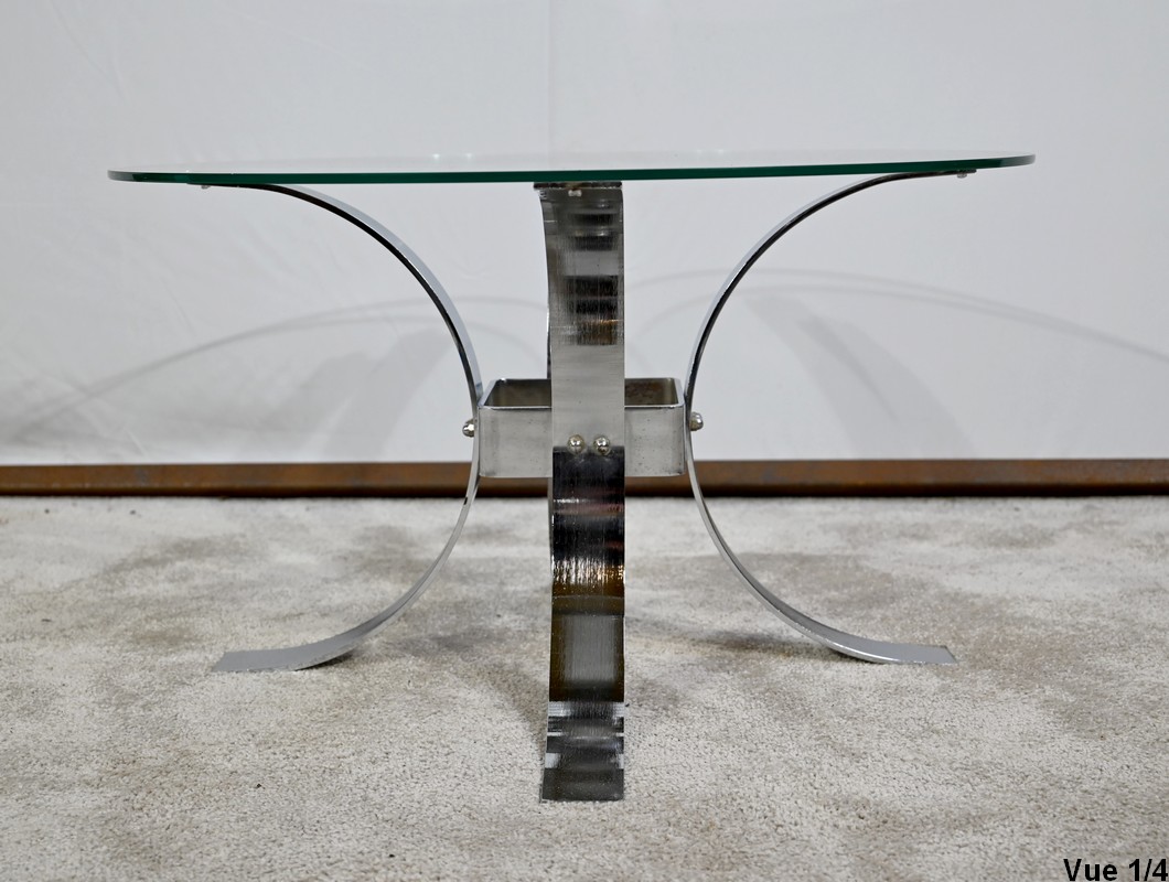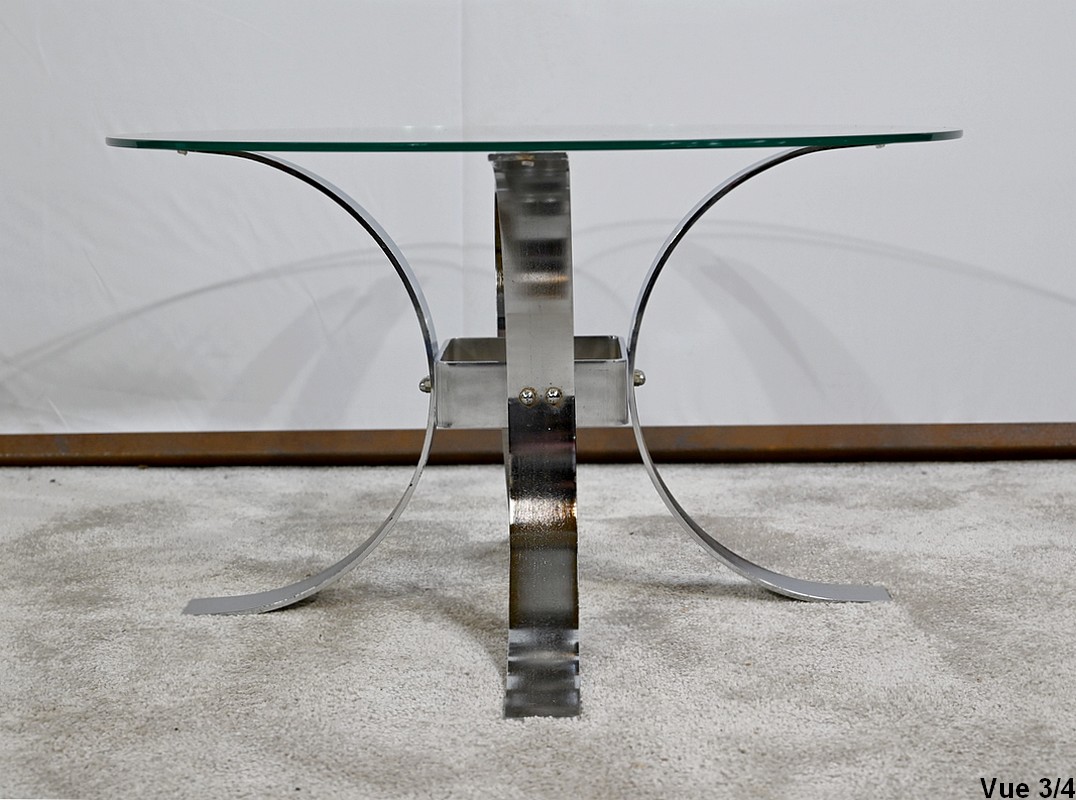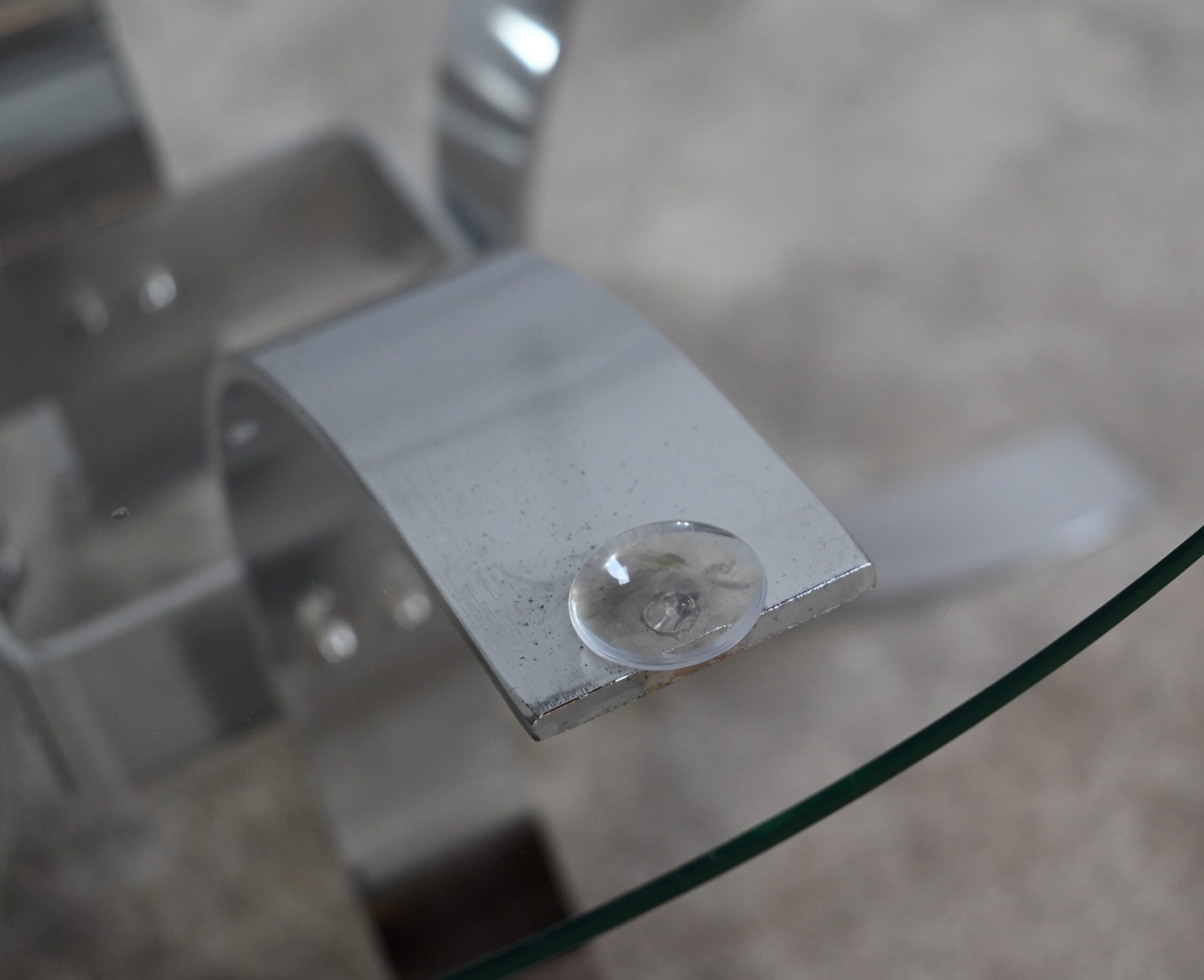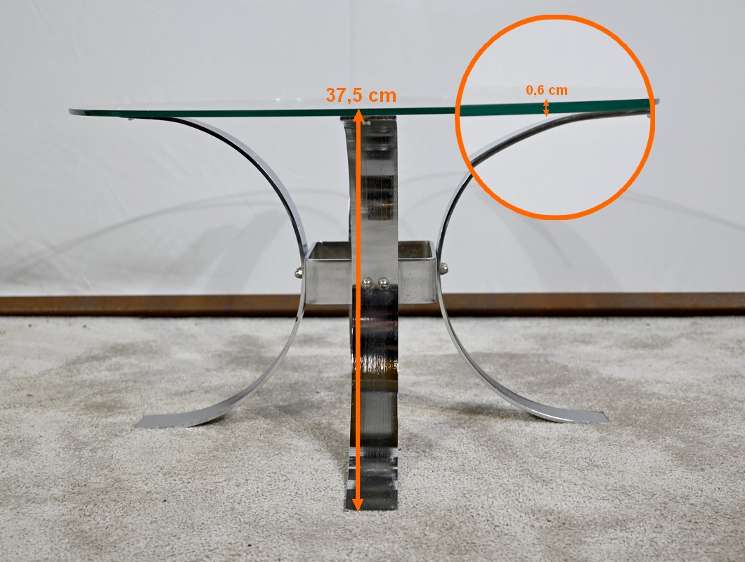 Cette petite table présente un plateau circulaire en verre d’une épaisseur de 0,6 cm. Celui-ci est ventousé sur quatre pieds courbés, en métal chromé, boulonnés au centre à un élément carré.