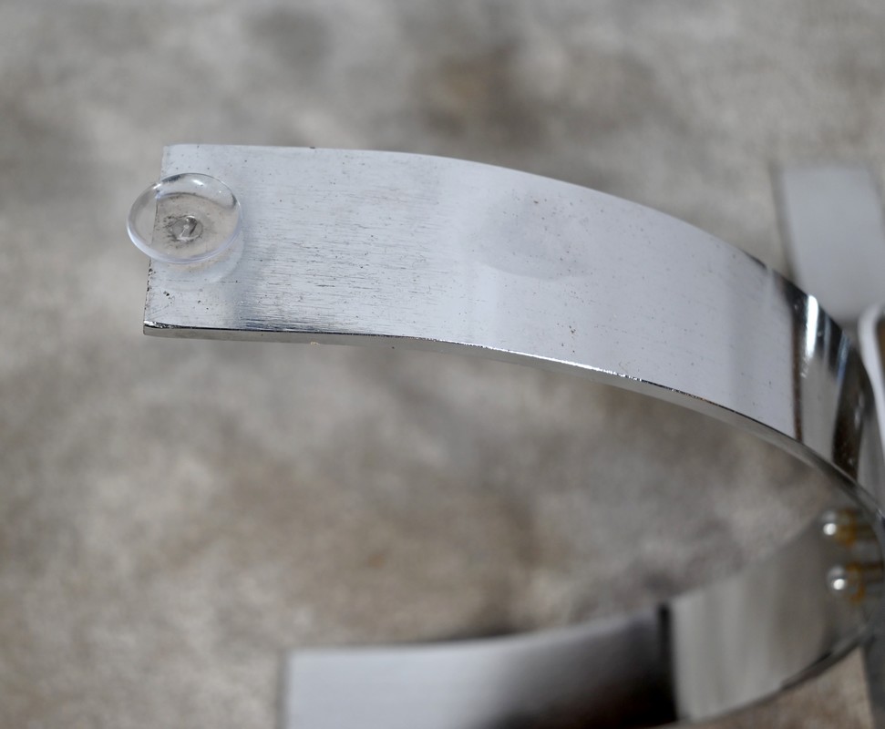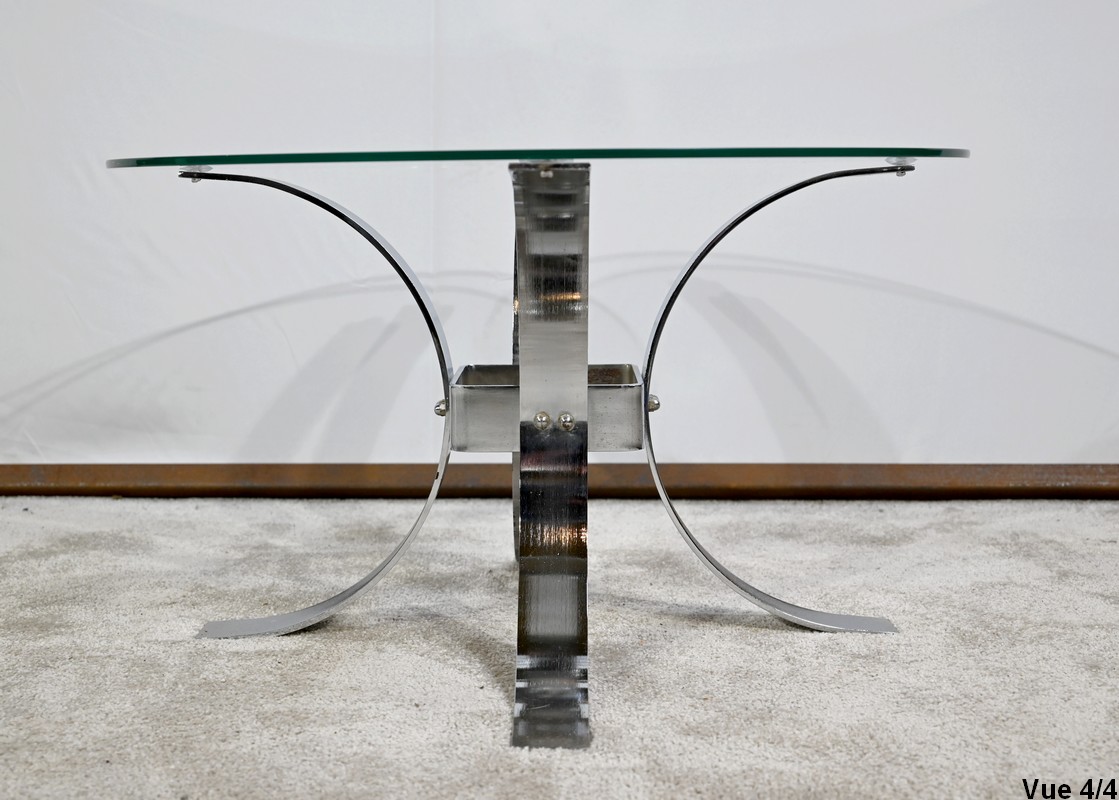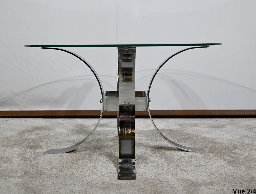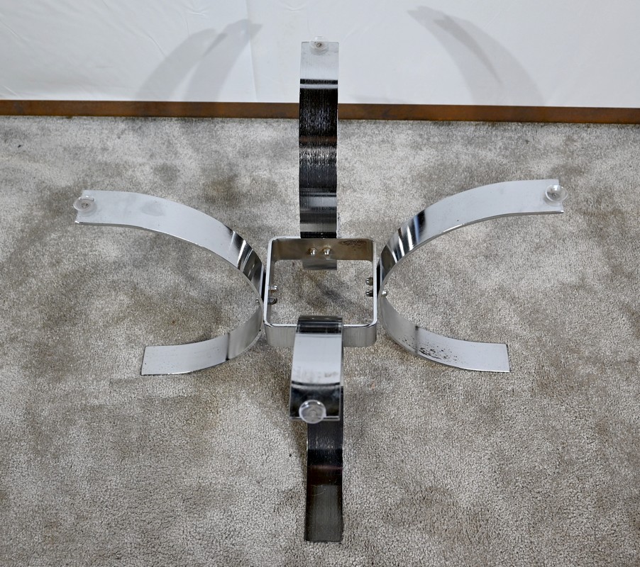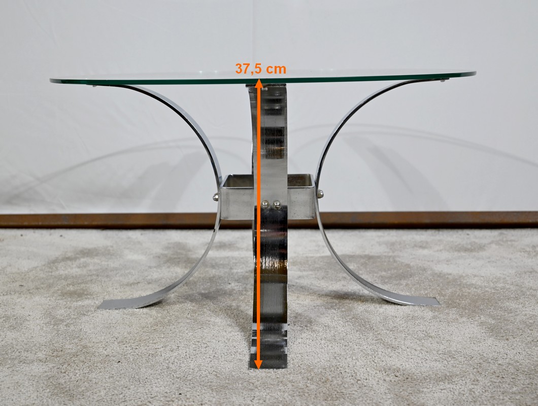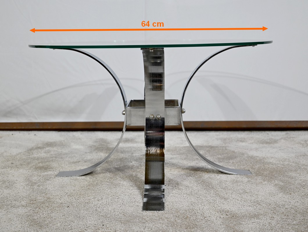 Cette petite table présente un plateau circulaire en verre d’une épaisseur de 0,6 cm. Celui-ci est ventousé sur quatre pieds courbés, en métal chromé, boulonnés au centre à un élément carré.