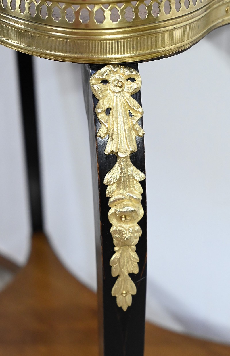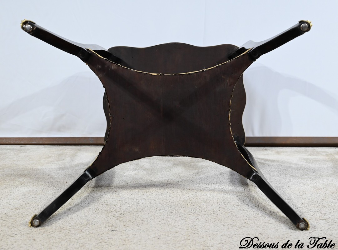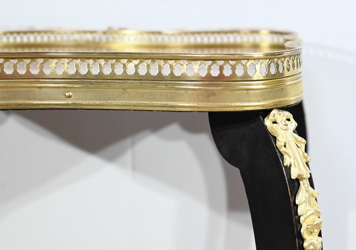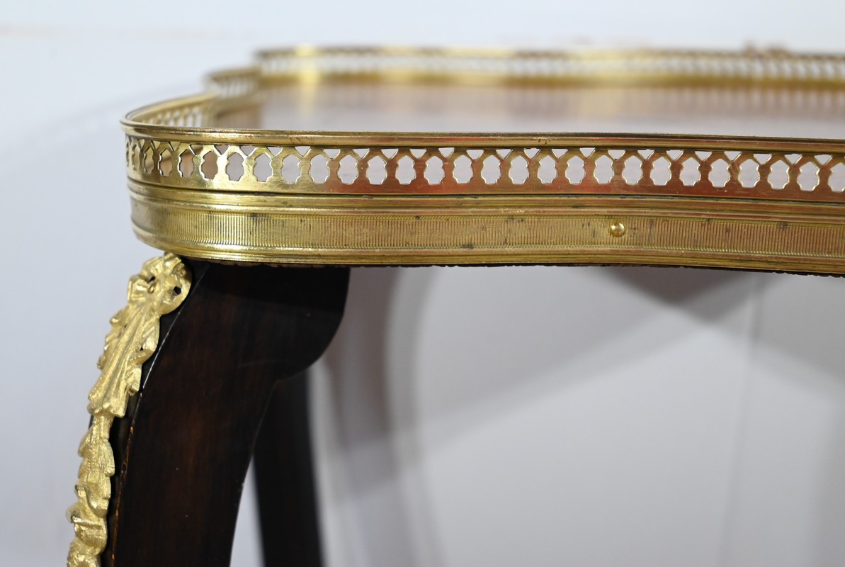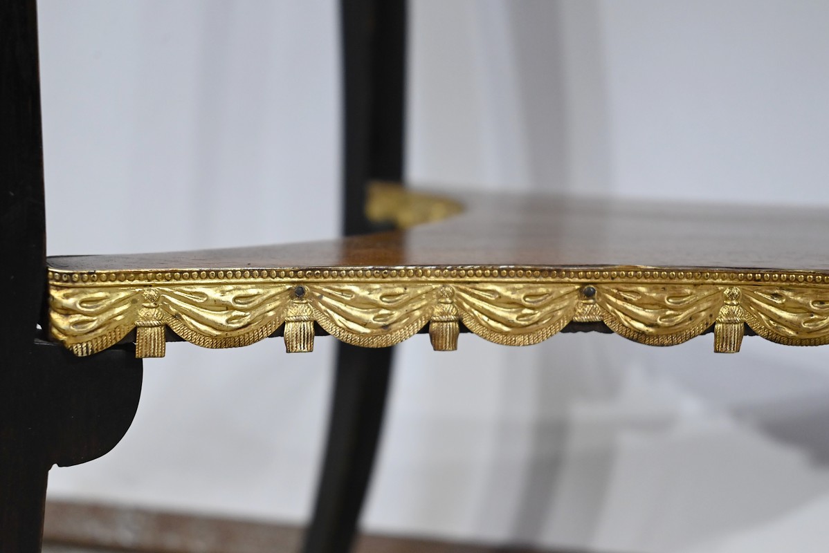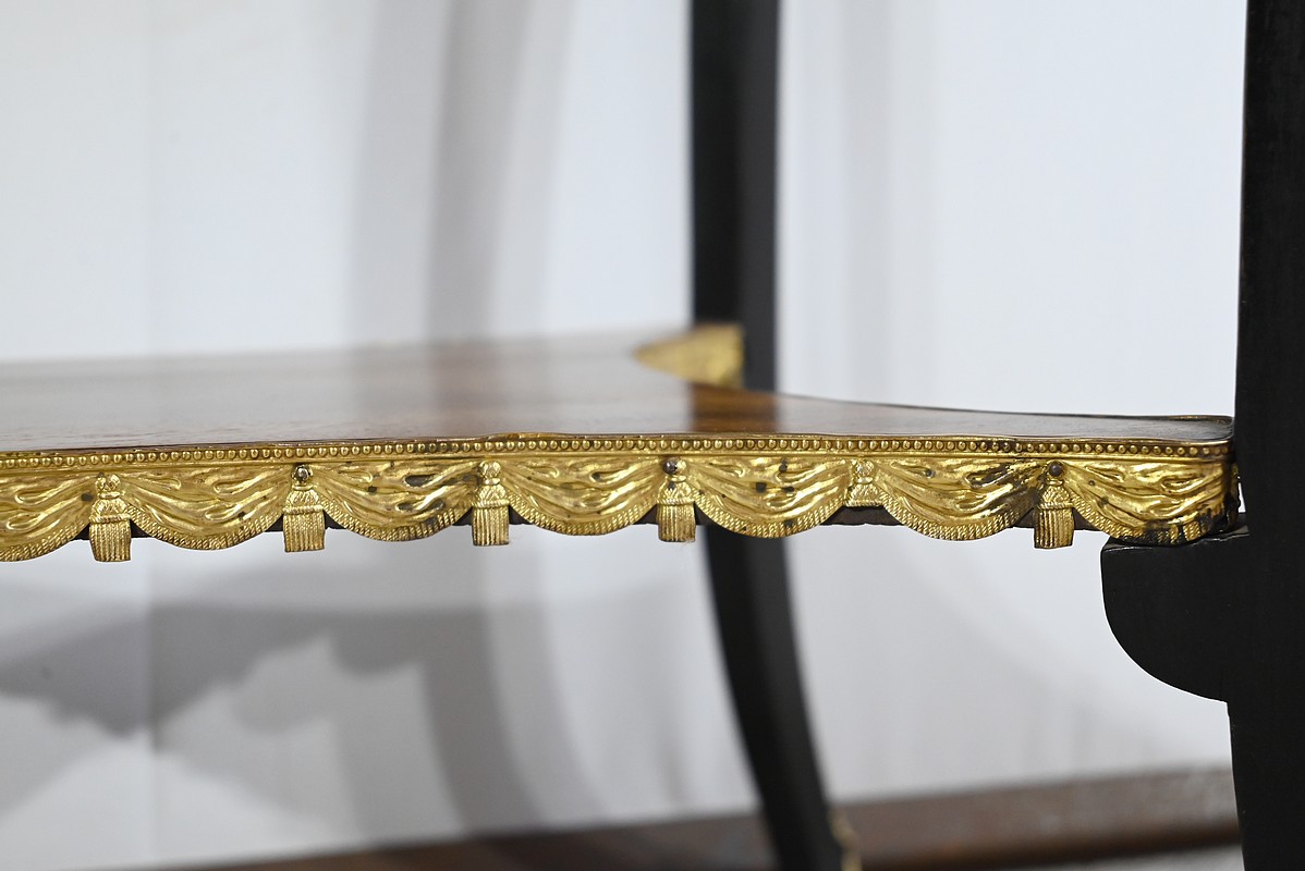 La tablette d’entretoise, aux côtés concaves, est habillée de baguettes laiton à motifs de draperie.