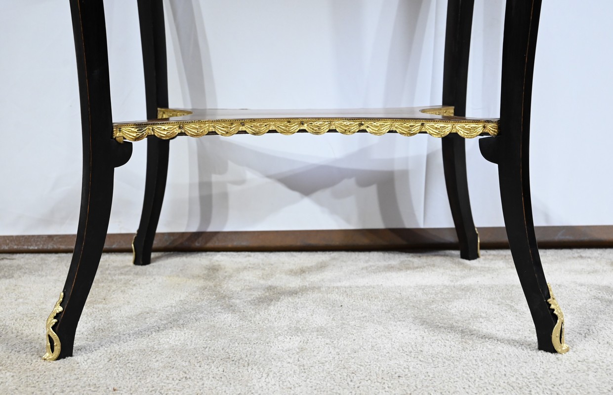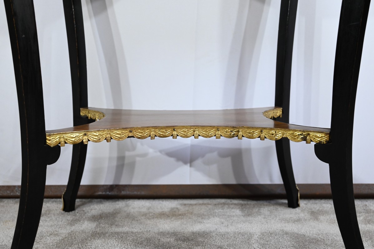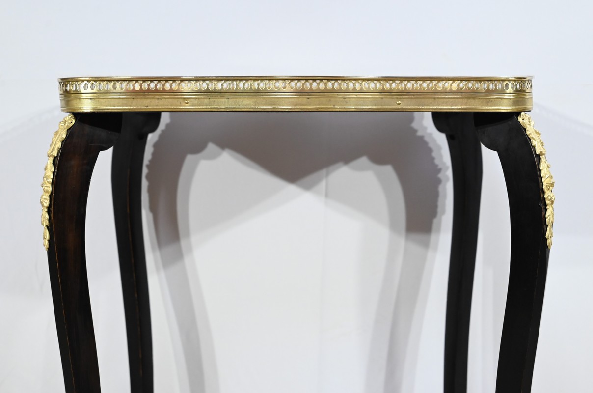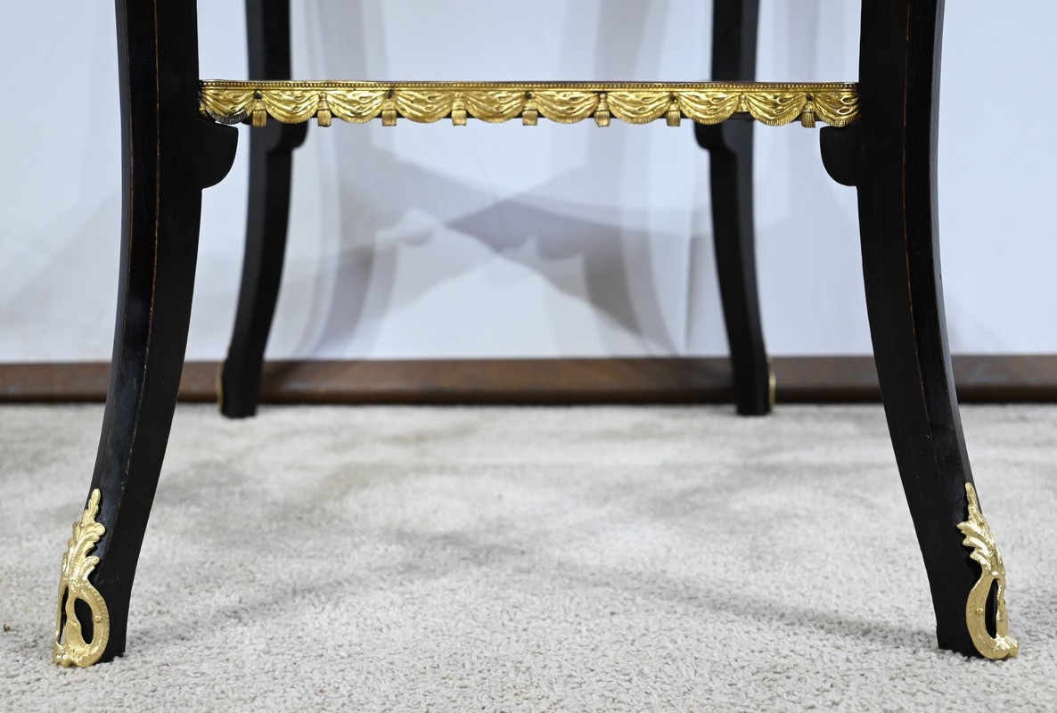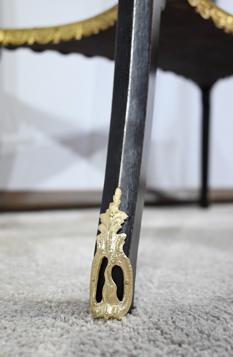 La tablette d’entretoise, aux côtés concaves, est habillée de baguettes laiton à motifs de draperie.