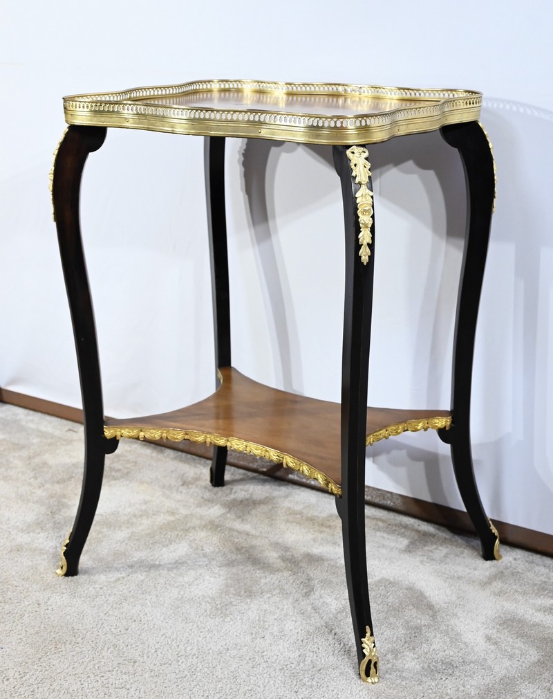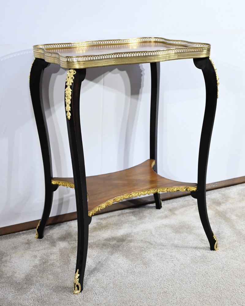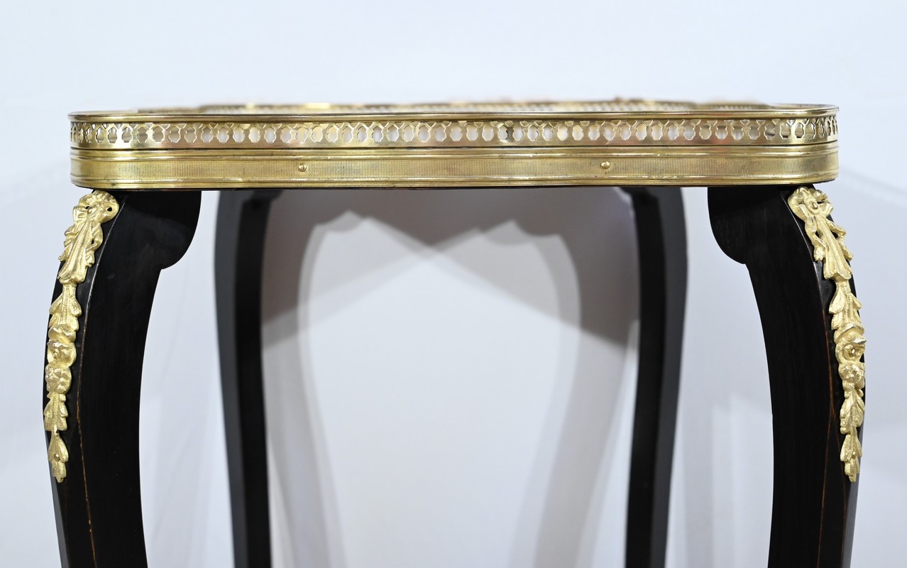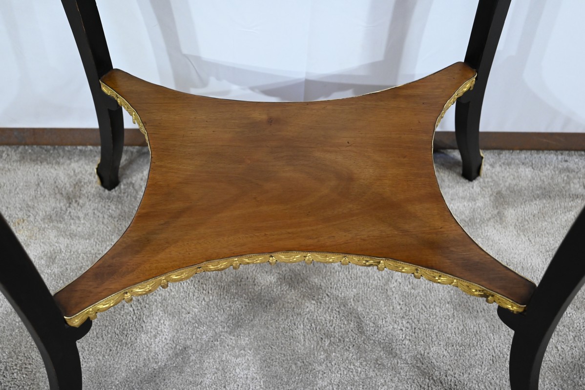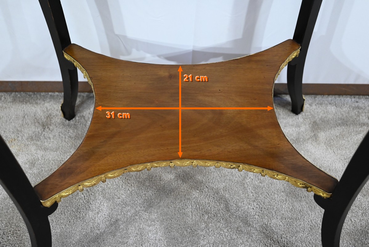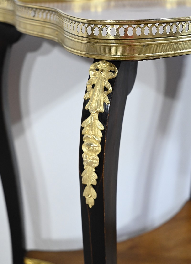 La tablette d’entretoise, aux côtés concaves, est habillée de baguettes laiton à motifs de draperie.