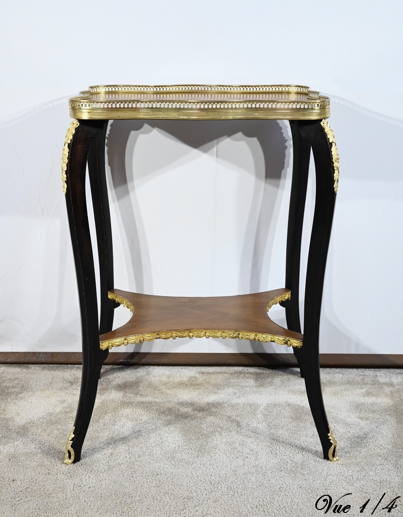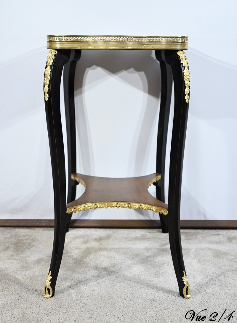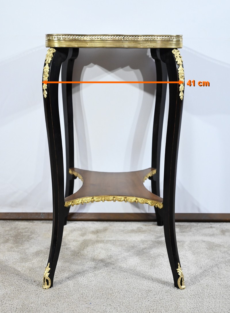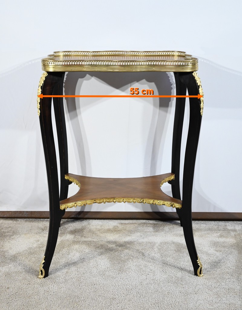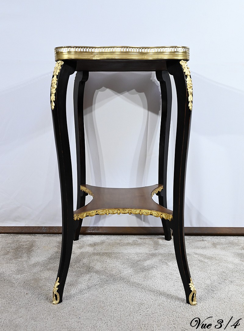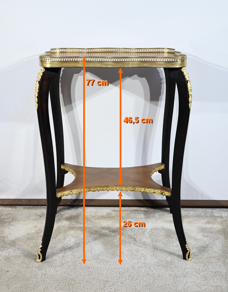 La tablette d’entretoise, aux côtés concaves, est habillée de baguettes laiton à motifs de draperie.