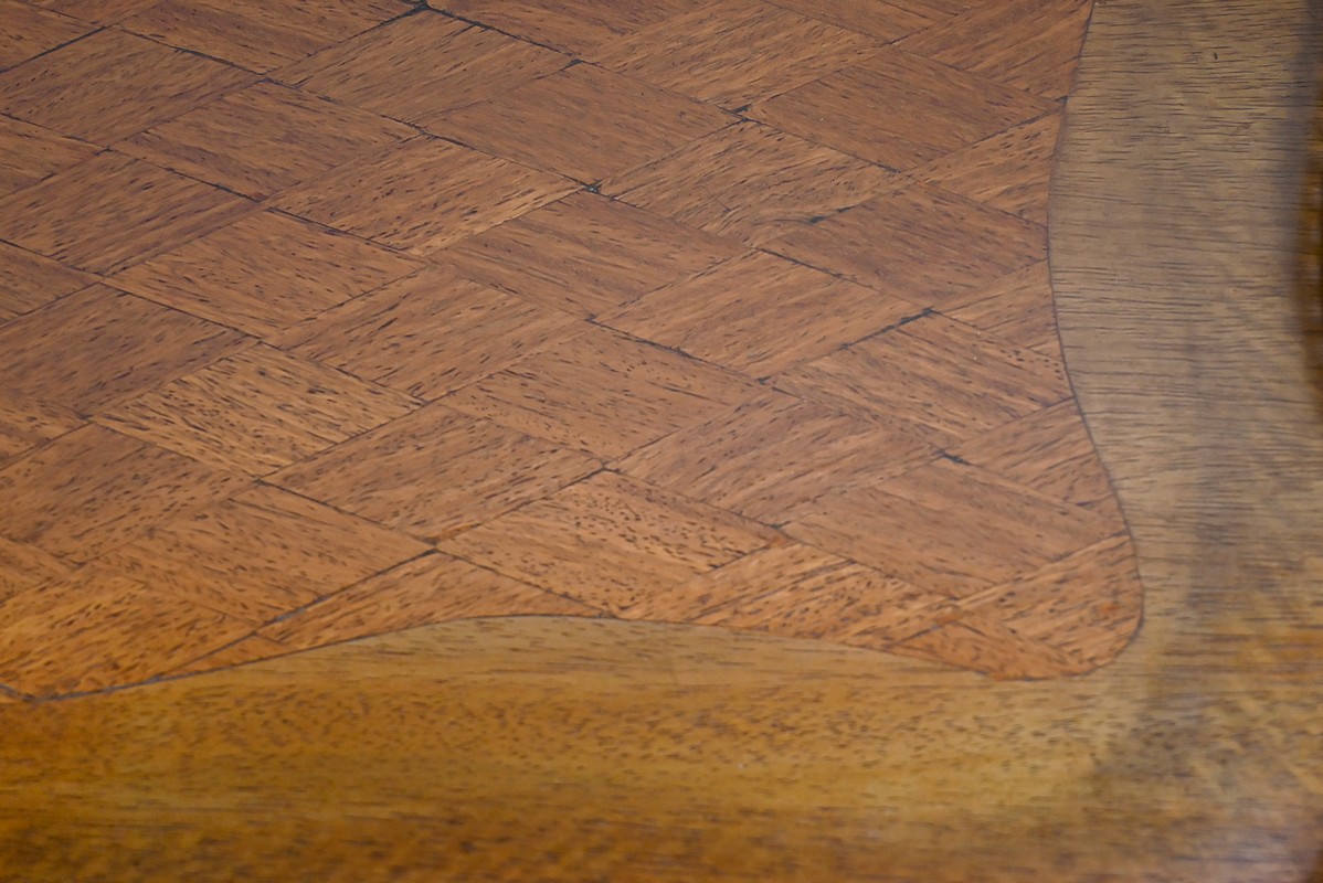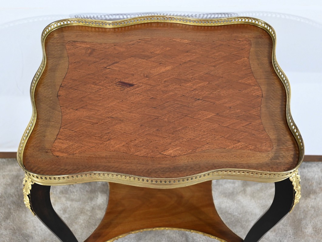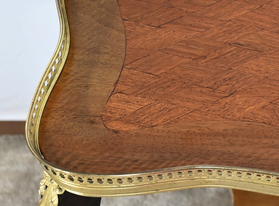 Cette petite table de salon présente un dessus mouvementé, en marqueterie d’acajou représentant de petits losanges, souligné part un entourage en acajou blond et une galerie ajourée et striée en laiton.