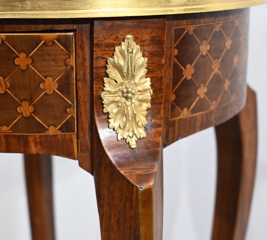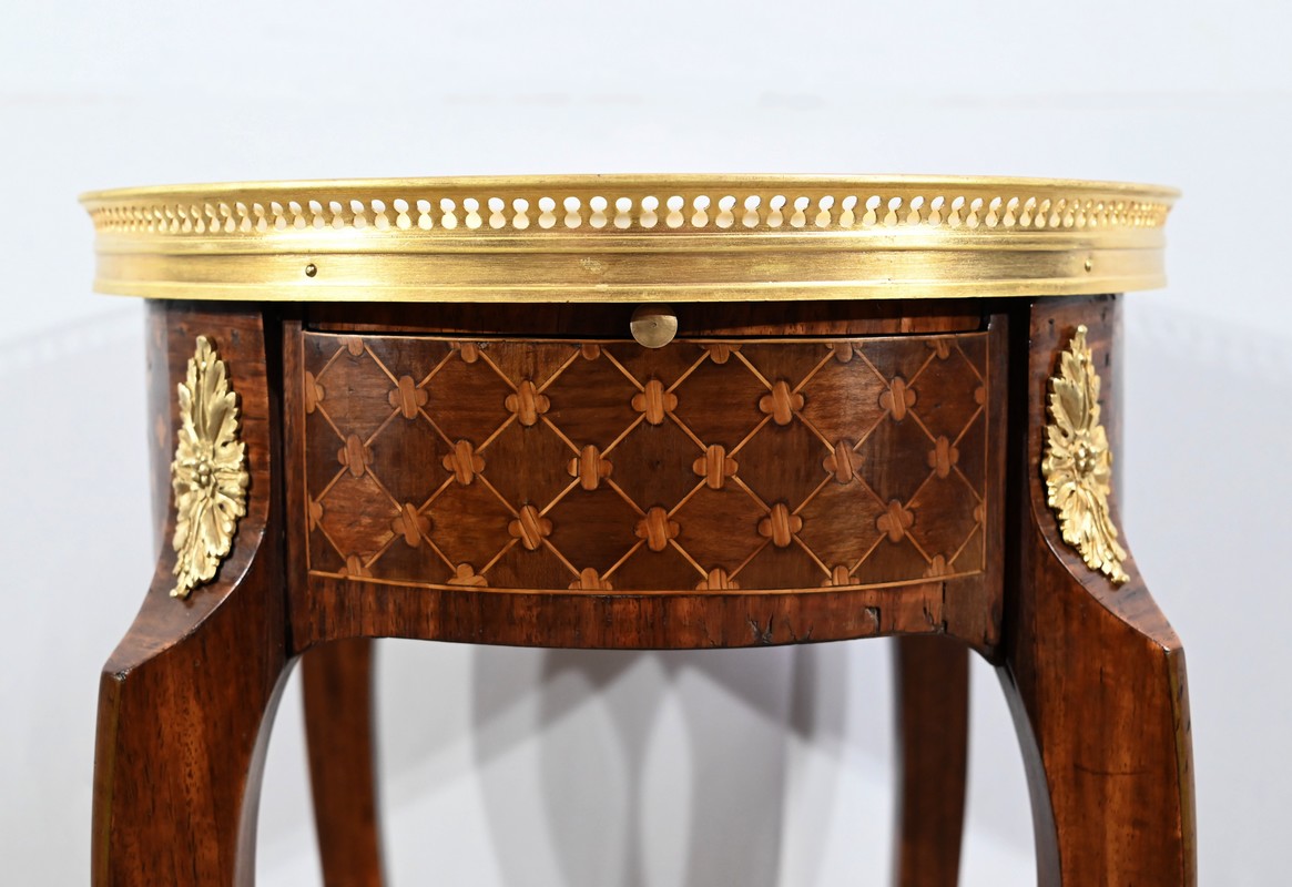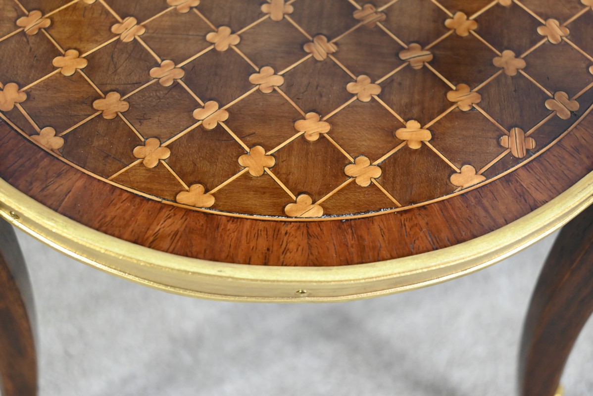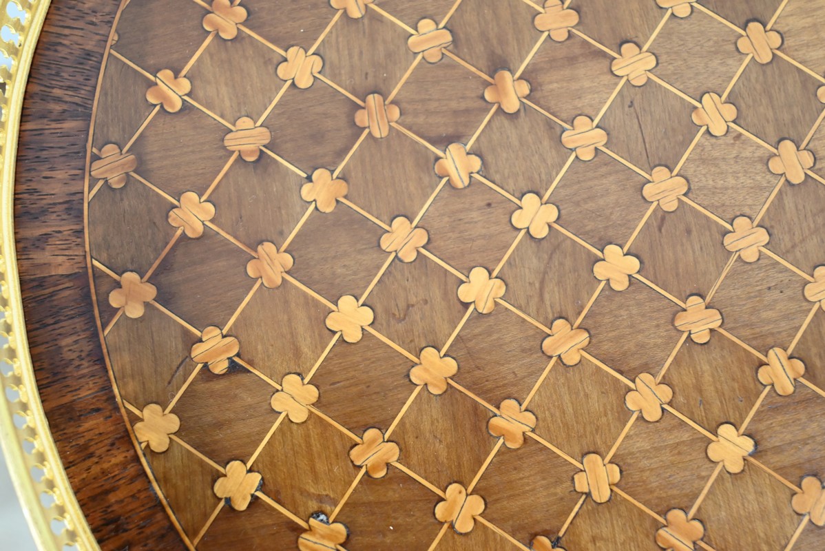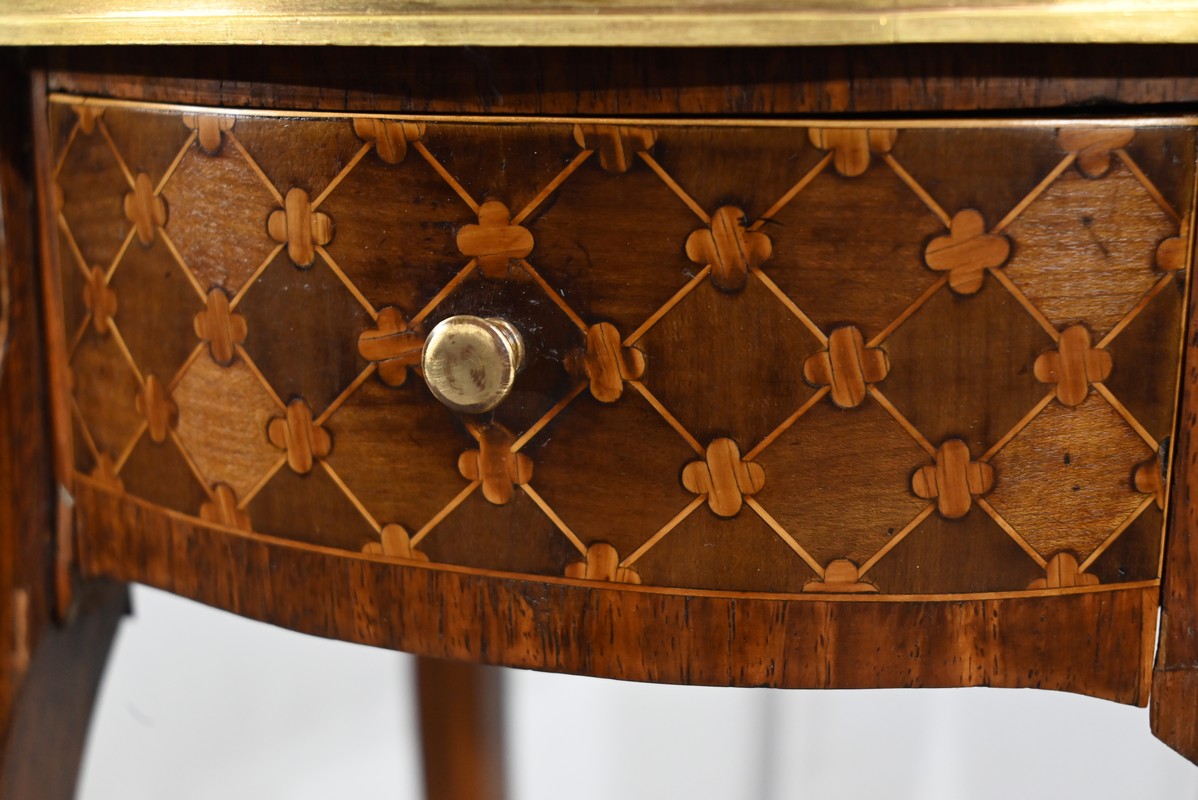 Table circulaire comportant en ceinture un tiroir à bouton laiton marqueté de losanges, de filets et de trèfles en placage de bois de rose et d’acajou.