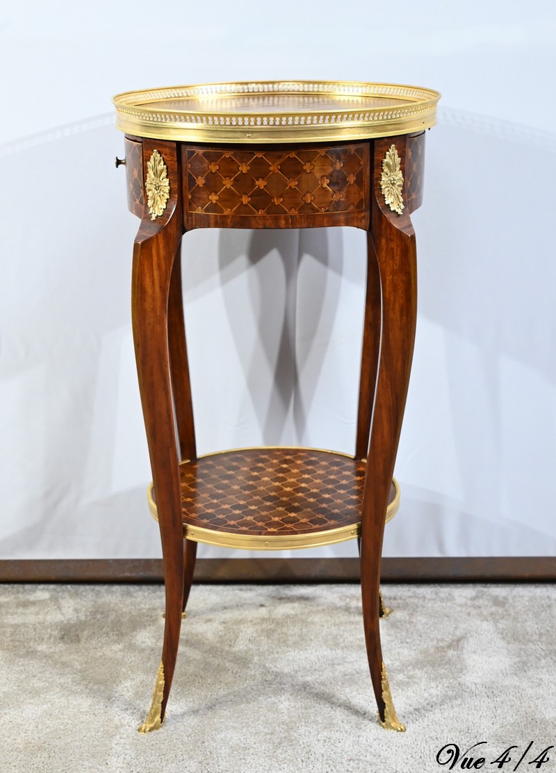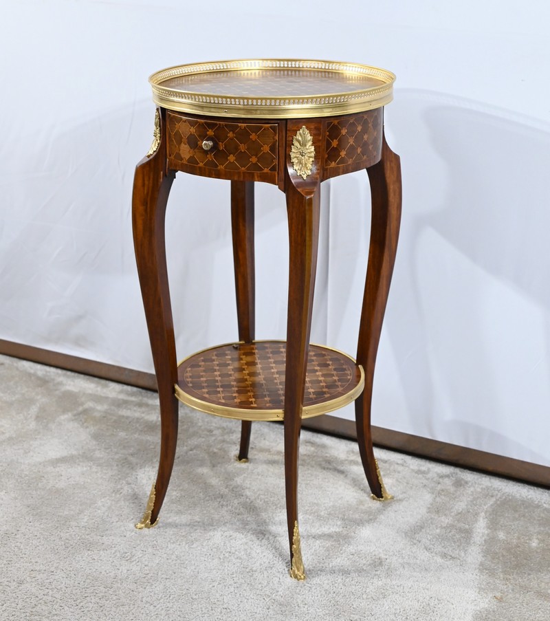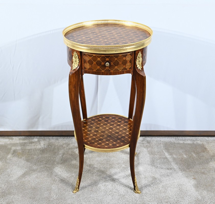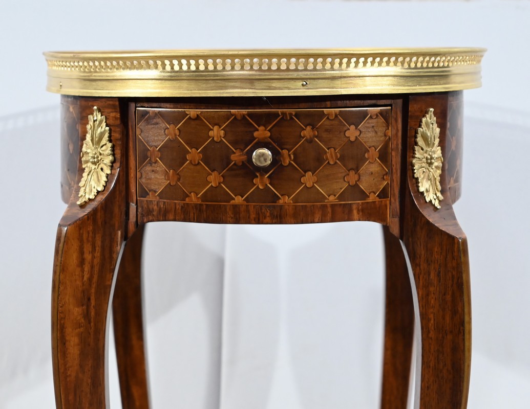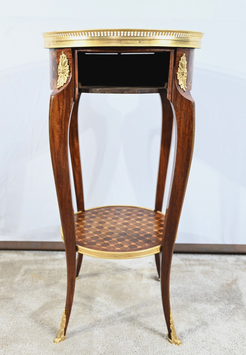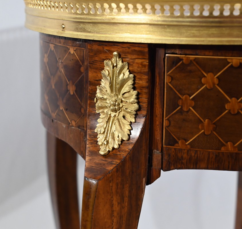 Table circulaire comportant en ceinture un tiroir à bouton laiton marqueté de losanges, de filets et de trèfles en placage de bois de rose et d’acajou.