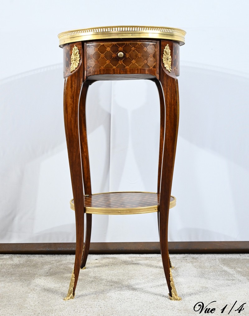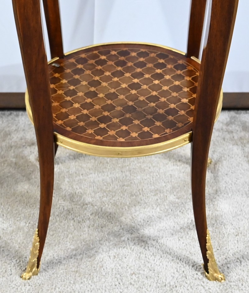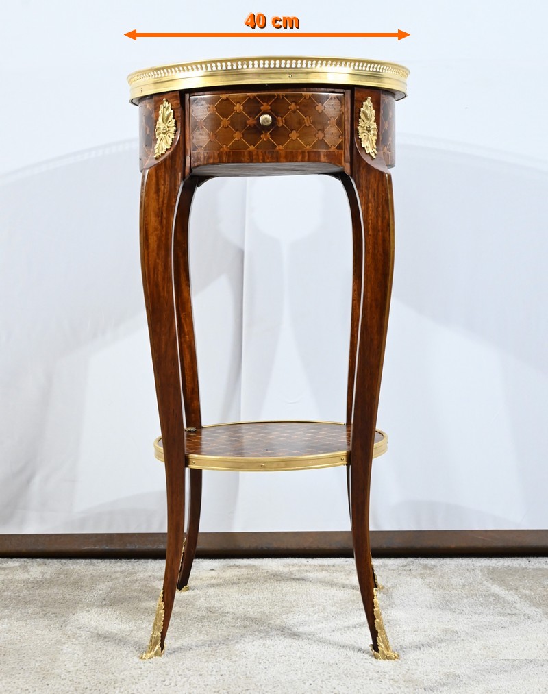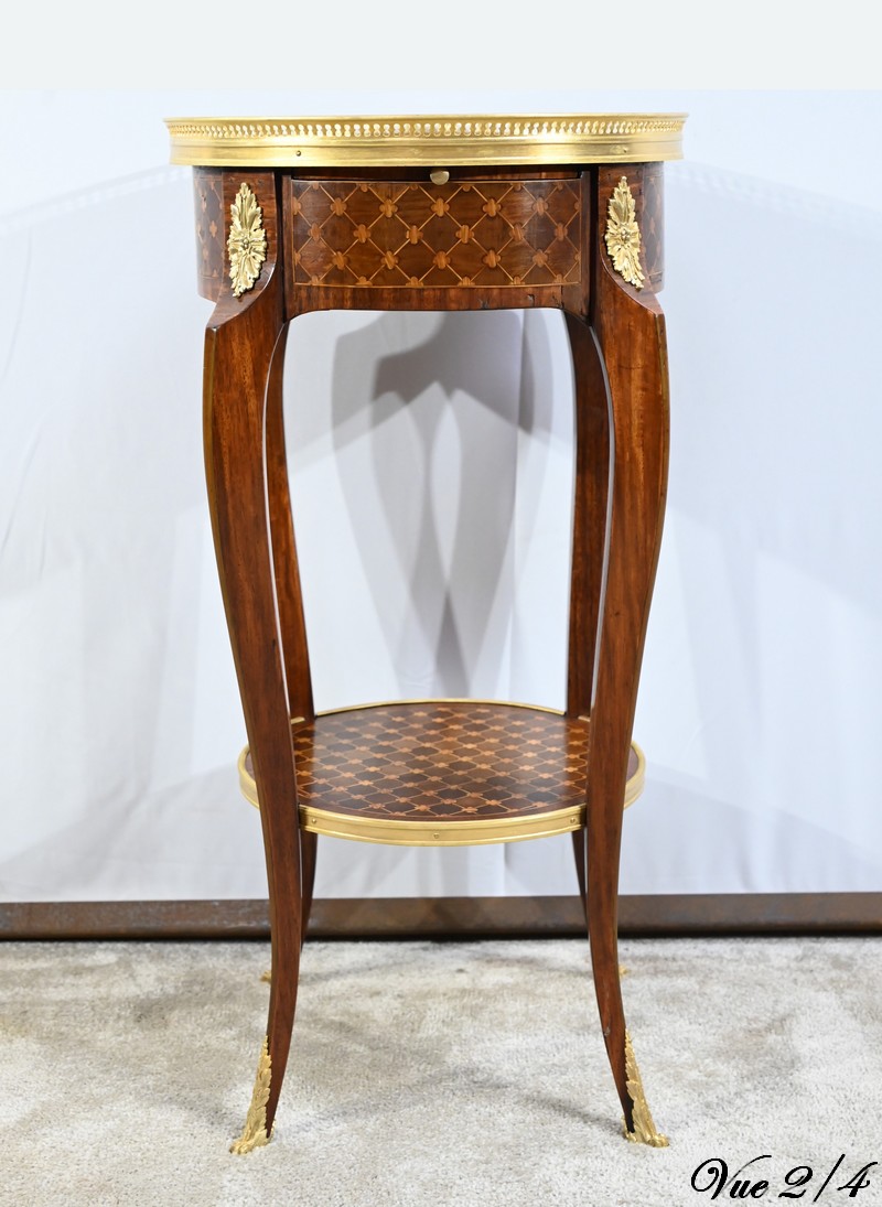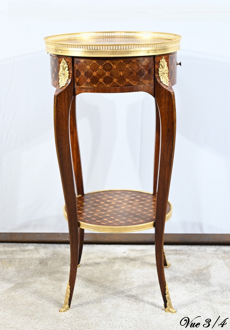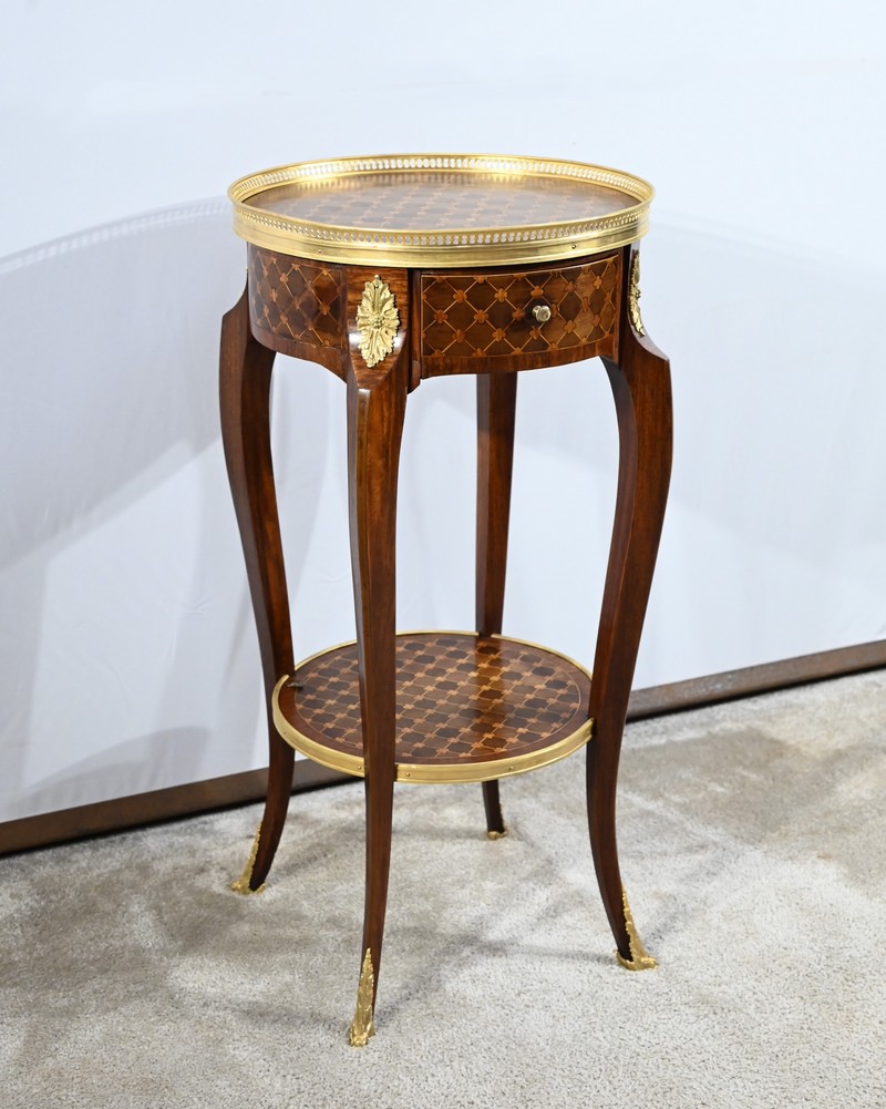 Table circulaire comportant en ceinture un tiroir à bouton laiton marqueté de losanges, de filets et de trèfles en placage de bois de rose et d’acajou.