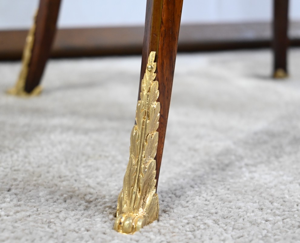 Ces éléments reposent sur quatre pieds galbés, à cinq facettes en acajou massif, agrémentés de chutes et de chaussons en bronze.