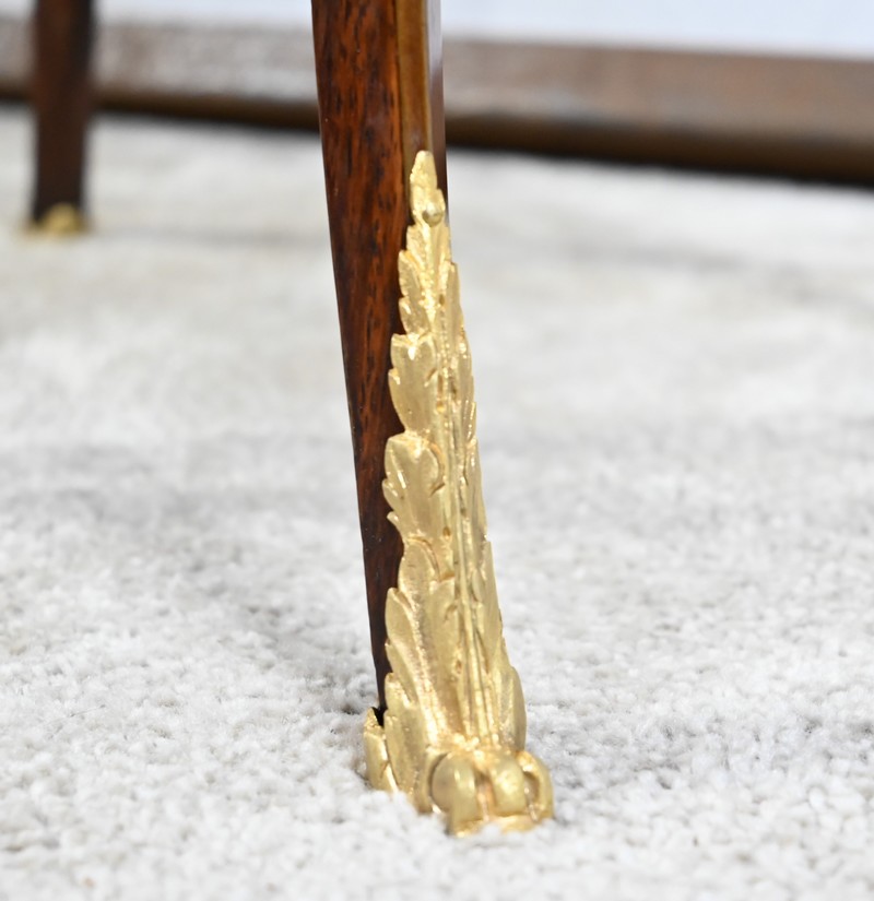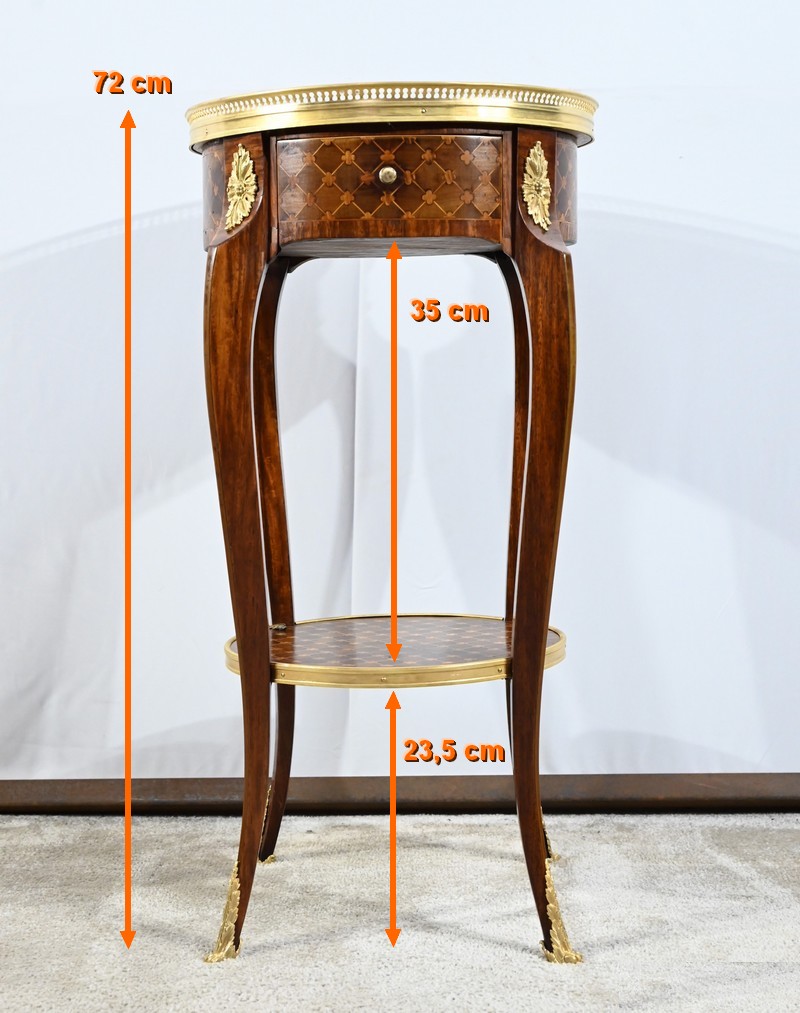 Le dessus, ceint d’une galerie ajourée et ciselée en laiton, offre une marqueterie similaire.