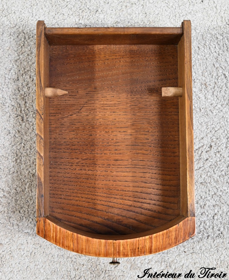 Le reste de cette ceinture présente une composition identique, l’autre face est agrémentée d’une tablette coulissante à encadrement en bois de rose foncé d’un cuir vert à vignette doré.
