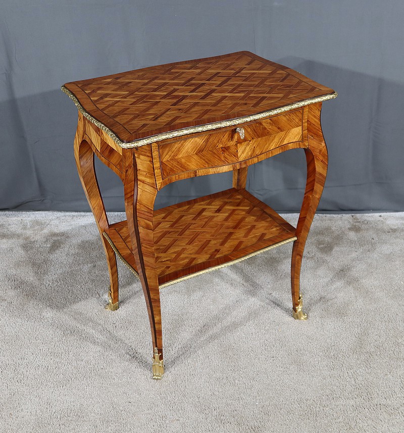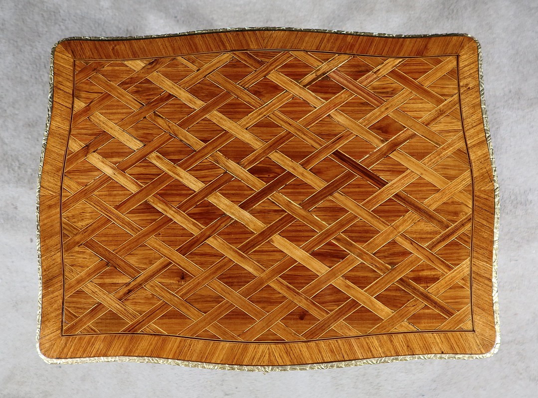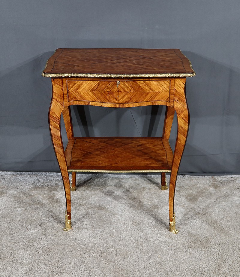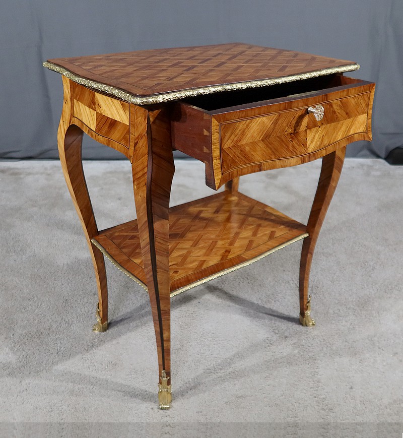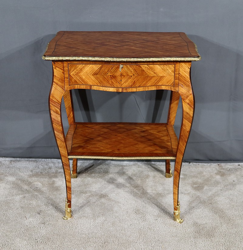 Petite table raffinée en marqueterie de bois de rose et de palissandre, ouvrant par un tiroir en ceinture. Ce dernier présente une façade dont le placage de bois de rose est disposé en ailes de papillon et entouré de filets de palissandre et de bois clair. La serrure est en état de fonctionnement et est accompagnée de sa clé ciselée. Les pieds de ce petit mobilier sont galbés et présentent des arêtes en palissandre soulignant la marqueterie de bois de rose disposée en diagonale. Ces pieds se terminent par des sabots volutés en bronze. Le dessus de cette table de salon légèrement mouvementé est orné d’une composition de bois de rose travaillé en losanges avec entrelacements de bandes de différentes nuances et filets de bois clair. Ce décor est entouré d’un filet de palissandre lui-même cerné de bois de rose disposé en diagonale pour augmenter le contraste. Le pourtour de ce plateau est agrémenté d’une lingotière en bronze sculptée de motifs végétaux. Une tablette d’entre-deux relie les quatre pieds. Elle reprend la même composition d’ouvrage que le dessus avec marqueterie et lingotière affinée.