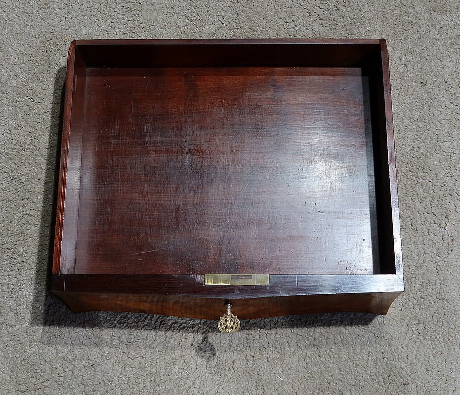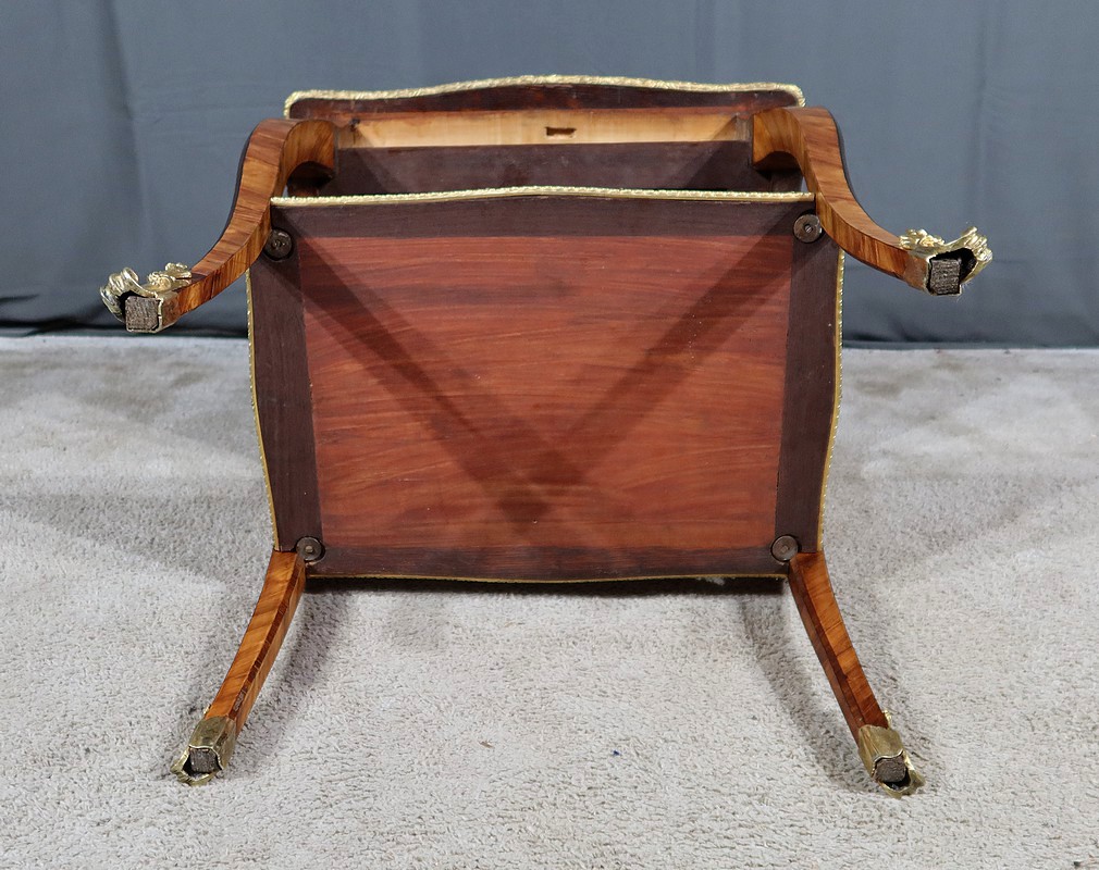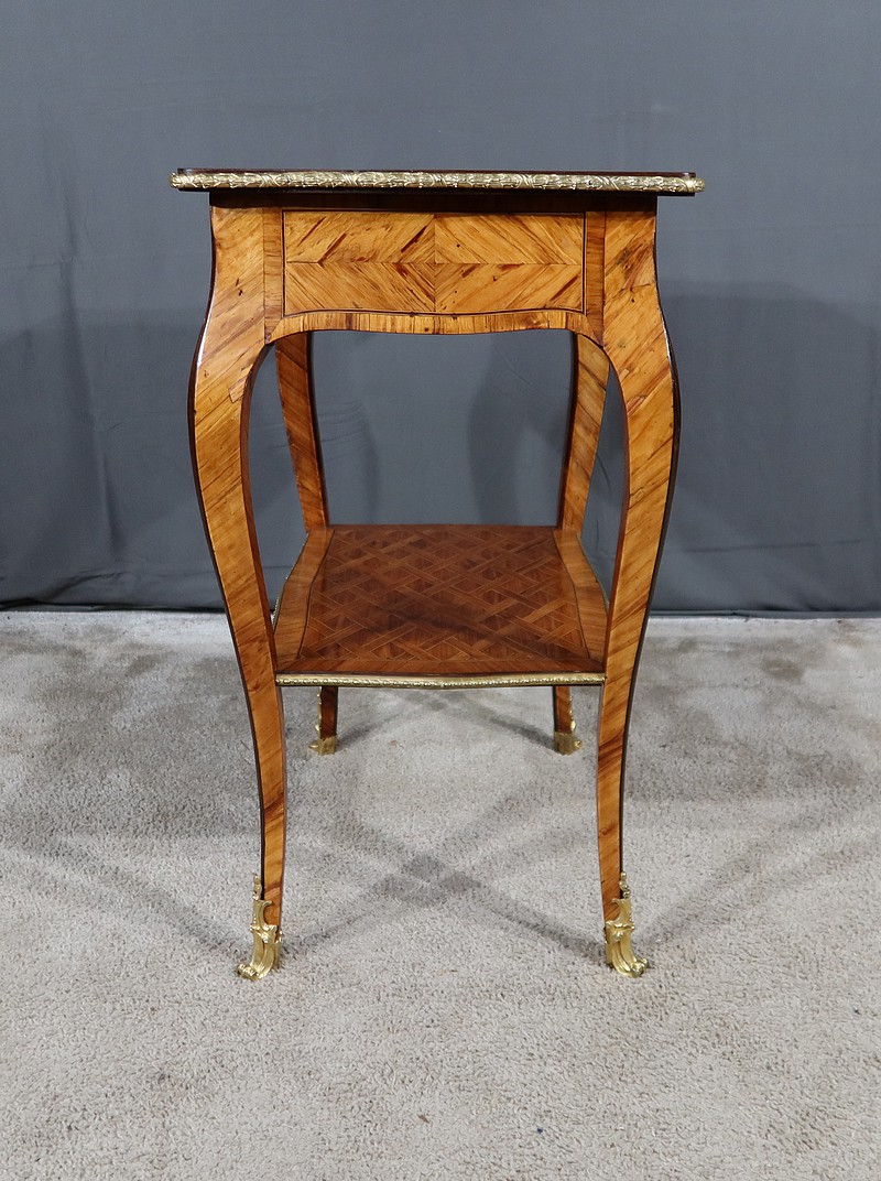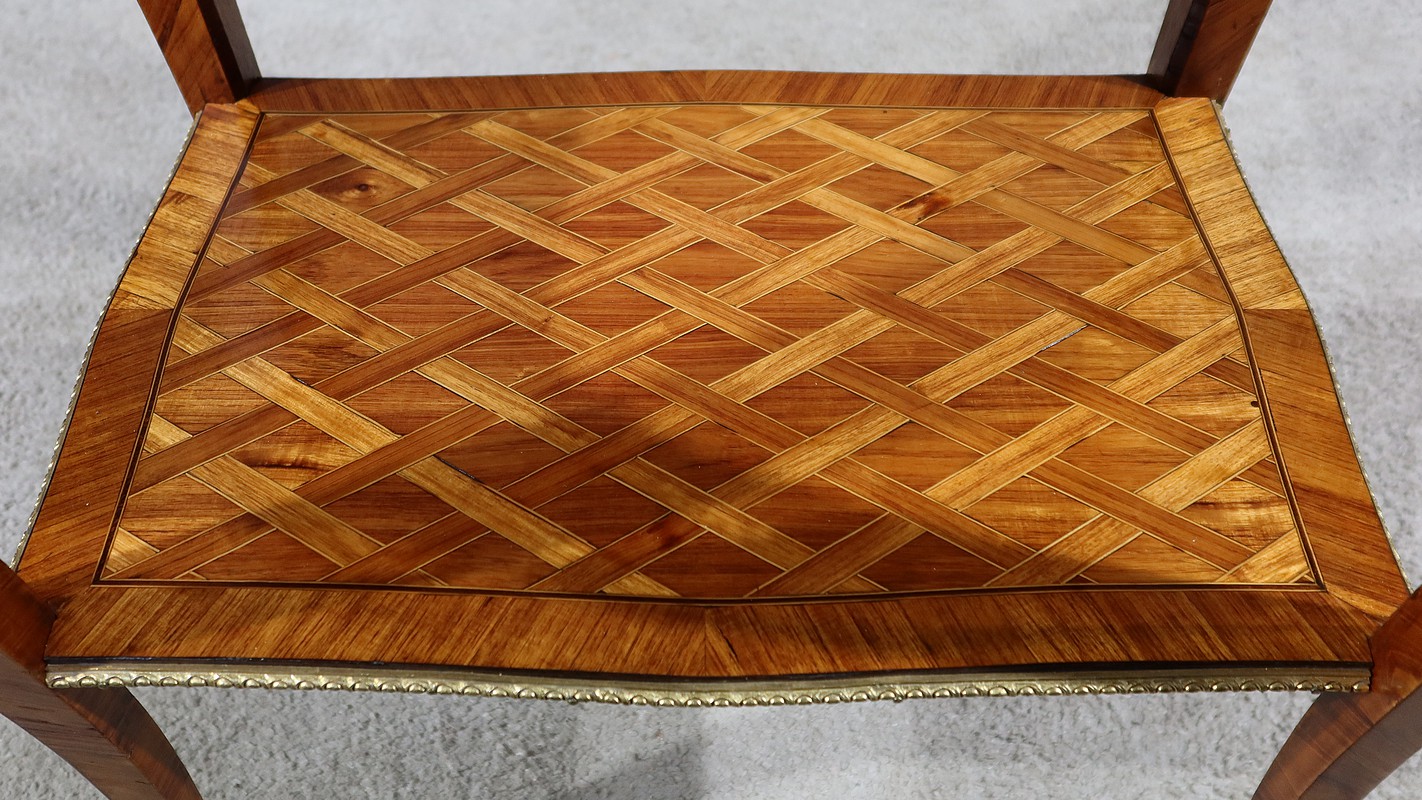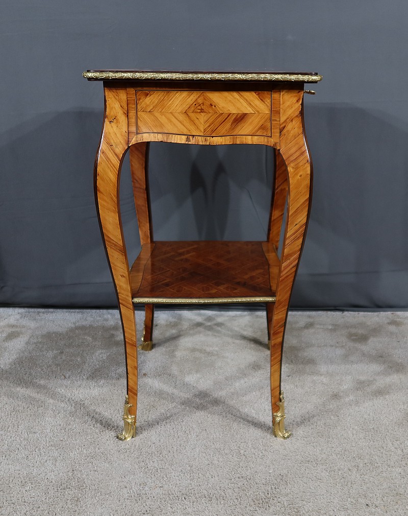 Petite table raffinée en marqueterie de bois de rose et de palissandre, ouvrant par un tiroir en ceinture. Ce dernier présente une façade dont le placage de bois de rose est disposé en ailes de papillon et entouré de filets de palissandre et de bois clair. La serrure est en état de fonctionnement et est accompagnée de sa clé ciselée. Les pieds de ce petit mobilier sont galbés et présentent des arêtes en palissandre soulignant la marqueterie de bois de rose disposée en diagonale. Ces pieds se terminent par des sabots volutés en bronze. Le dessus de cette table de salon légèrement mouvementé est orné d’une composition de bois de rose travaillé en losanges avec entrelacements de bandes de différentes nuances et filets de bois clair. Ce décor est entouré d’un filet de palissandre lui-même cerné de bois de rose disposé en diagonale pour augmenter le contraste. Le pourtour de ce plateau est agrémenté d’une lingotière en bronze sculptée de motifs végétaux. Une tablette d’entre-deux relie les quatre pieds. Elle reprend la même composition d’ouvrage que le dessus avec marqueterie et lingotière affinée.