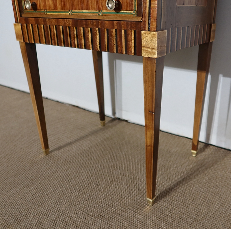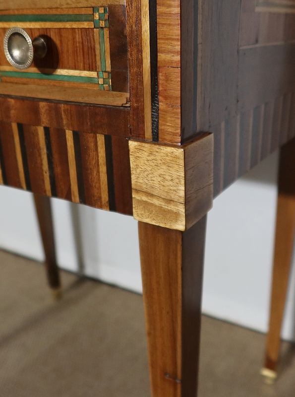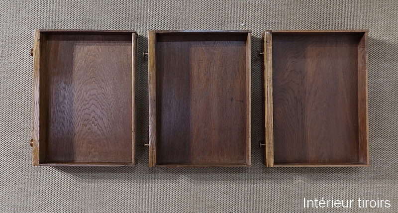 Cet élégant mobilier ouvre en façade par trois tiroirs en marqueterie. Chacun présente un centre de bois de rose entouré de filets de bois clair et de bois teinté, garnis de cabochons carrés. A chaque extrémité des tiroirs, deux boutons de tirage à cuvette et en laiton sont agrémentés d’un contour strié. L’intérieur et les côtés des tiroirs sont en chêne.
