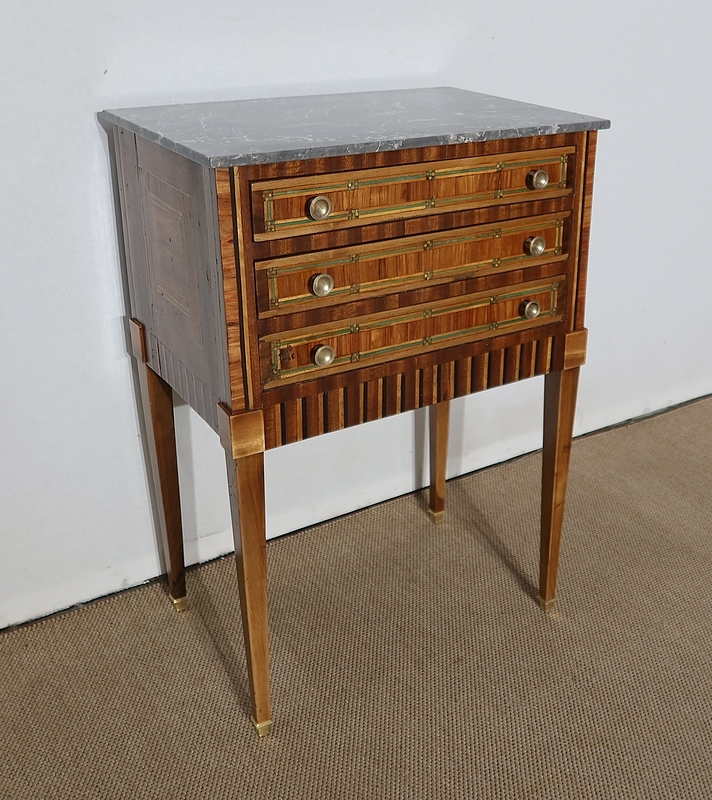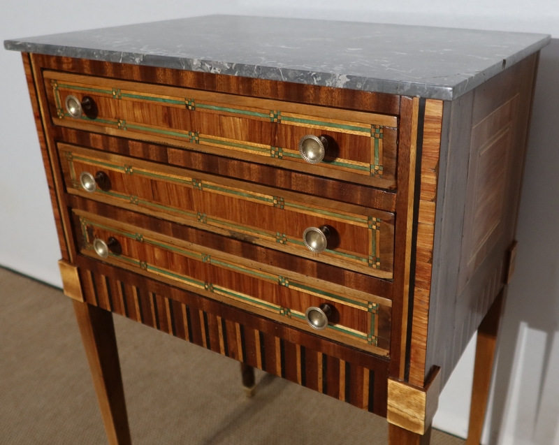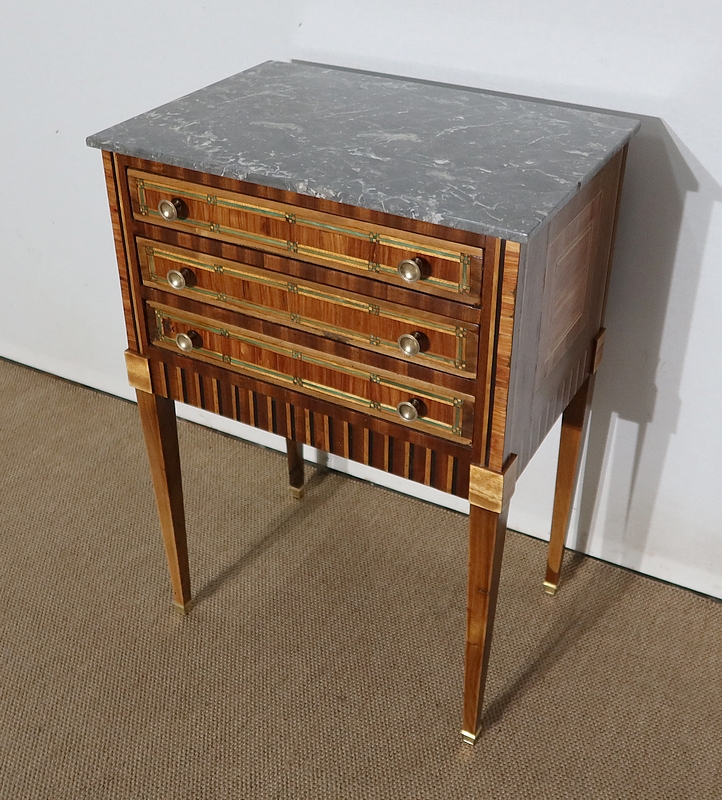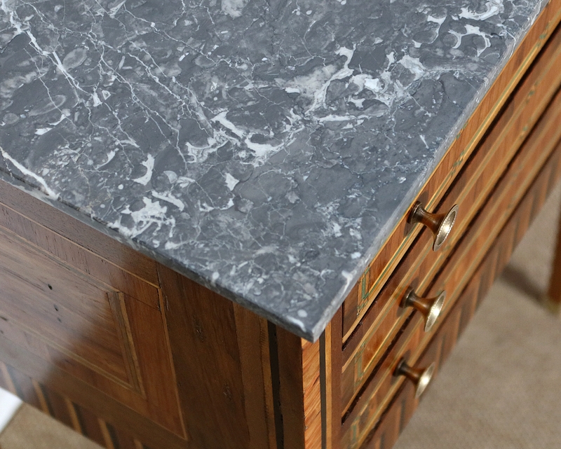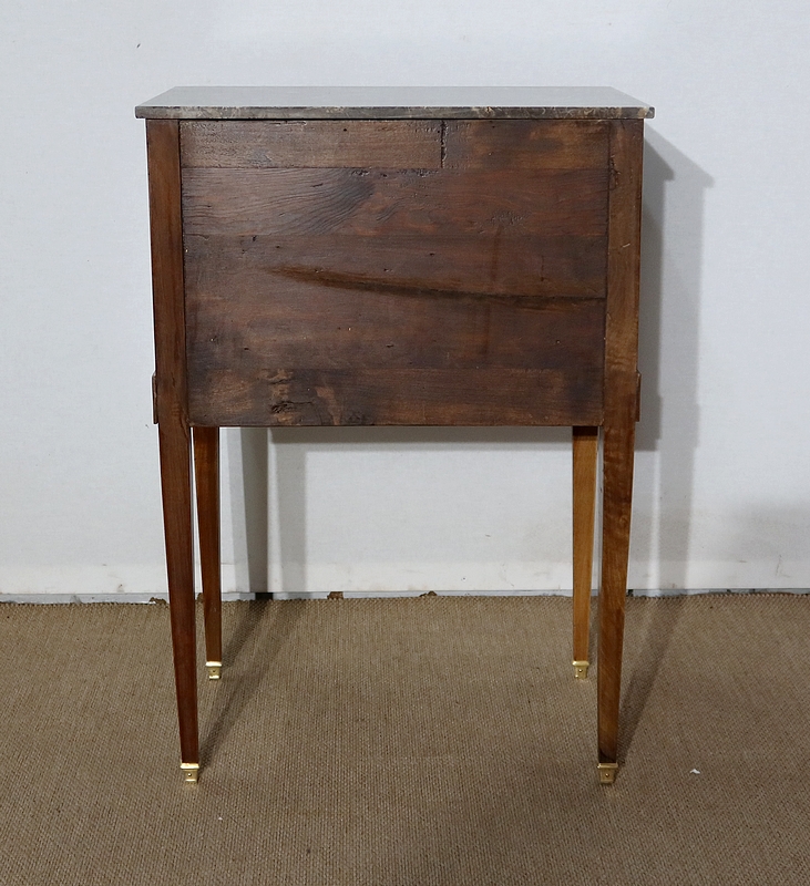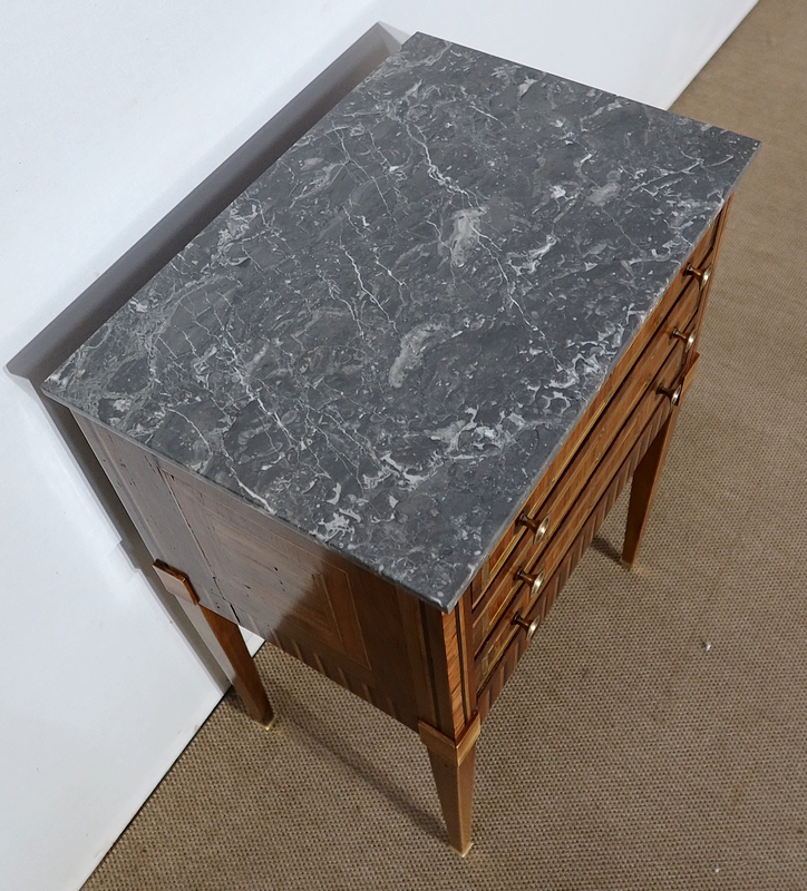 Belle petite table Louis XVI en bois précieux sommée d’un marbre d’origine de couleur grise, veiné de blanc.