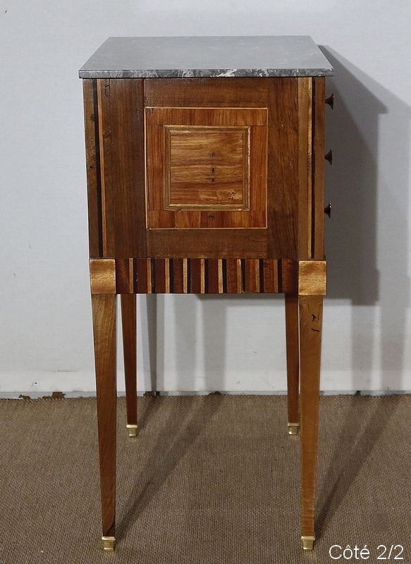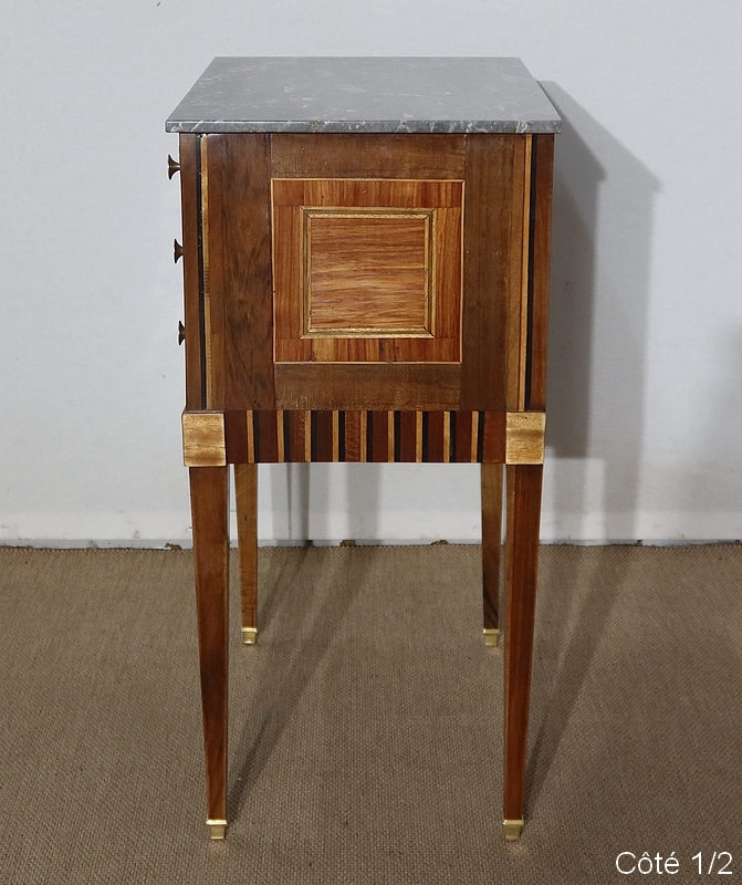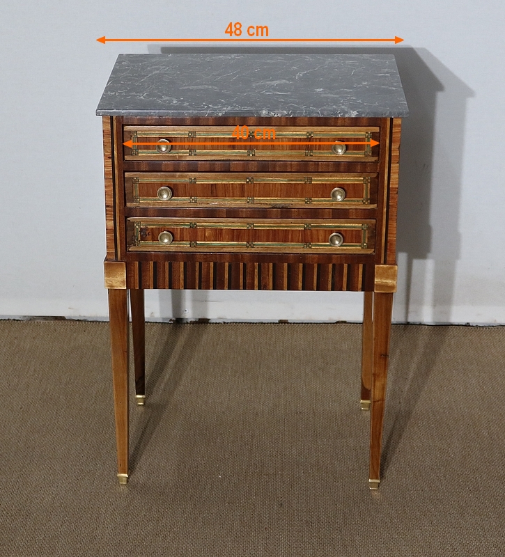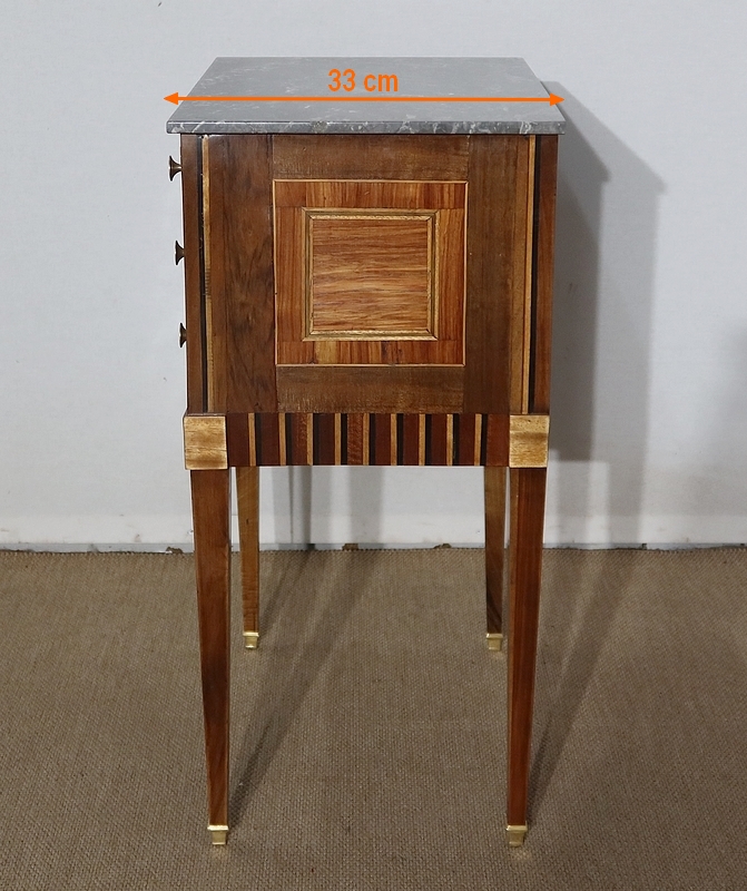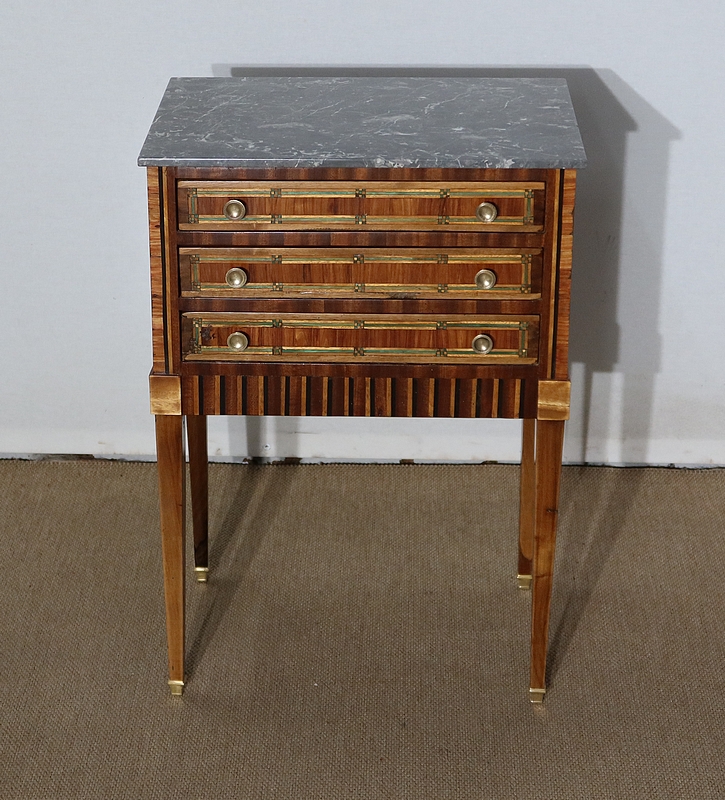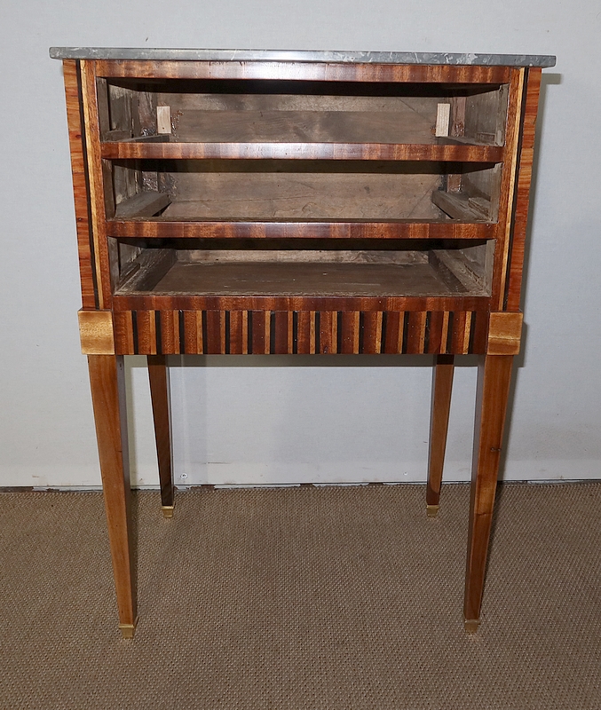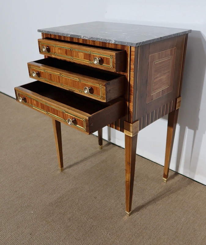 Belle petite table Louis XVI en bois précieux sommée d’un marbre d’origine de couleur grise, veiné de blanc.