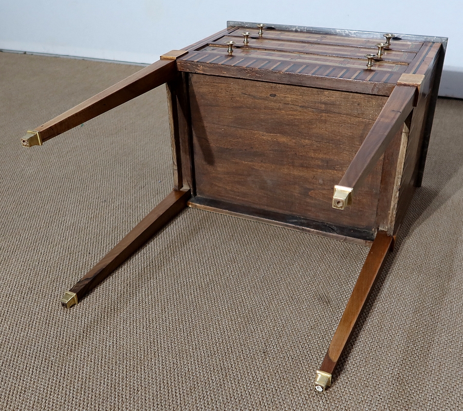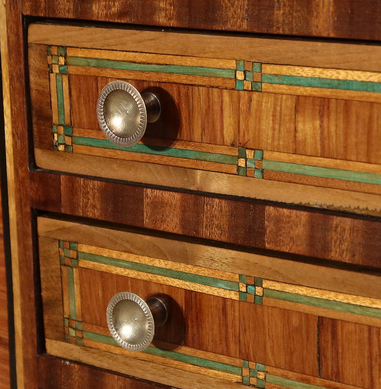 Sur les côtés de ce petit meuble nous retrouvons une composition centrale de bois de rose, entourée de filets de couleur foncé et de bois clair. Et une traverse dans le même esprit que la façade.