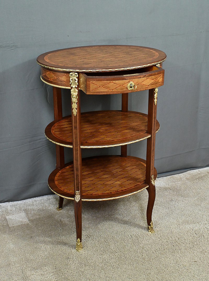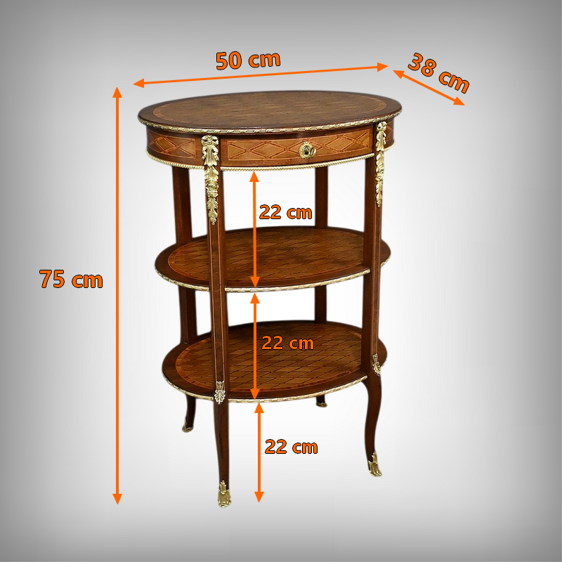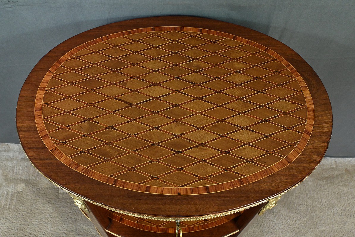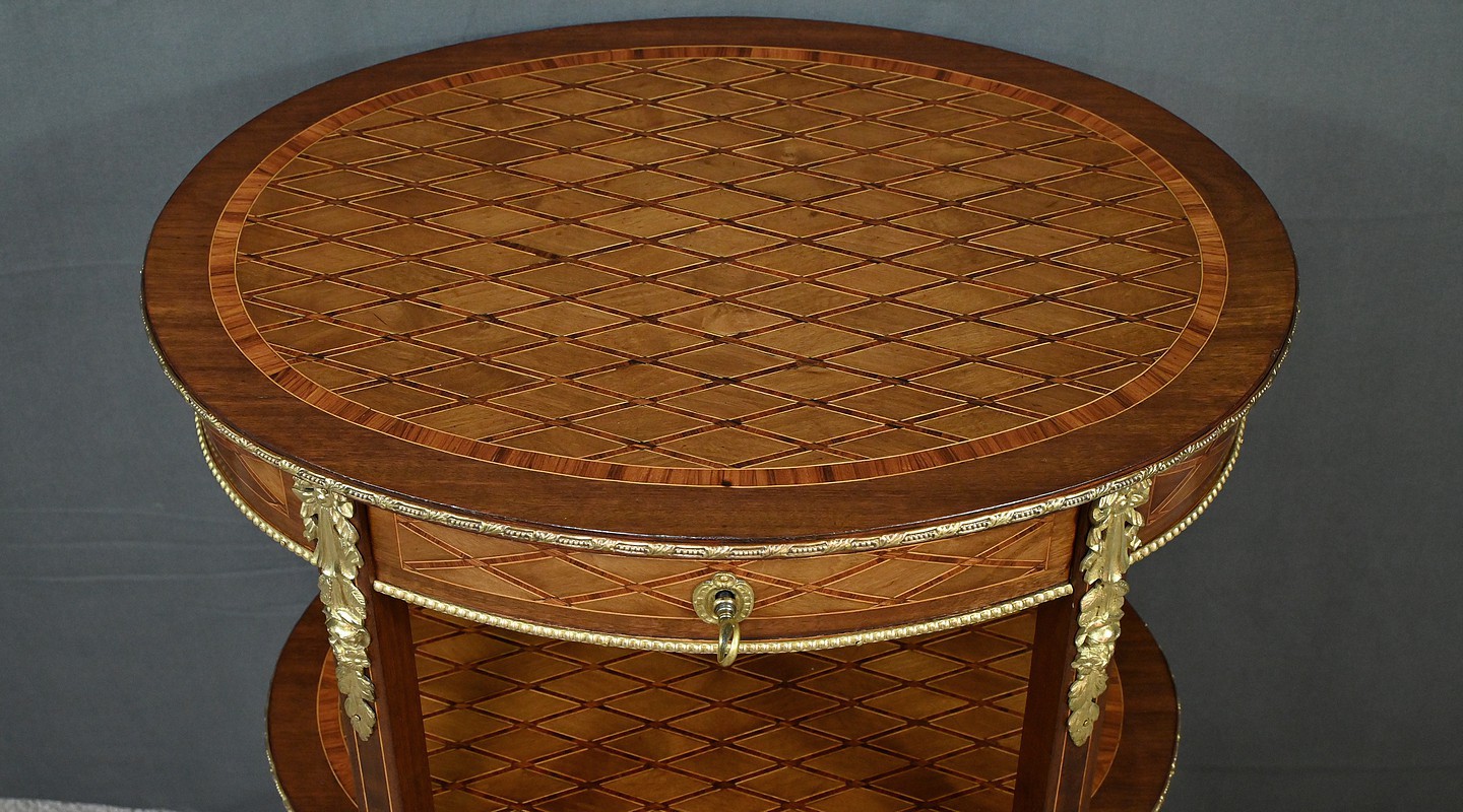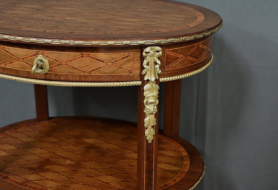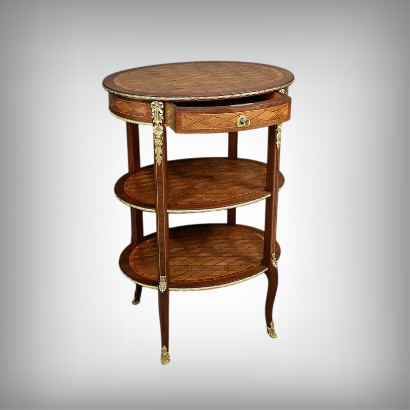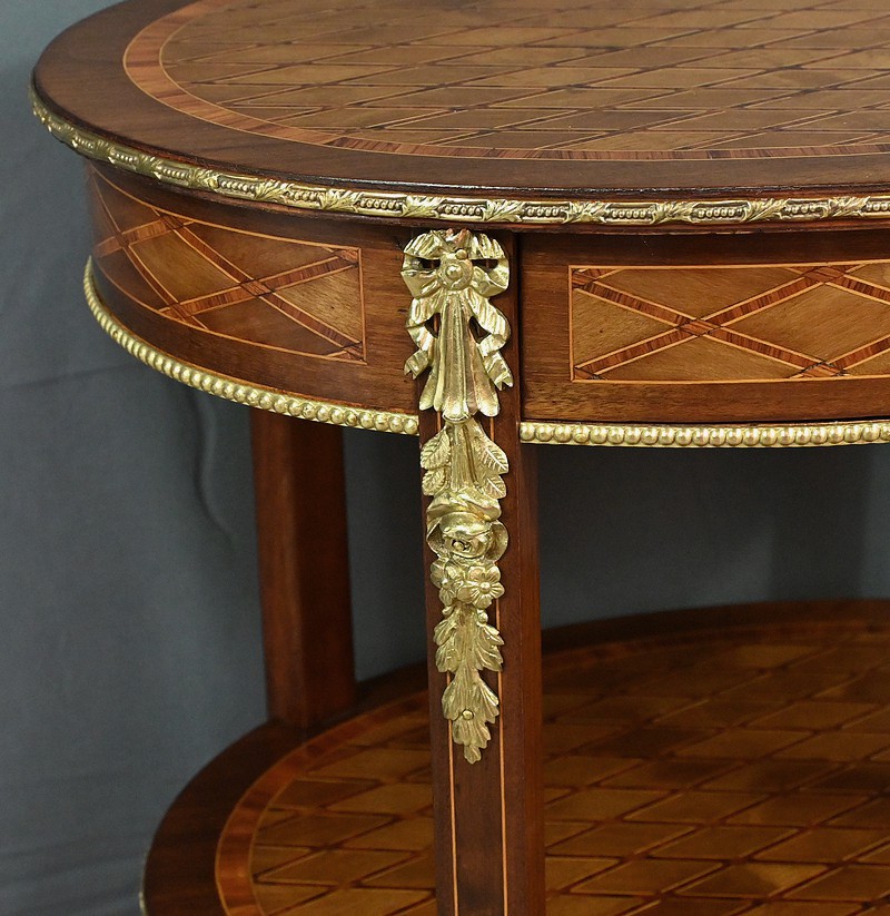 Élégante petite table en Acajou et marqueterie de palissandre et de bois de rose, de style Transition Louis XV – Louis XVI, datant du XIXe siècle. Son plateau ovale, richement décoré d’un motif en losange, est ceint d’une baguette en bronze finement ciselée de perles et de feuilles d’acanthe. Elle ouvre en ceinture par un tiroir doté d’une serrure en état de fonctionnement, d’une entrée en bronze finement travaillée et de sa clé. Les montants sont ornés de délicates chutes florales enrubannées. Les pieds galbés en partie basse, terminés par des sabots en bronze, sont réunis par deux tablettes d’entrejambe, apportant à l’ensemble une touche d’équilibre et de raffinement.