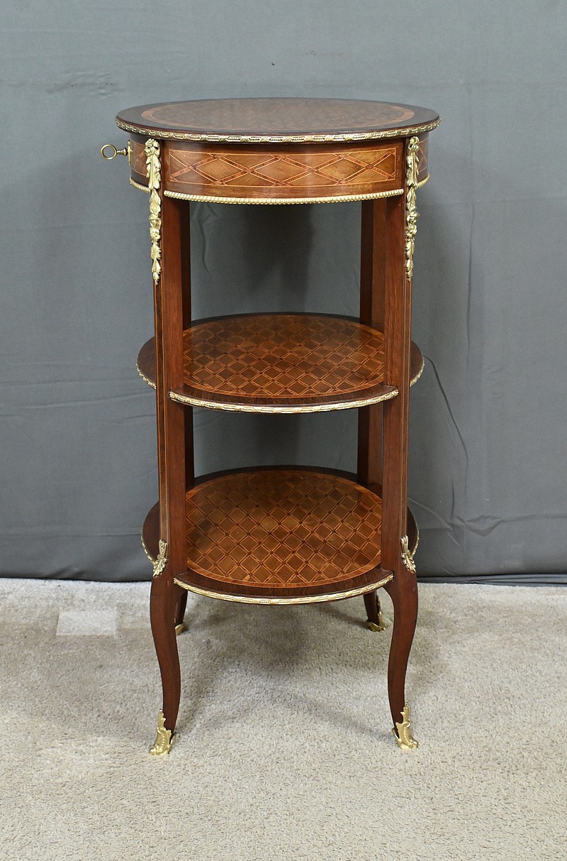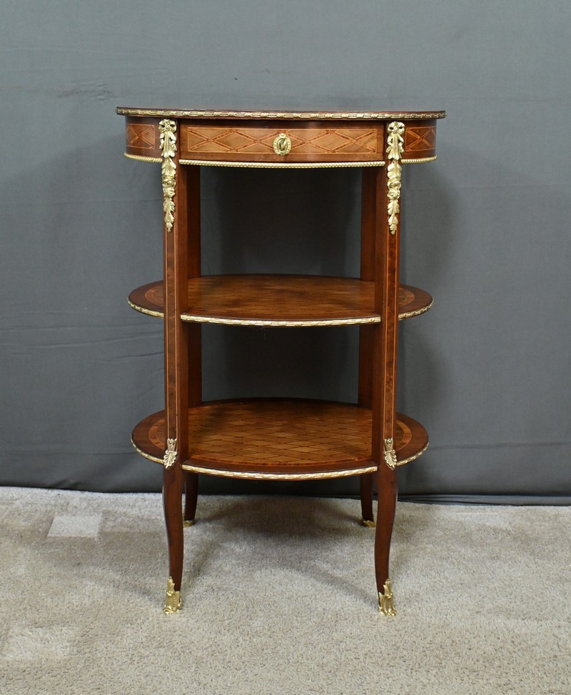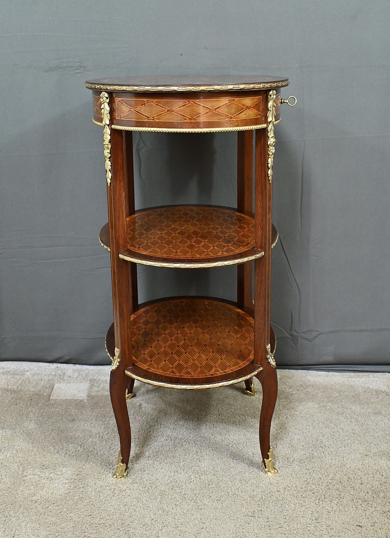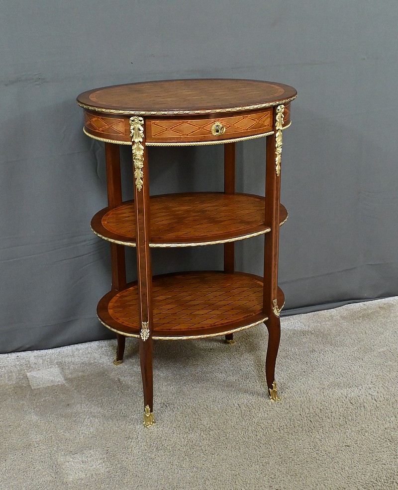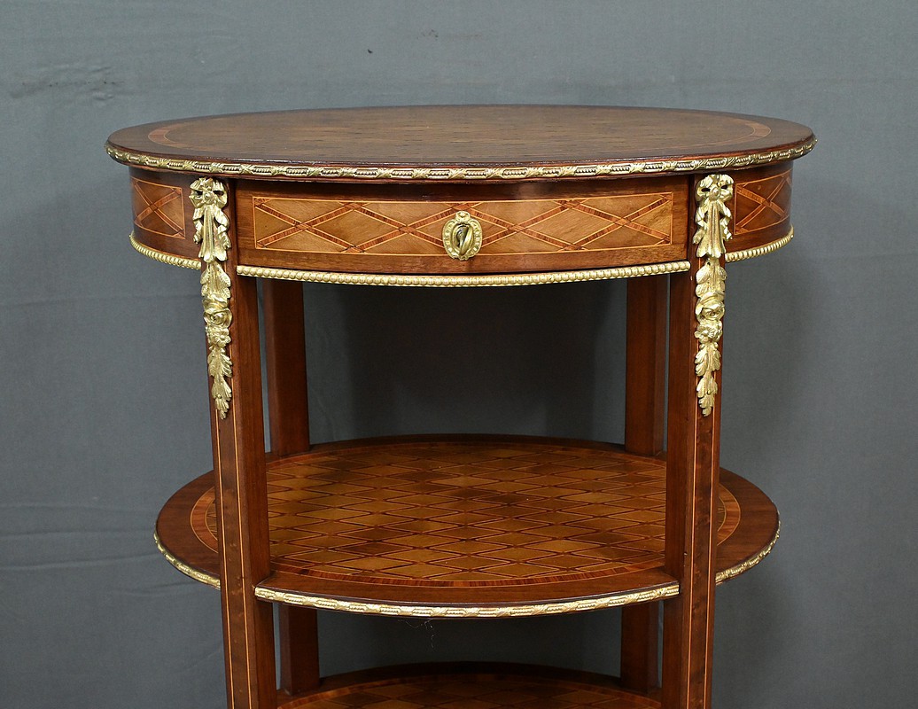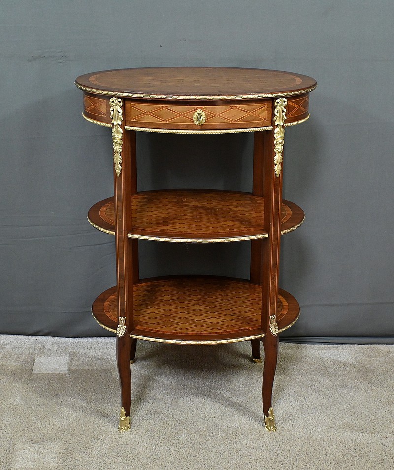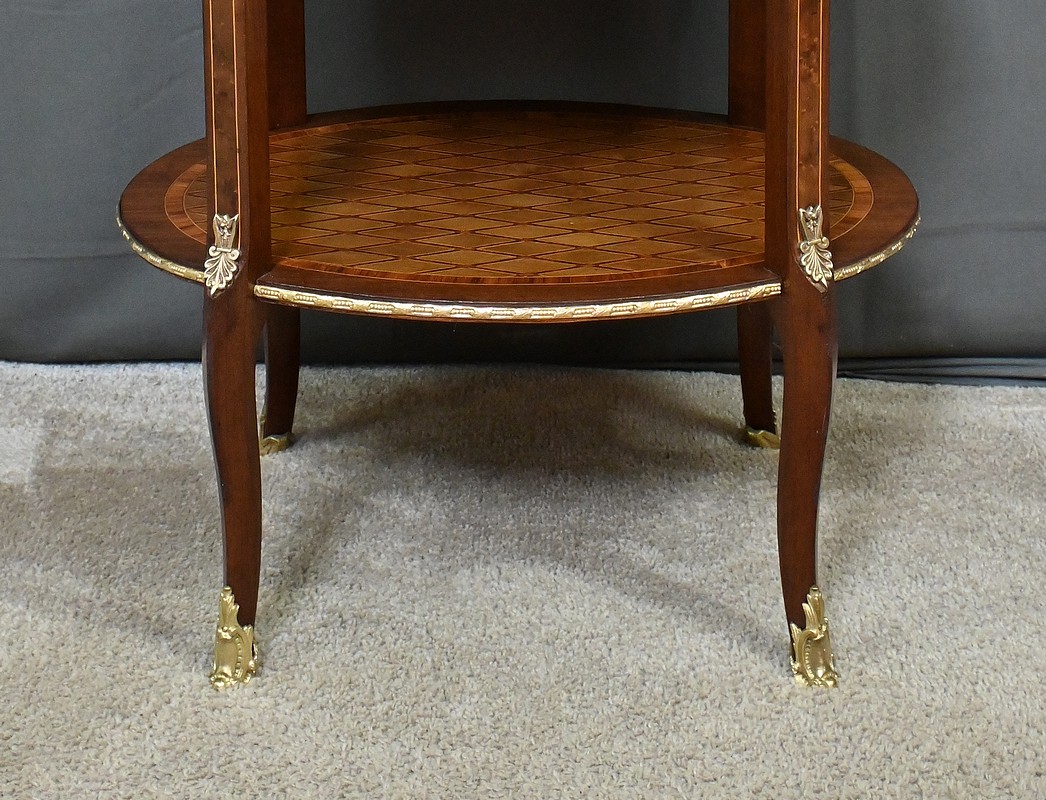 Élégante petite table en Acajou et marqueterie de palissandre et de bois de rose, de style Transition Louis XV – Louis XVI, datant du XIXe siècle. Son plateau ovale, richement décoré d’un motif en losange, est ceint d’une baguette en bronze finement ciselée de perles et de feuilles d’acanthe. Elle ouvre en ceinture par un tiroir doté d’une serrure en état de fonctionnement, d’une entrée en bronze finement travaillée et de sa clé. Les montants sont ornés de délicates chutes florales enrubannées. Les pieds galbés en partie basse, terminés par des sabots en bronze, sont réunis par deux tablettes d’entrejambe, apportant à l’ensemble une touche d’équilibre et de raffinement.