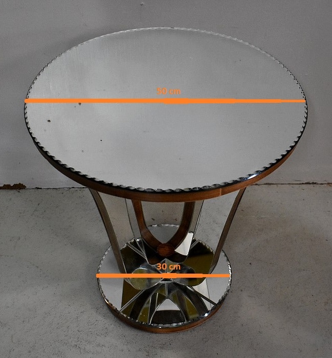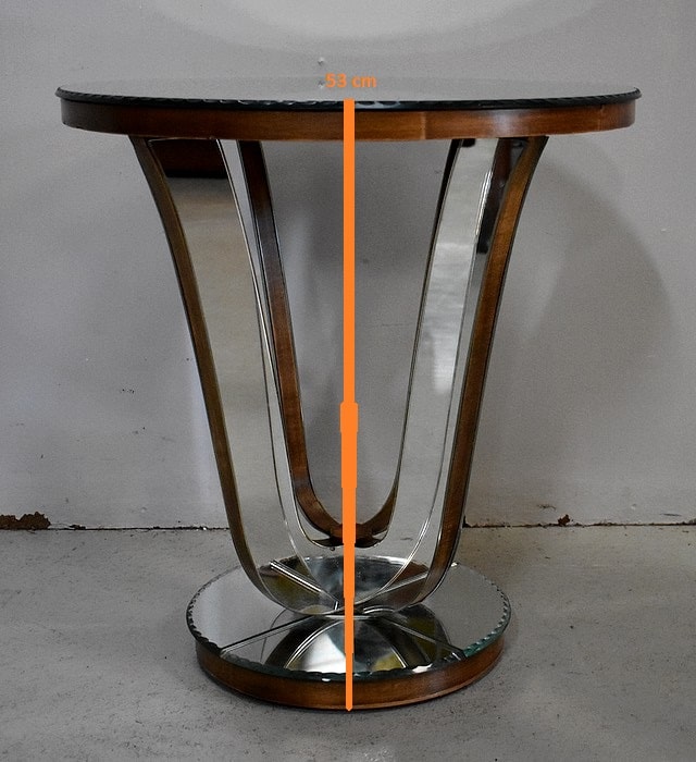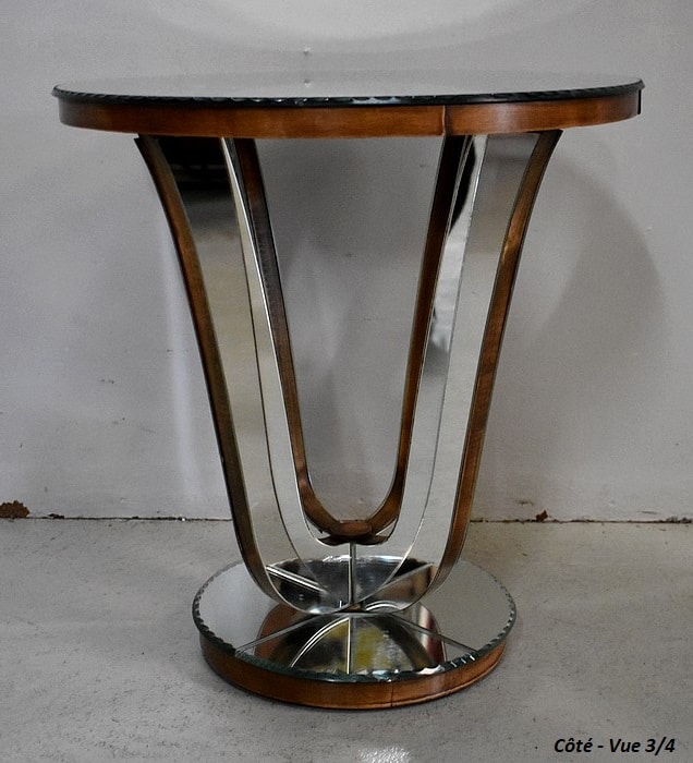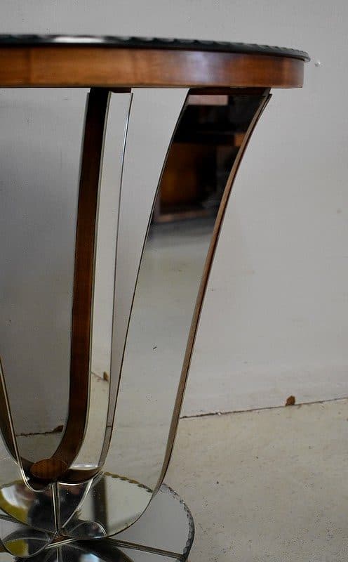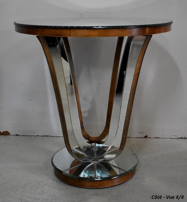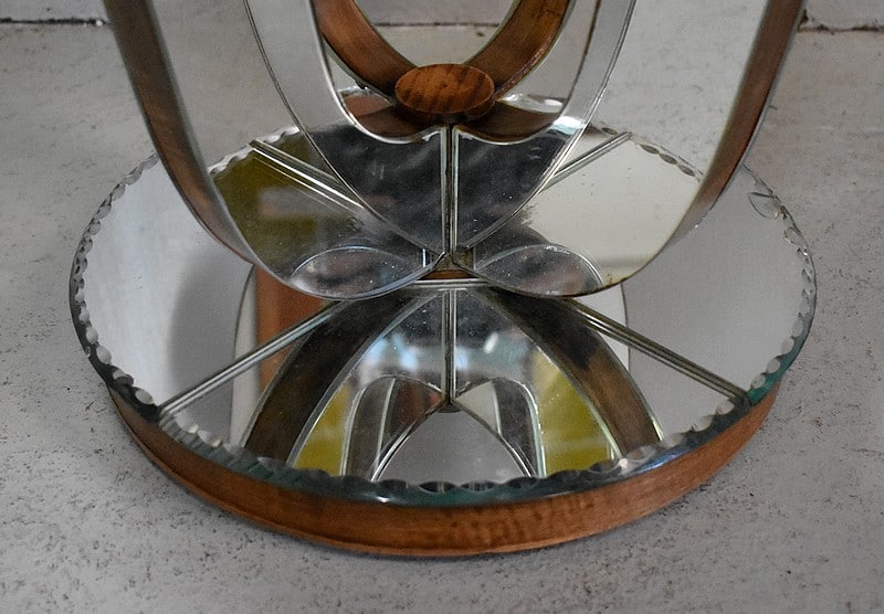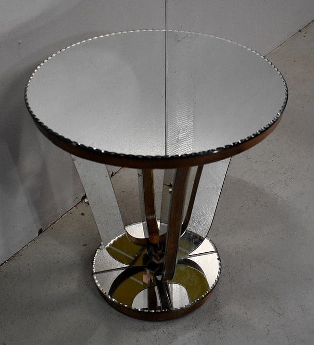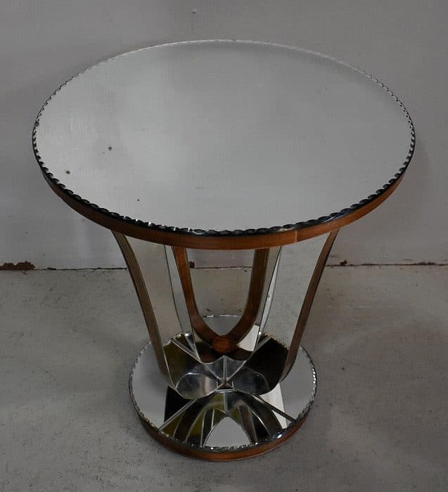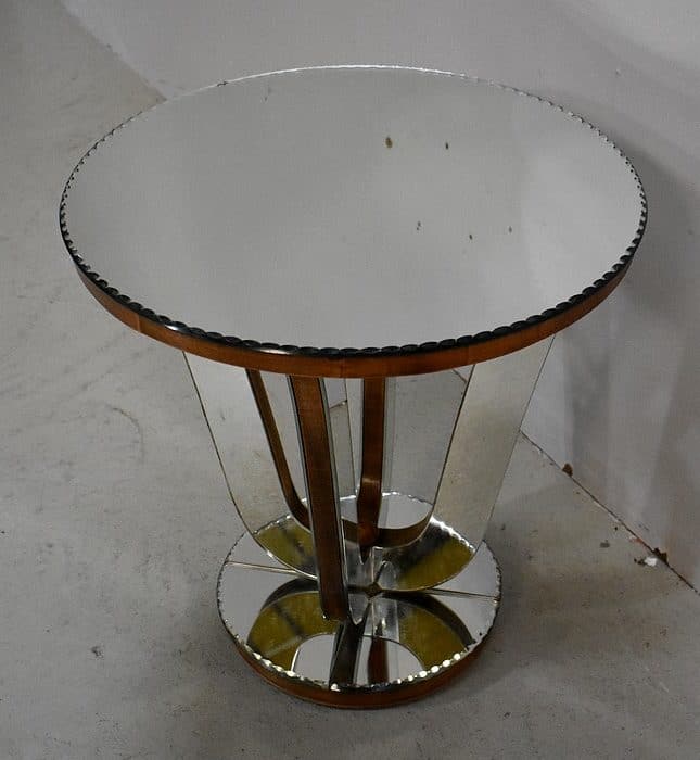 Petite Table Guéridon, avec ossature en Noyer presque intégralement recouverte de Miroirs.