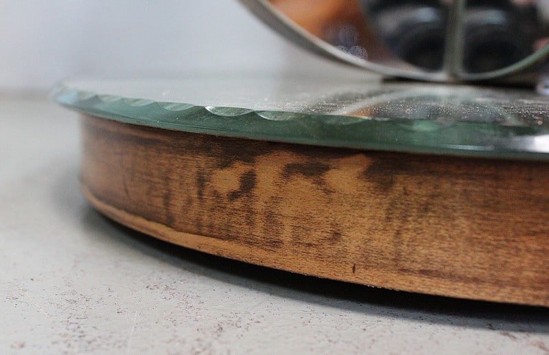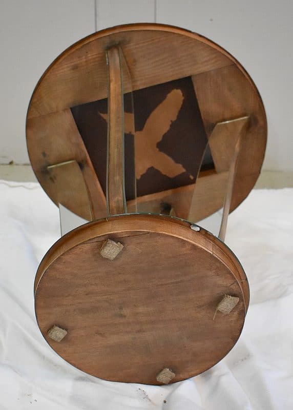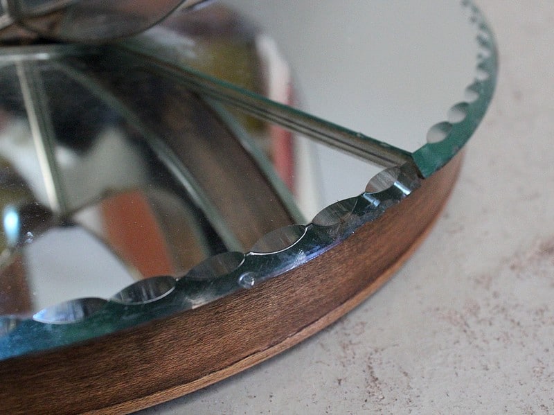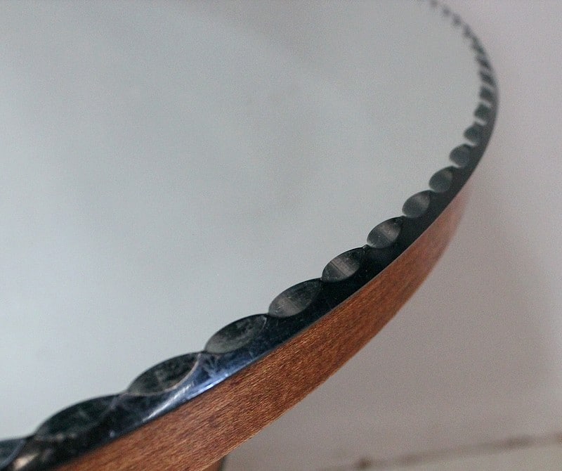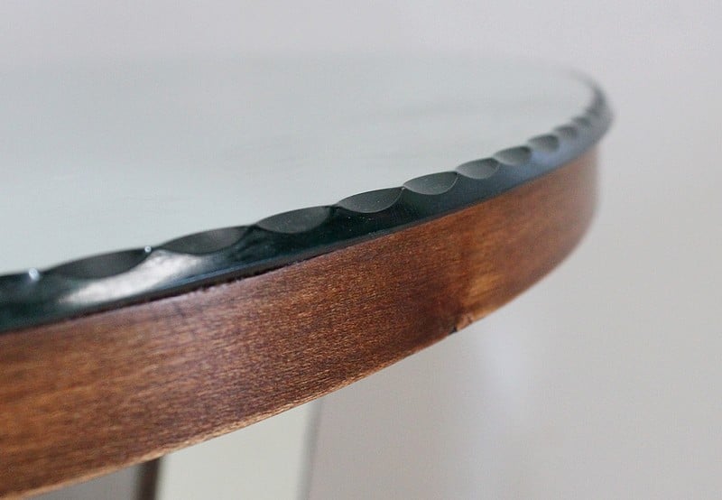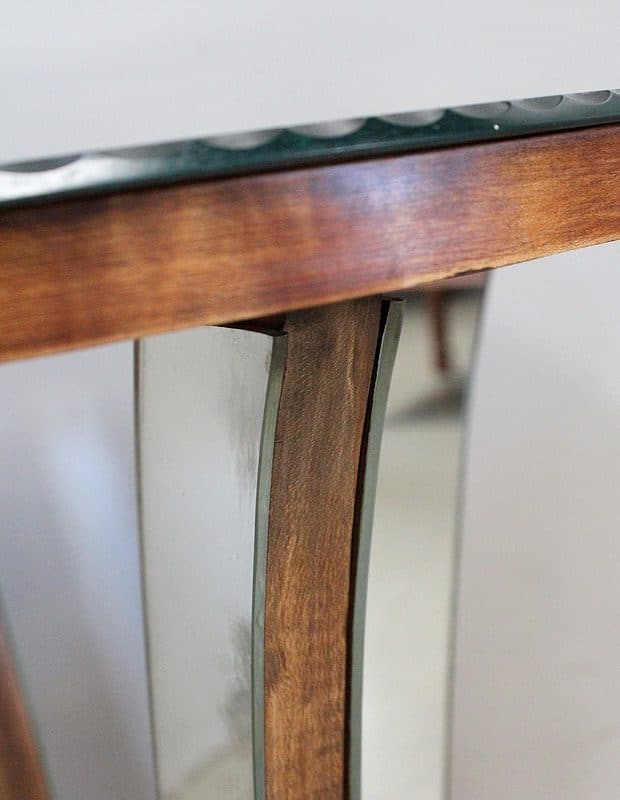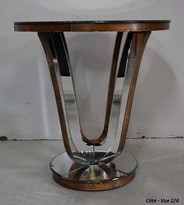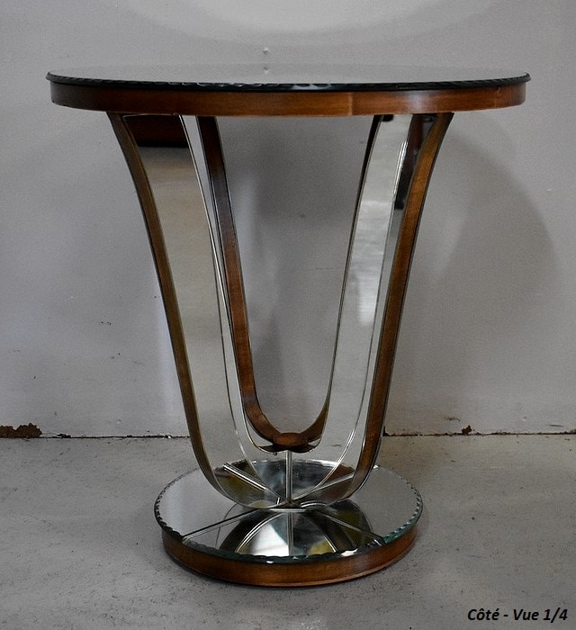 Petite Table Guéridon, avec ossature en Noyer presque intégralement recouverte de Miroirs.