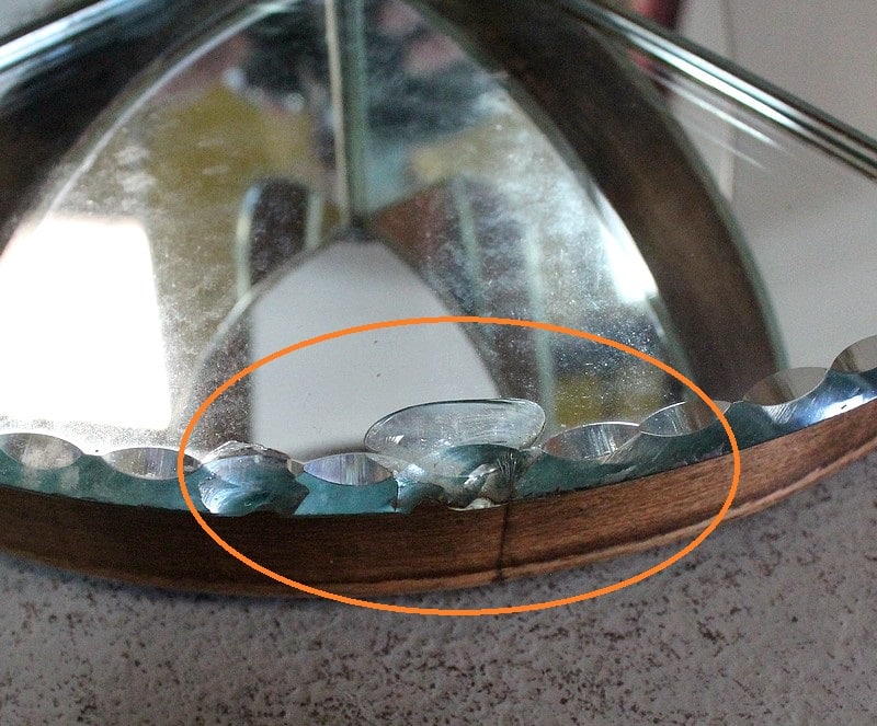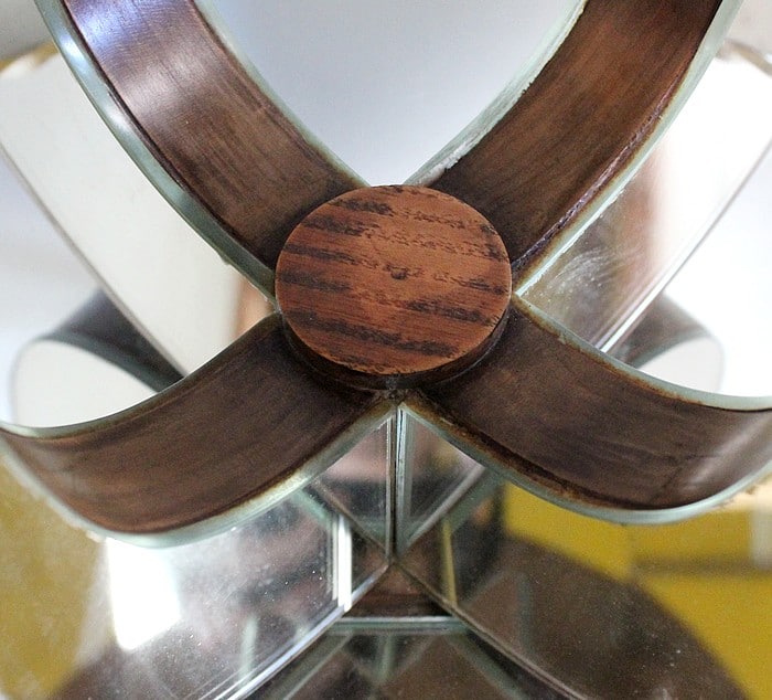 Il est soutenu par quatre pieds incurvés, habillés de Miroirs sur leurs tranches. Ces supports se rejoignent sur un socle Circulaire, composé de quatre quarts de Glace Festonnée en bordure.